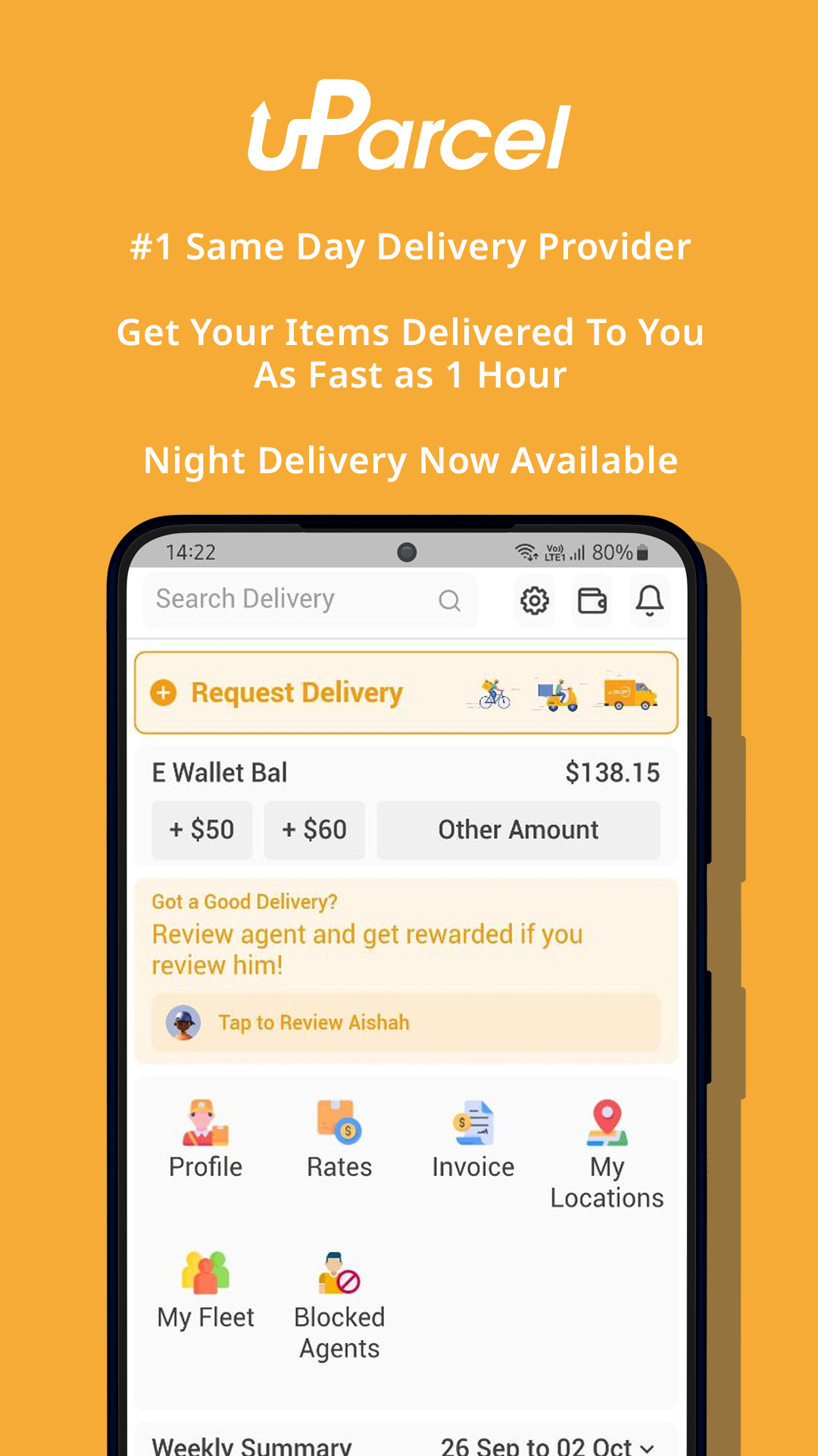 uParcel is your easiest way to deliver. We provide 24/7 courier service anywhere in Singapore. By using location based identification, the best delivery agent will be assigned to pick up your parcel and deliver them to their destination from just $8 per delivery without any minimum. You will get live tracking of the delivery and receive notifications on its status. Furthermore, you can contact the delivery agent directly to get updates.