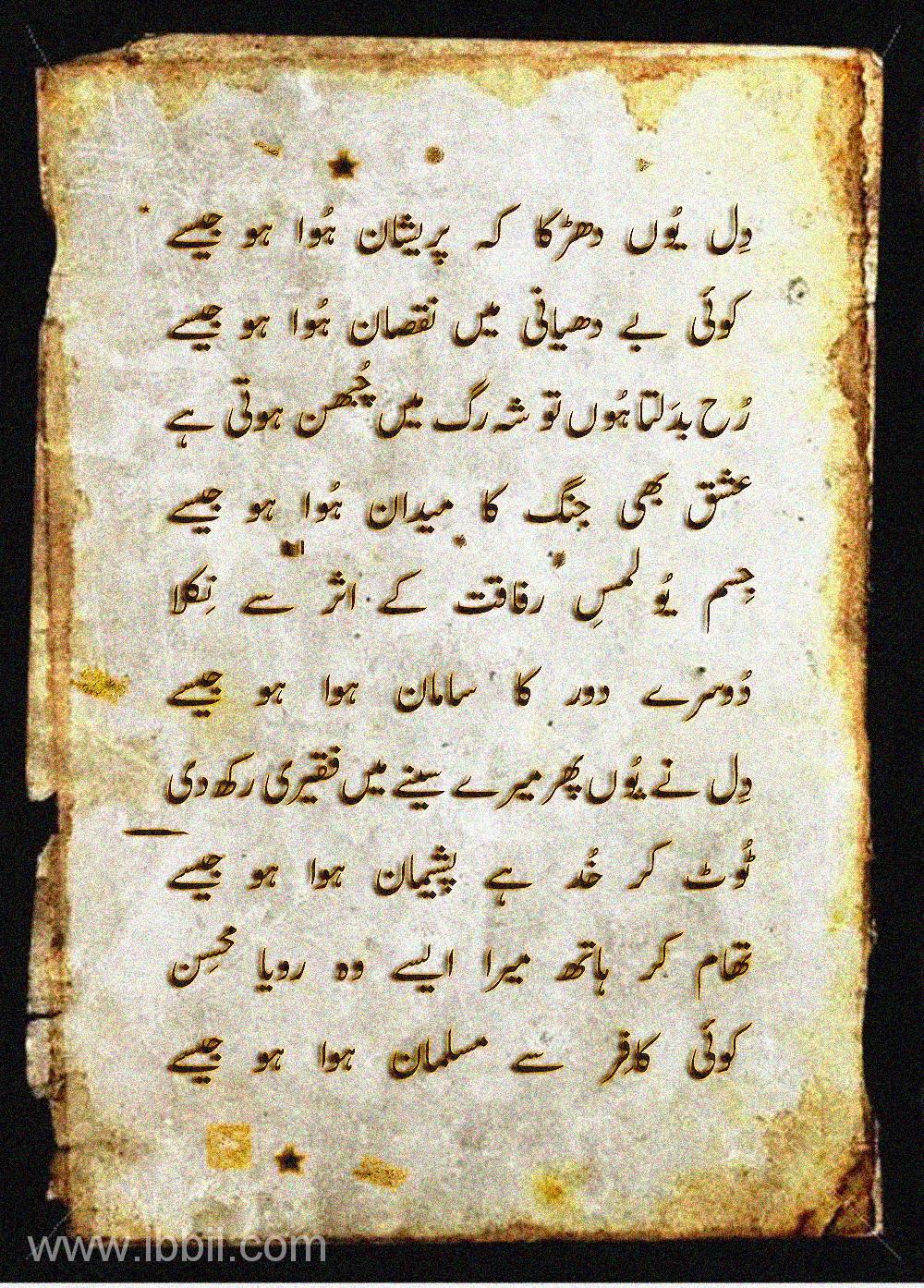 In this App find a selection of Urdu Poetry & Ghazals by famous Pakistani and Indian new poets. Wasi Shah, Parveen Shakir, Habib Jalib, Safeer Ahmed, Iftikhar Arif, Farhat Abbas Shah, Obaid Ullah Aleem, Ahmed Hassan, Amir Bin Ali, Anees Hasan, Ayub Khawar, Farzana Naina, Muneer Niazi, Shair Ali Ji, Naz and more. Urdu poetry is a rich tradition of poetry and has many different forms which have basically originated from Arabic and from Persian language. Today, it is an important part of the cultures of Pakistan and India. Literary figures as far back as Amir Khusro (1253-1325 CE) and Kabir (1440–1518 CE) inspired later Urdu poets, and served as intellectual and linguistic sources. Meer, Dard, Ghalib, Anees, Dabeer, Iqbal, Zauq, Josh, Jigar, Faiz, Firaq, Ahmad Nadeem Qasmi, Shair, Mohsin and Faraz are among the greatest poets of Urdu. The tradition is centered in the South Asia.