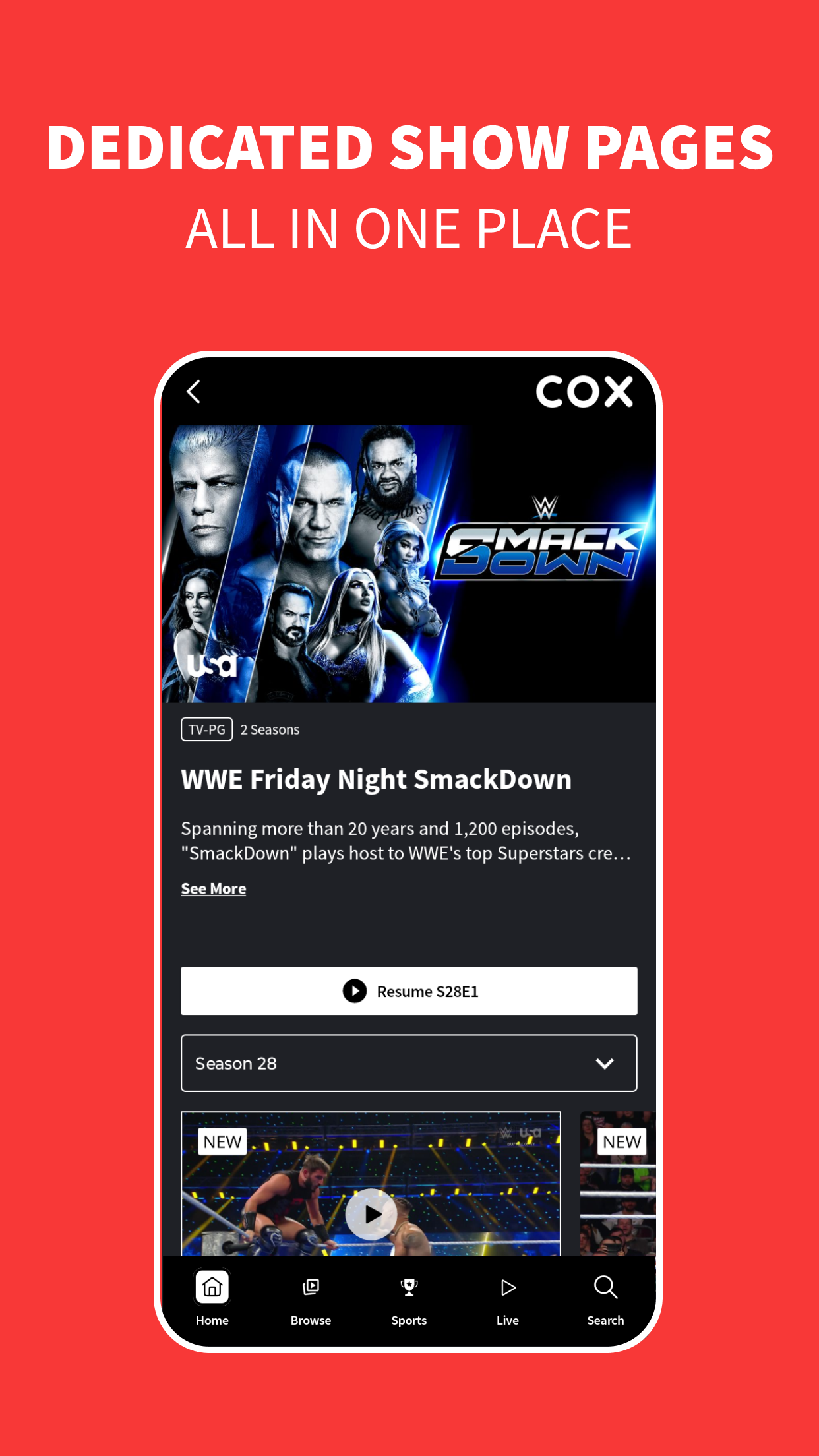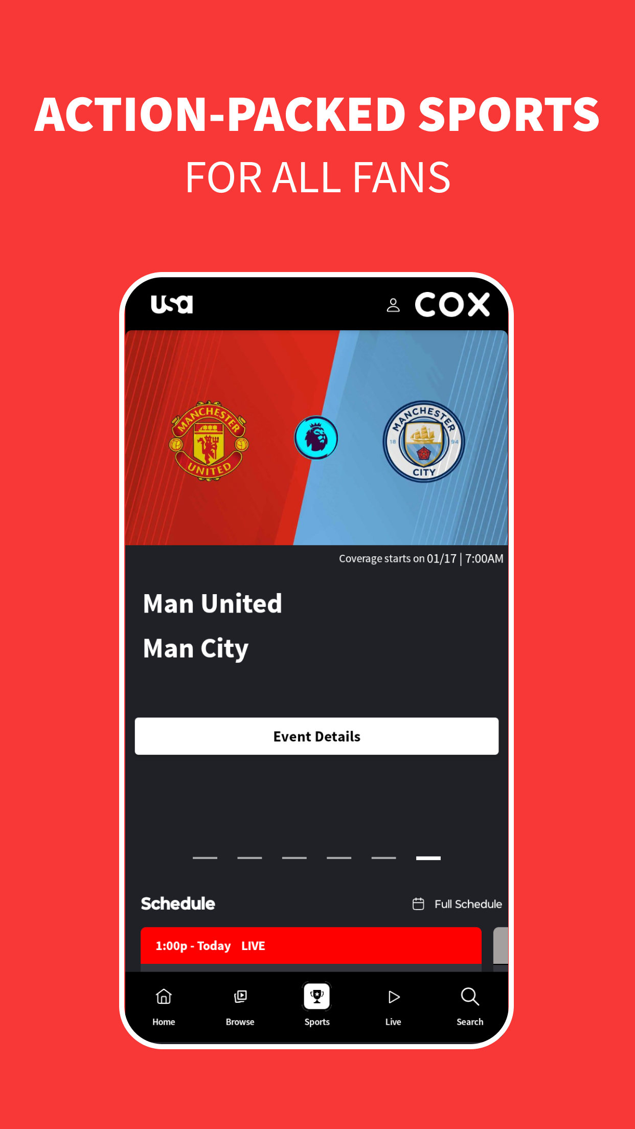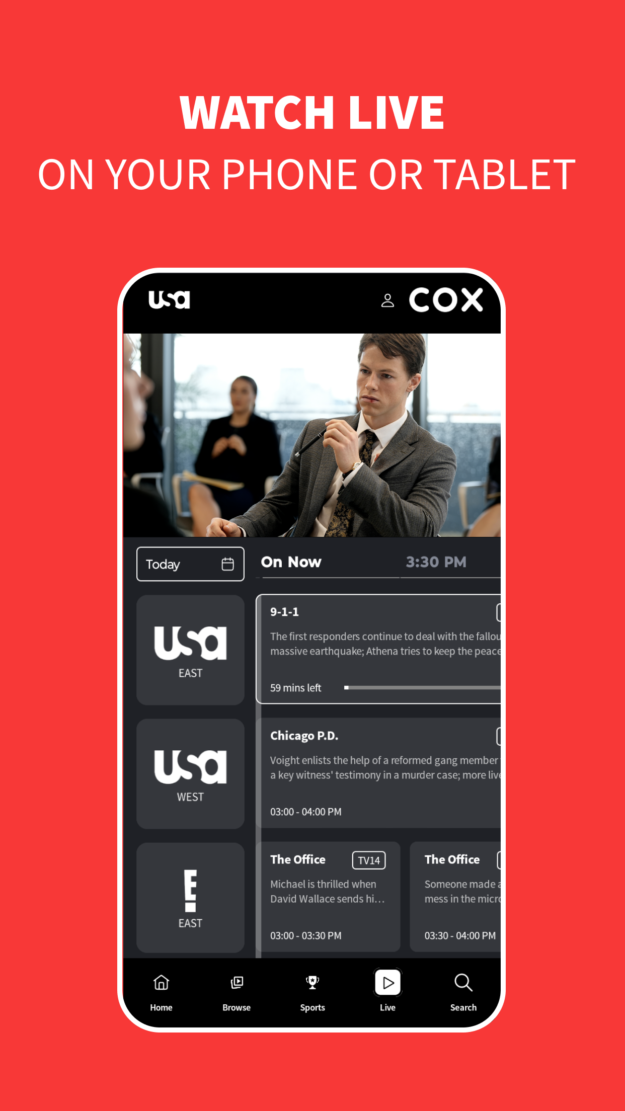 Overview o The USA Network app is the best place to catch up on the most recent season of your favorite shows, watch live TV, keep up with your favorite sports, and stream movies and past season content! o Download the USA Network app to watch WWE Smackdown, the PGA TOUR and LPGA TOUR, Premier League, NASCAR, the WNBA, The Rainmaker, Everything on the Menu with Braun Strowman, AND MUCH MORE! o Get started by signing in with your TV subscription (cable, satellite, or digital). The USA Network app supports most TV providers, including DirecTV, Spectrum, Xfinity, Dish, and AT&T. App Features Watch Your Way o Watch the latest episodes of new USA Network shows the day after they air on TV. o Live stream and schedule available 24/7 when signed in with your TV provider. Explore Versant Content o Access to on-demand content from across the Versant family of networks (including USA, SYFY, E!, Oxygen, MSNOW, CNBC, and Golf Channel). o Don't miss a second of the Premier League, the WNBA, A10 hoops, the PGA and LPGA Tours, and NASCAR! o Live stream your favorite Versant networks within the app. o Dedicated page for each network showcasing the hottest series. o Stream recent and throwback favorites, like Law & Order: SVU, Chicago Fire, Chicago P.D., and Chicago Med. o Filter shows by network and genre while browsing. TV Provider Access o Sign in with your TV subscription to gain access to the entire catalog of VOD and Live content. Availability Notice o Versant's family of networks are only available to stream in the US and US territories. o Those outside the US will be unable to watch full episodes or live TV. o If you're traveling, you'll regain full access as soon as you return to the US. Comments or Questions o Please fill out our contact support form at https://help.versantmedia.com/s/contactsupport for assistance. o Please note: Use of the app is limited to the United States and its territories. Video is accessible via 3G, 4G, LTE, and Wi-Fi networks. Data charges may apply. o Privacy Policy: https://www.versantprivacy.com/privacy o Your Privacy Choices: https://www.versantprivacy.com/privacy/cookies o CA Notice: https://www.versantprivacy.com/privacy/california-consumer-privacy- act