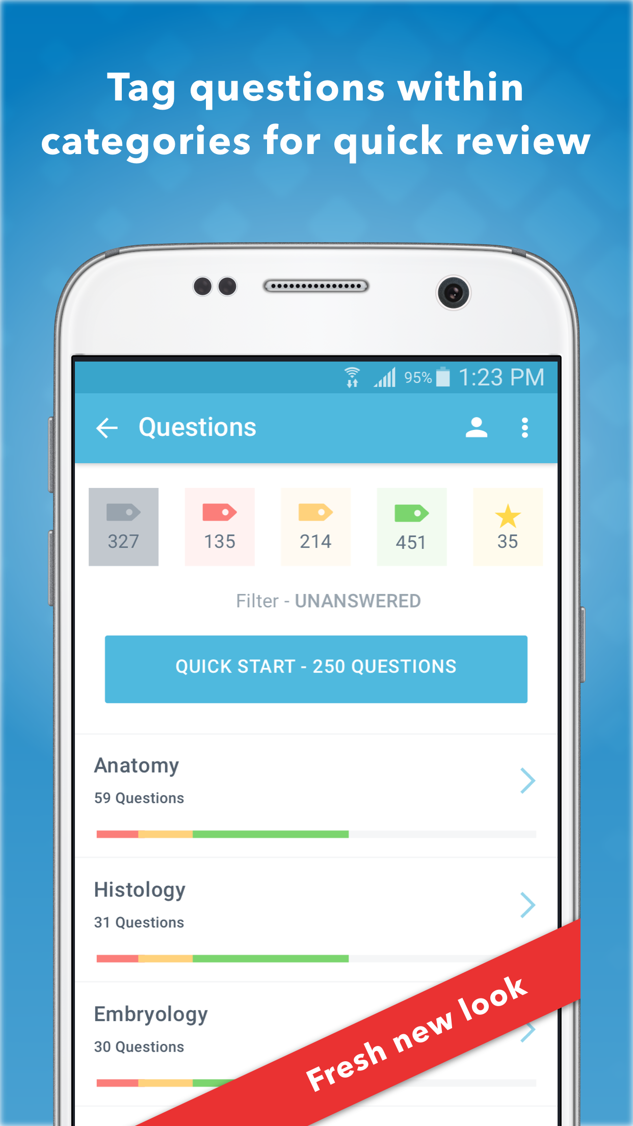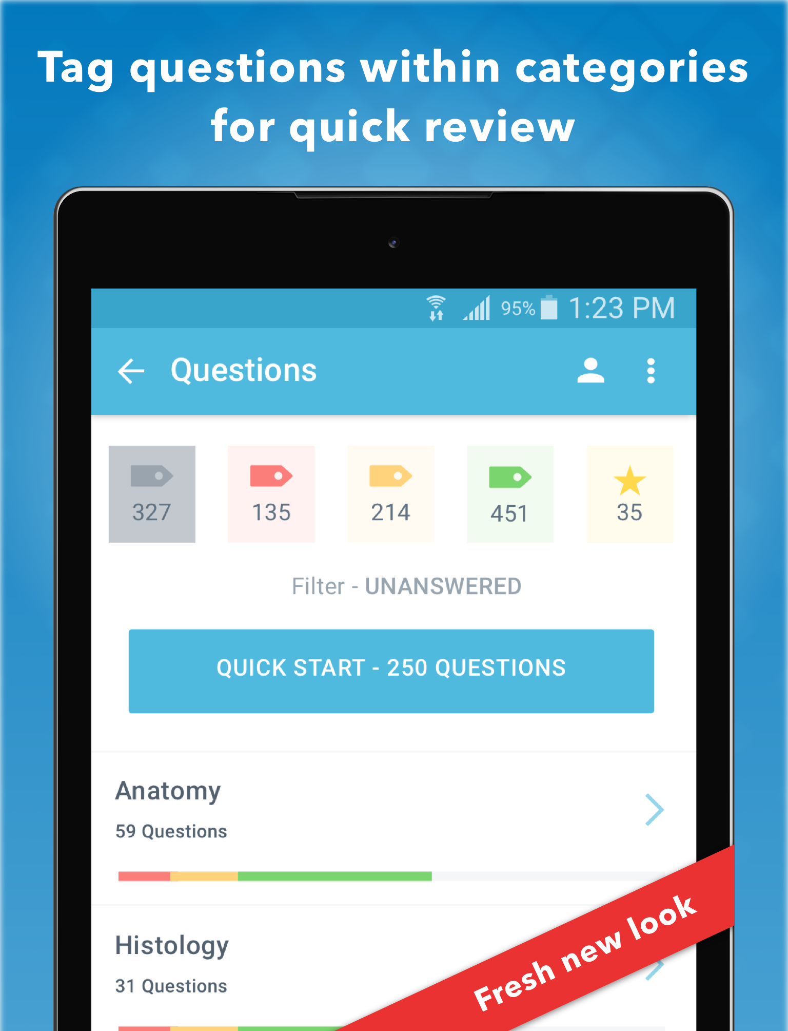 Test your overall knowledge by answering randomly generated questions from each category or target areas of weakness by focusing on a specific category.