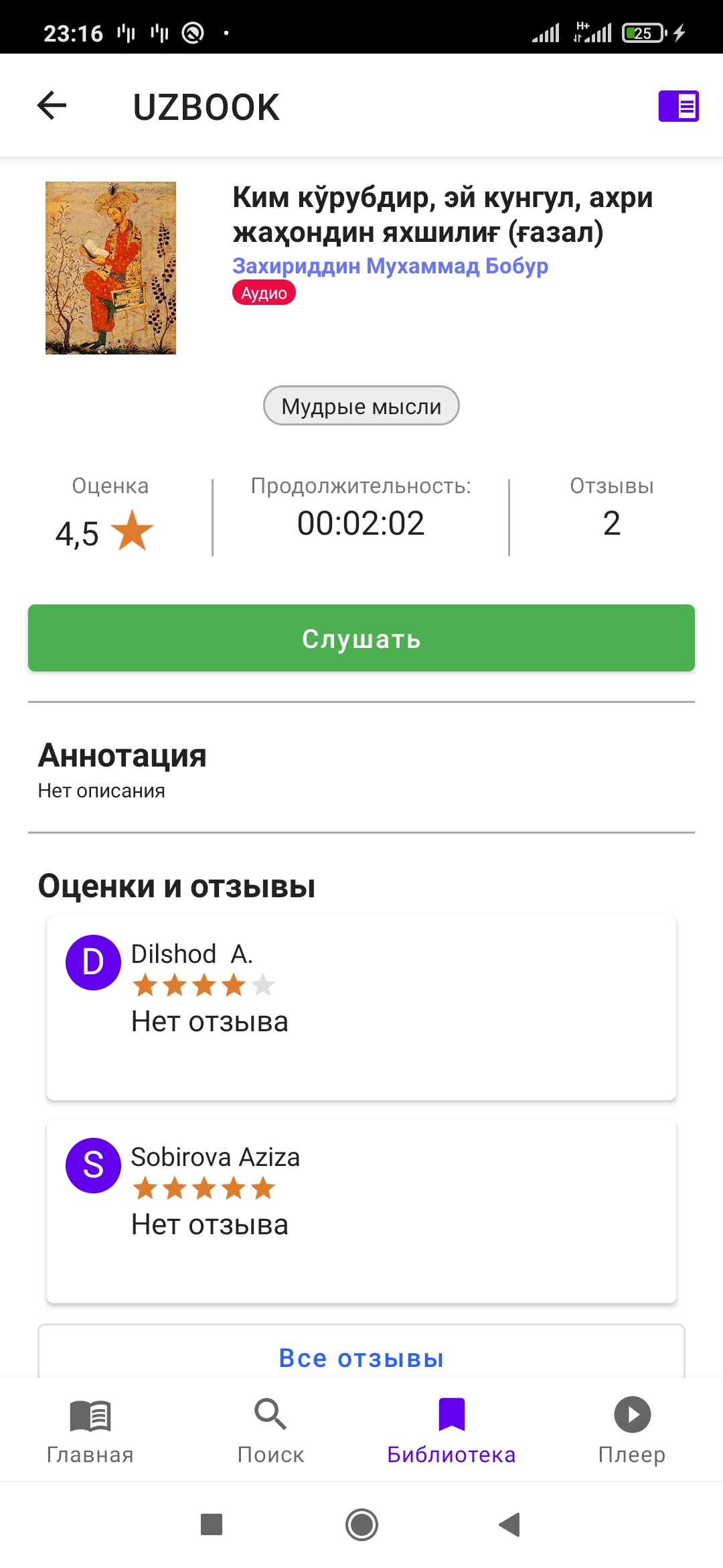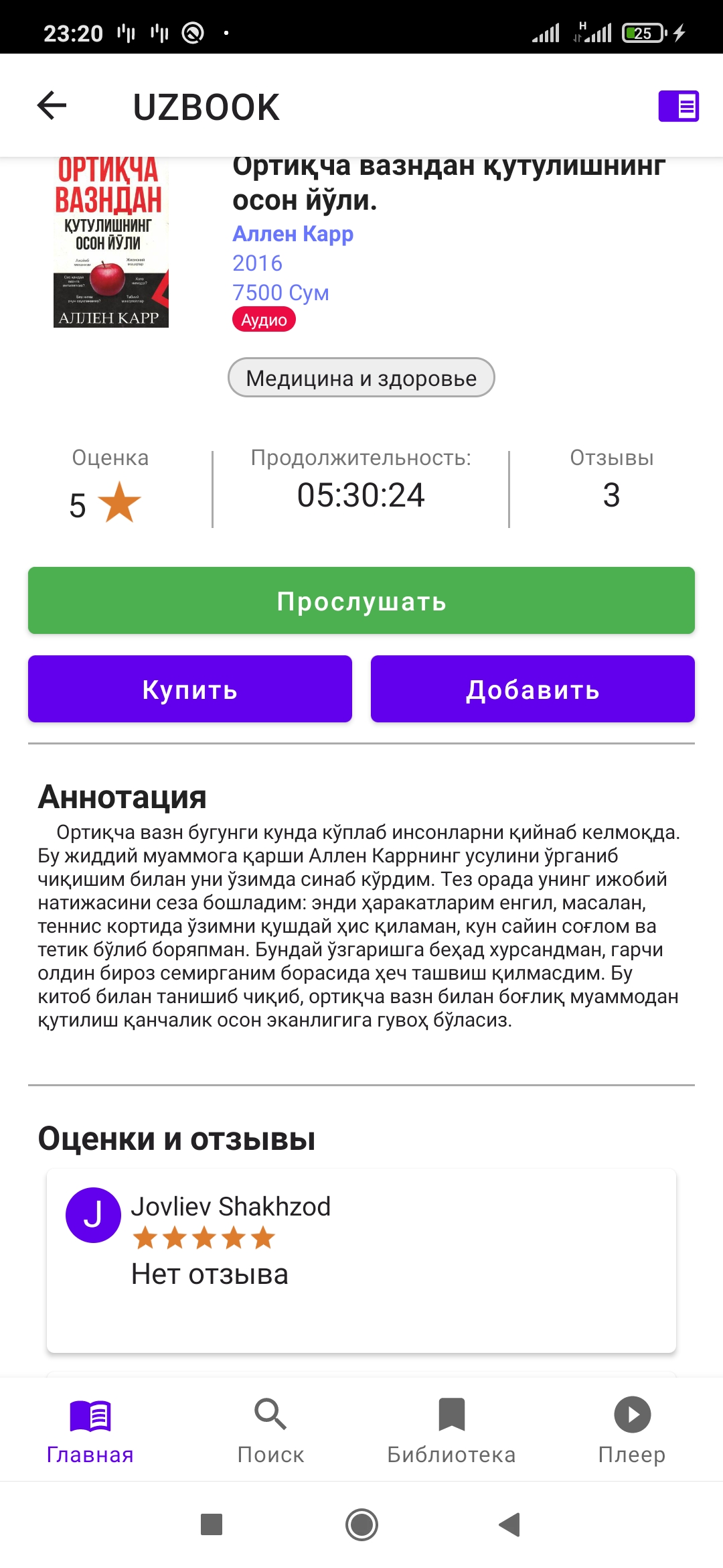 UZbook - a unique project that provides the opportunity to listen to audiobooks. In Central Asia today is the first developed project, which offers to our dear readers to the possibility of on-line download audiobooks. The most interesting - in UZbook audiobooks are in Uzbek, Russian and English languages, from the most famous and popular authors. UZbook mobile application is easy and convenient to use in different situations: both in private and public transport, during physical exercise before going to bed (especially to listen to fairy tales for children), while enjoying the outdoors, even during long waits in queues. In this app you'll find audiobooks of different subjects and genre: business, psychology, novels and stories, children's stories, detective stories, journalism, novels, historical works, and so on. UZbook, first of all, provides an opportunity for our compatriots abroad to get acquainted with the works of Uzbek authors, so that they always feel a connection with their homeland - with Uzbekistan. This application is also very convenient because your personal library is always at hand, you can always dive into the world of stories, novels and short stories by authors such as Abdullah encoded Pirimkul encoded Shukur Kholmirzaev, Poyon Ravshanov, Tohir Malik Khudoiberdi Tuhtaboev, Mengliboy Murodov , Odile Okubov and many others. We hope that our application will help the younger generation to learn more history of Uzbekistan, traditions and culture of our people through literary works.