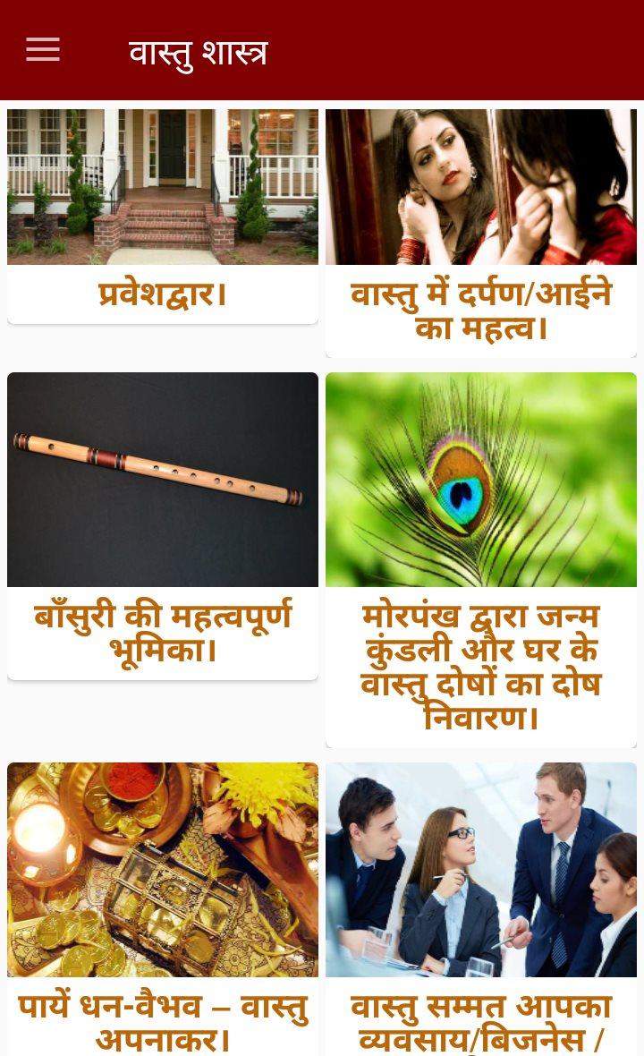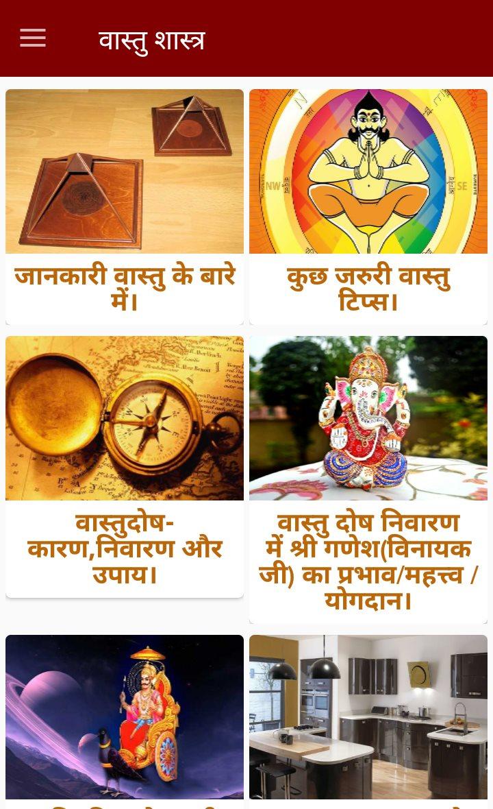Vastu shastra tips app has the following categories of contents:vastu shastra,vastu for home,vastu tips in hindi, astrology, money plant, vastu shastra tips in hindi, how to design your home according to vastu, vastu dosh ka nivaran kaise karen, vastu tips for home, vastu tips for business, vastu tips for office, vastu tips for marriage, cure disease with vastu shastra, interior design according to vastu,