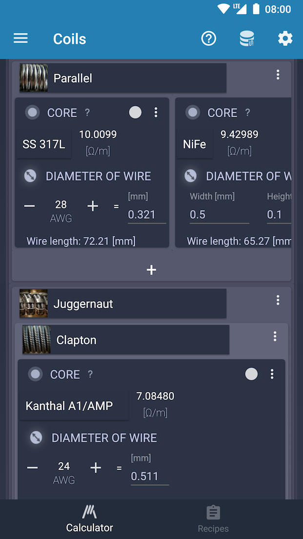Vape Tool saves your time and money, by making only perfect Coils and E-Liquids Would you like to know resistance of Coil you are going to build ? Would you like to know how to prepare your own E-Liquid ? Would you like to know min. resistance and Max Vape Current for every 18650 battery ? Vape Tool Pro is huge arsenal for every vaper. User friendly design. For beginners and advanced vapers. Pro Version Features: -More coil types in Coil Calculator (15 coil types at the moment) -Custom coil type - where you can build almost every possible coil type -Advanced Sweet Spot Finder -Consuming flavors feature (Tracking flavors amount left) -Wires lobby -Wires length needed to build coil -E-Juice Pie chart -Min. Resistance fer batteries -Batteries Chart -Fast Ohm Law calculator widget -Custom number of core strands in Fused Clapton builds -I'm still working on new features. -No Ads -Steam Engine feature -Support project :) Coil Calculator/Coil Wrapping: help you calculate perfect coils, number for wraps or resistance based on wraps ! Works similar to Steam Engine it support multi-coil setups, types like Clapton Coil, Parallel Coil, Twisted Coil, Ribbon Wire and diffrent wire materials Sweet Spot Finder: Shows you the wattage sweet spot for your coil setup. Liquid Blender Calculator: will help you make and calculate e-liquids and calculate thier final cost. You can save recipes and share with your friends. FAQ Articles: read about E-Ciggaretes, MODs, BOXs, Coil Builds, Mechanical Mods, E-Liquids, Atomizers, Accessories etc. Battery Life: allows you to calculate estimated runtime on your mechanical mods and estimated puffs Ohm Law calculator: based on ohm law, you will be able to calculate Voltage [V], Resistance [Ω], Current [A], Power [W] AWG converter: provide easy conversion from AWG to mm