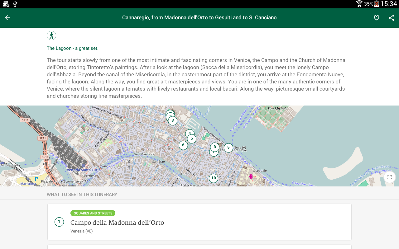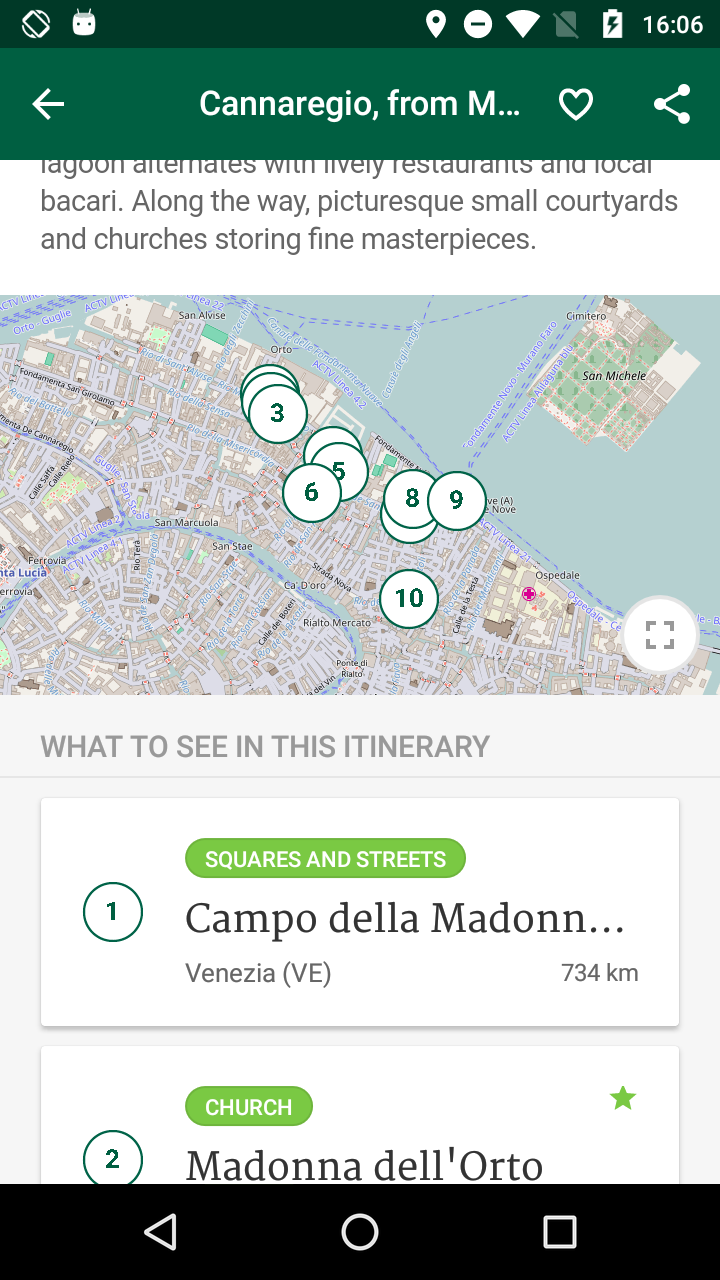 21 tours to discover the city and its territory, palaces, museums, churches, places not to be missed, Palazzo Ducale, Piazza S. Marco, S. Giorgio Maggiore, the Grand Canal, the Rialto Bridge and then again the enchanting islands of glass and lace, Burano, Murano, Torcello, and other small islands of the Lagoon. Each tour with photos, an important selection of points of interest geolocalized on the map