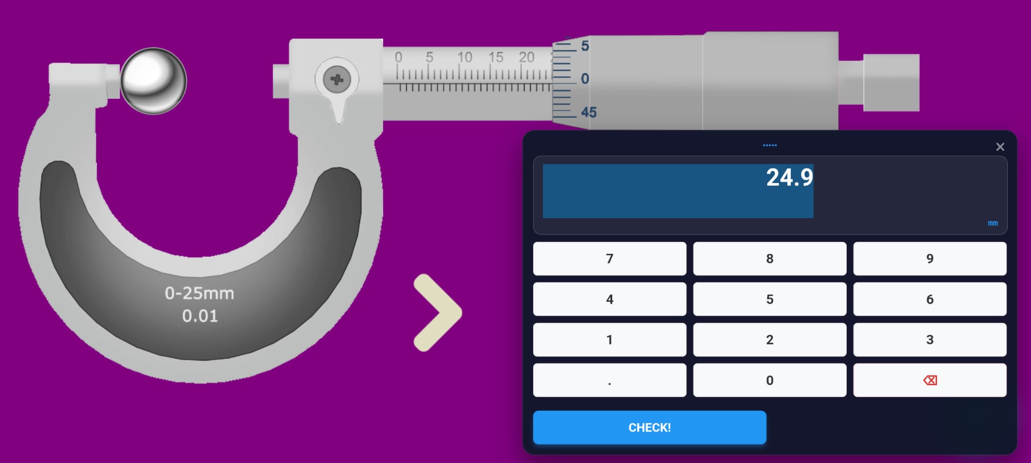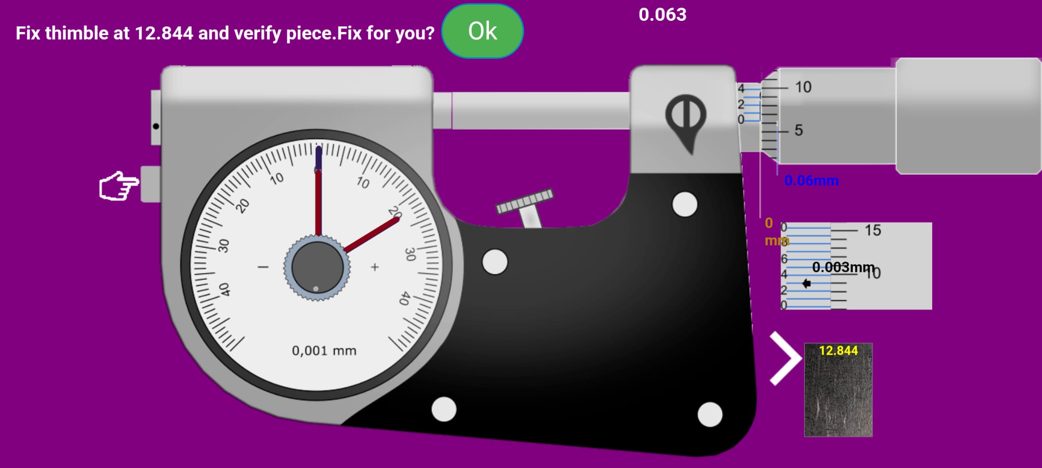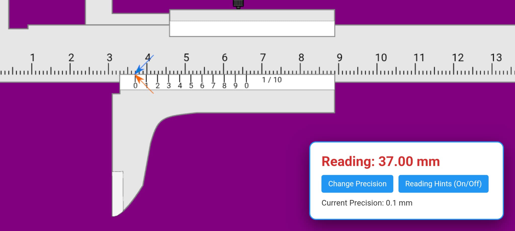 App contains virtual measurement tools that the user can use both to learn how to measure and practice. The user receives feedback from the application, and knows whether reading the measured value correctly or not The application simulates: - a vernier caliper with the 1/10, 1 / 20,1 / 50 precision and shows the user how to read the measured value. - vernier caliper 1/128" - Micrometer 0-25mm , accuracy 0,01; -Dial caliper; , accuracy 0,02; - Micrometer 0,01, - external dial instrument -Dial indicator The application is educational, not used for effective measurement. It has a very similar interface to real instruments, and is very easy to use.