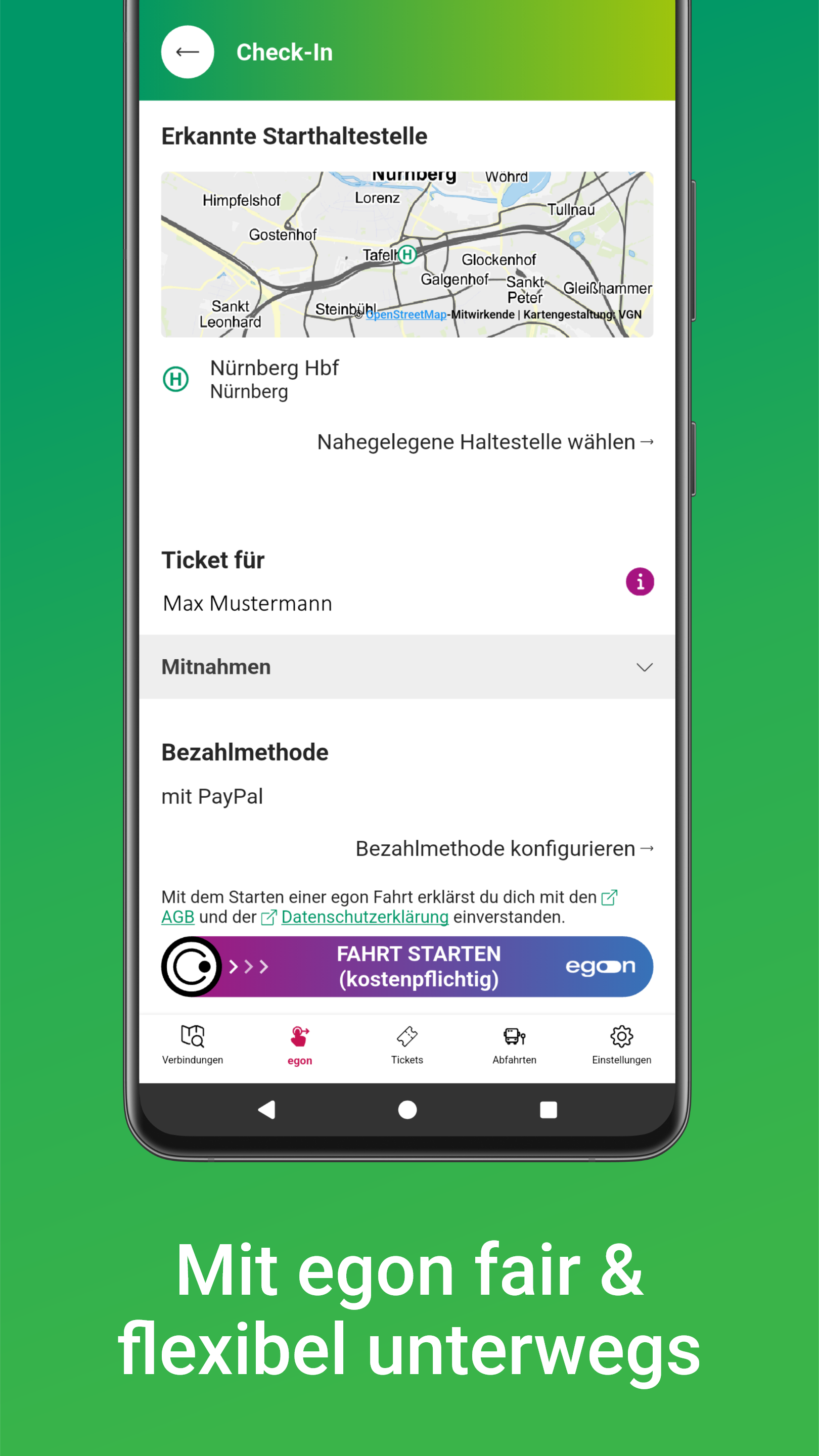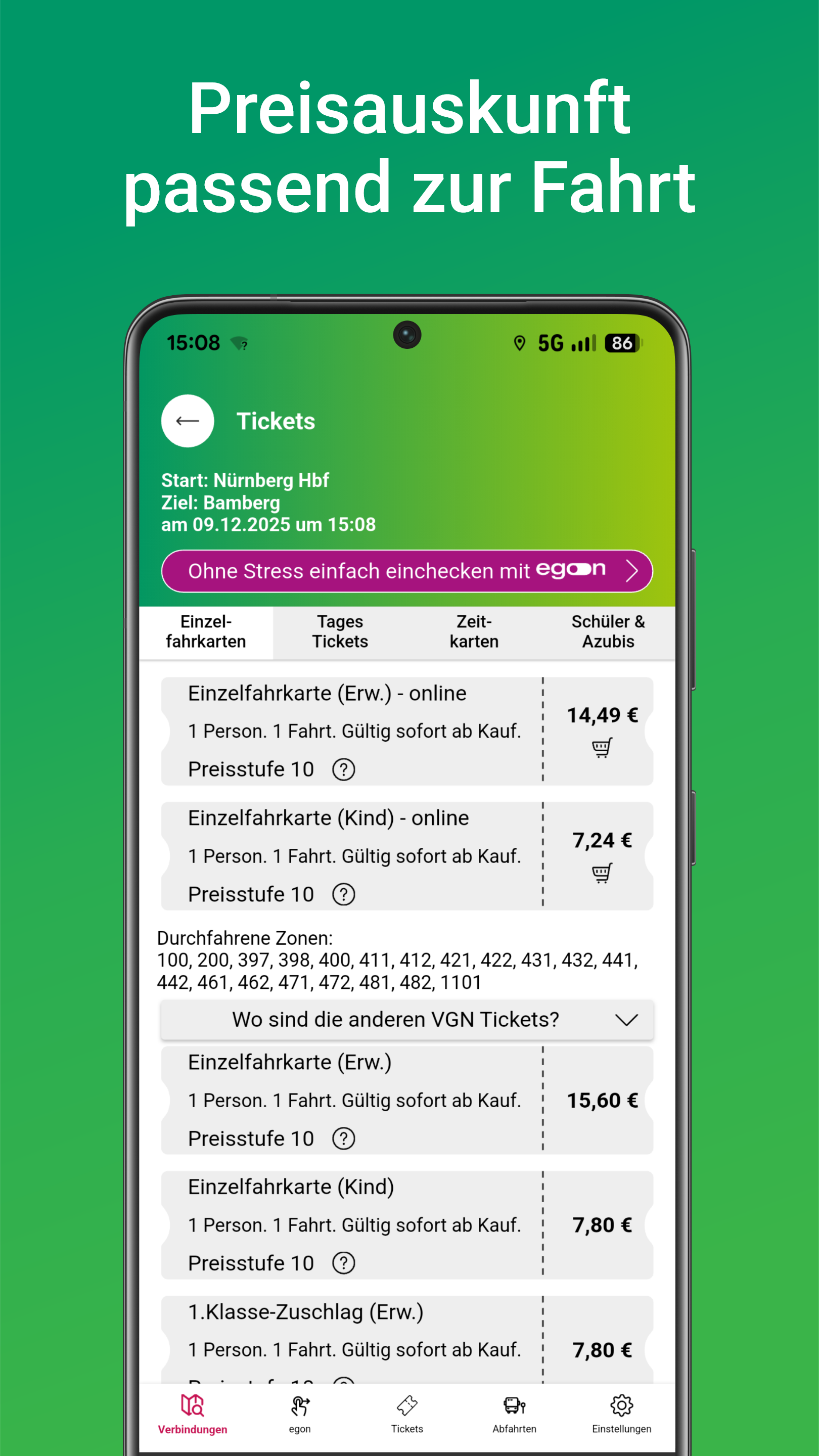 With the VGN eTariff egon, you only pay for what you actually travel – with a daily base fare, per-kilometer billing, and three revenue-based discount levels. Simply check in to start your journey and check out at the end.