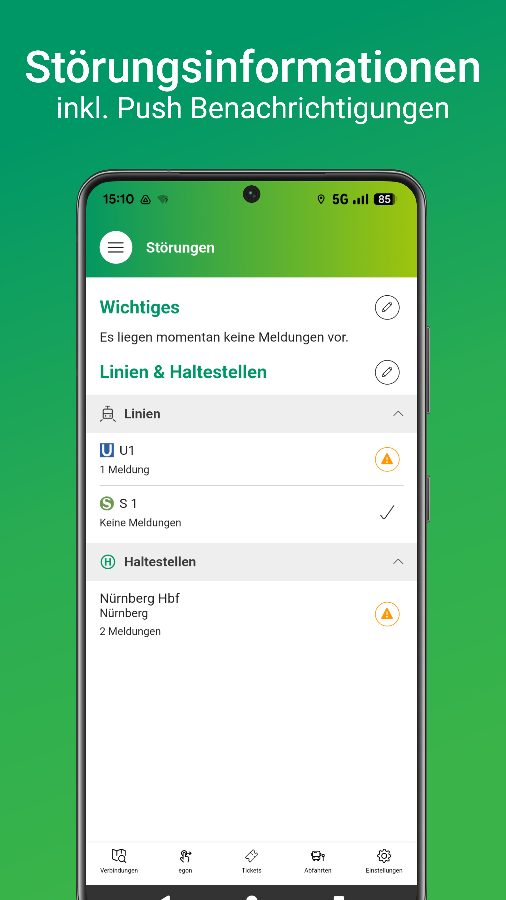 Whether S-Bahn, R-Bahn, U-Bahn, tram, or bus – with the VGN Timetable & Tickets app, you always have the perfect companion in Nuremberg and the surrounding region. Get quick and easy connection information, current departure times, and platform change updates. Thanks to real-time information, you'll always be up-to-date, even with last-minute changes or disruptions. Even by car or bicycle, you can easily navigate using the Park & Ride routes and cycling directions.