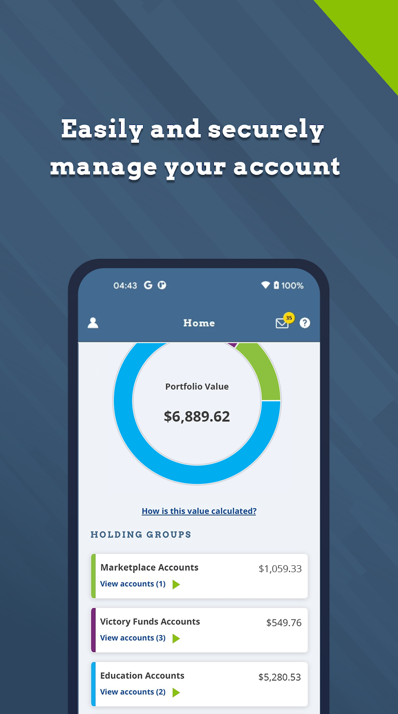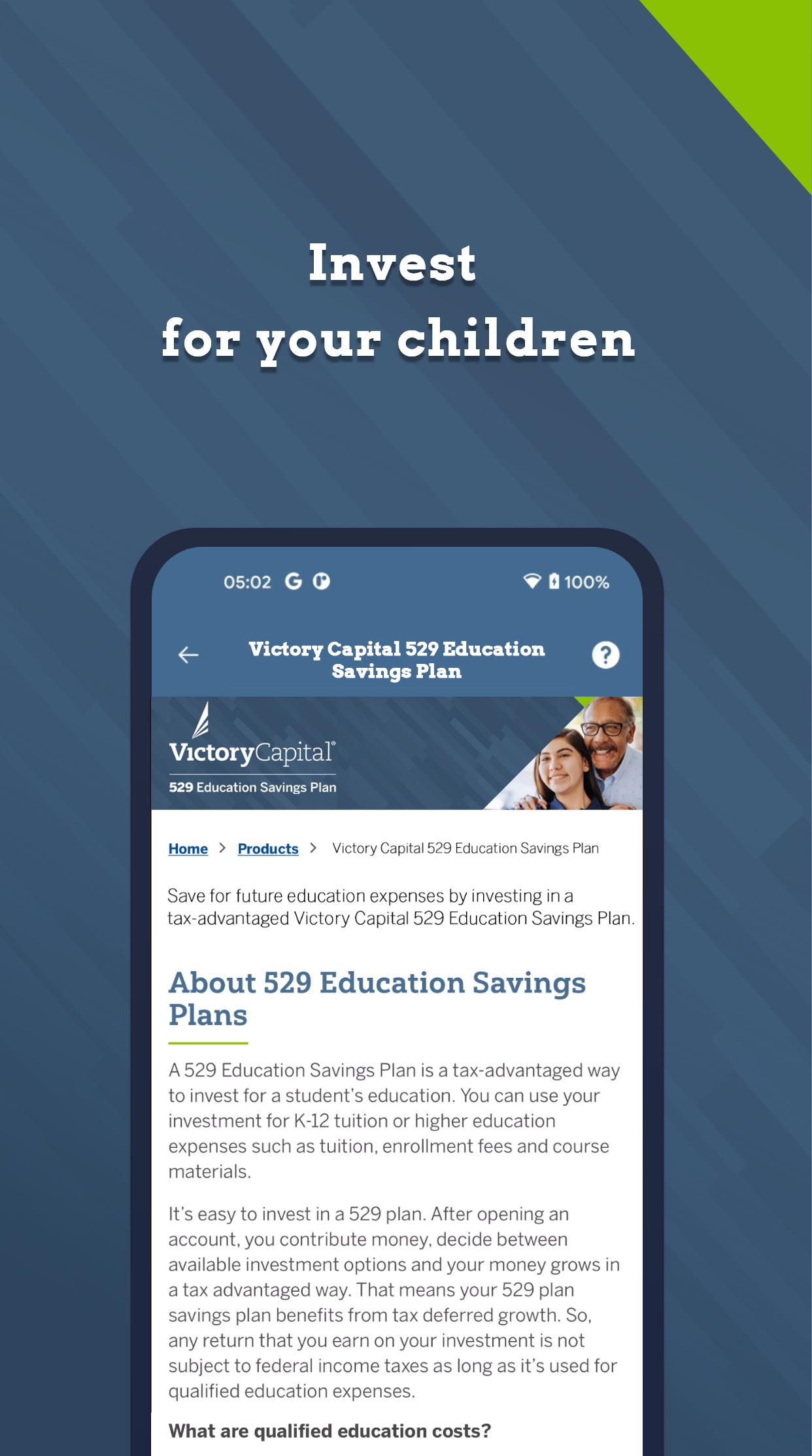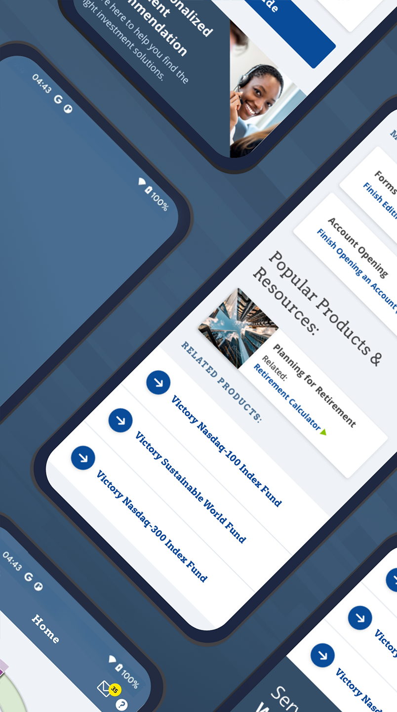 At Victory Capital, every investor journey, every financial situation, and every goal, regardless of size, is important to us. Choose from mutual funds, ETFs and a 529 Education Savings Plan managed by Victory Capital. Now, introducing Marketplace, our new brokerage platform, which lets you invest in Victory Capital products plus thousands of individual stocks and mutual funds and ETFs from other providers. Our mobile app makes it easy to manage your investments and make trades all in one place! Download the Victory Capital app to easily and securely: - Open and view accounts - Make trades - Research investment options - Get an investment recommendation - Track investment performance, account activity and balances - Retrieve documents - Access investment insights and easy-to-use planning tools Get started today by consolidating your investments with us, and you may earn an investment bonus. Plus, you’ll pay $0 commissions for most online trades*. Whether you are investing for personal life goals, like buying a home or a new car, your dream retirement lifestyle, supporting a loved one’s education, or even to build your family legacy, Victory Capital offers a variety of investment products that may be suitable for your financial objectives. *You may be charged a transaction fee for on-line trades of certain third-party mutual funds. Mutual funds and ETFs charge management fees and other expenses, including up-front sales charges. Victory Funds and the Victory Capital 529 Education Savings Plan (Plan) are distributed, and brokerage services provided, by Victory Capital Services, Inc. (VCS).