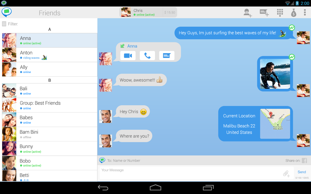 • Also send texts (SMS) and Instant Messages (IM). The FriendCaller messenger supports Group Messaging on your Android mobiles and tablets with family and friends, around the world.