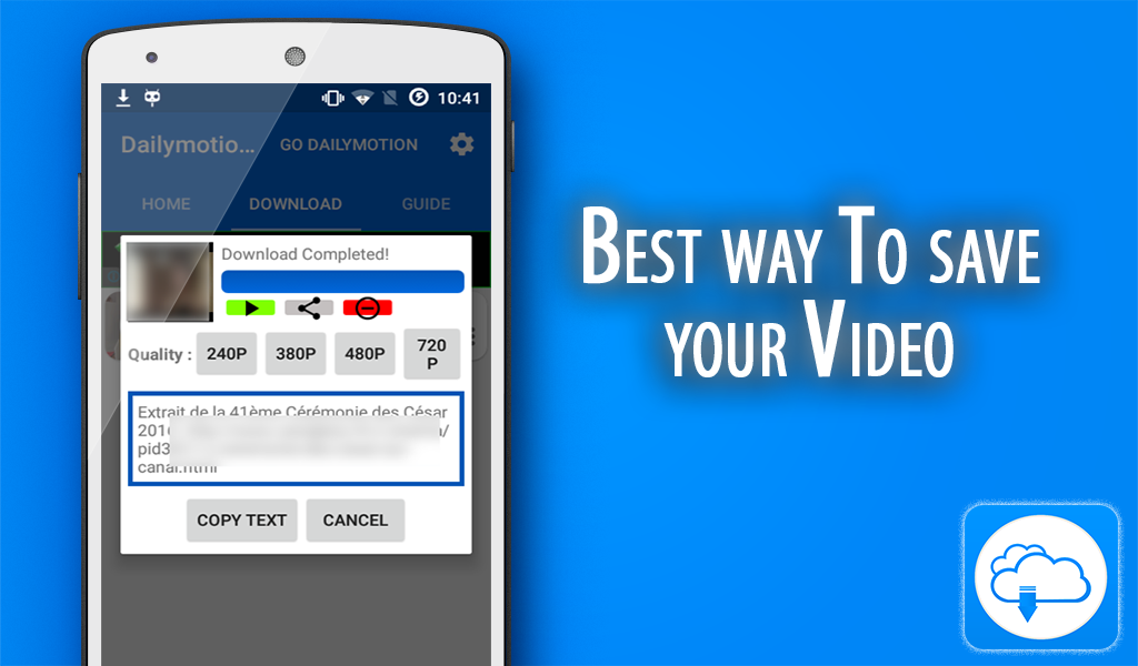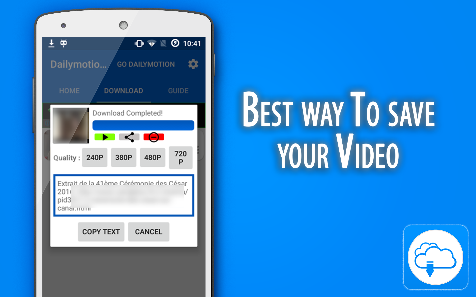 Go DailyMotion app and click video you want to download wait video play and hit share button . than click see all. and Choose DailyMotion Downloader from sharing options when you done this step . than you will be able to save you video with any Quality you want. when video completed downloaded you can manage them in tab Called "DOWNLOAD". Thats all