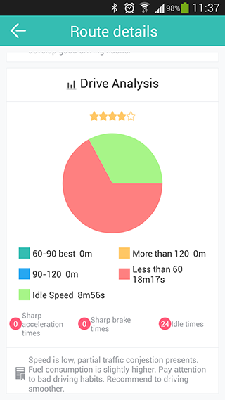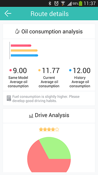 Driving grade: fuel consumption grade, driving level grade and other multiple evaluation, you can share with your friends via Wechat and Webo;