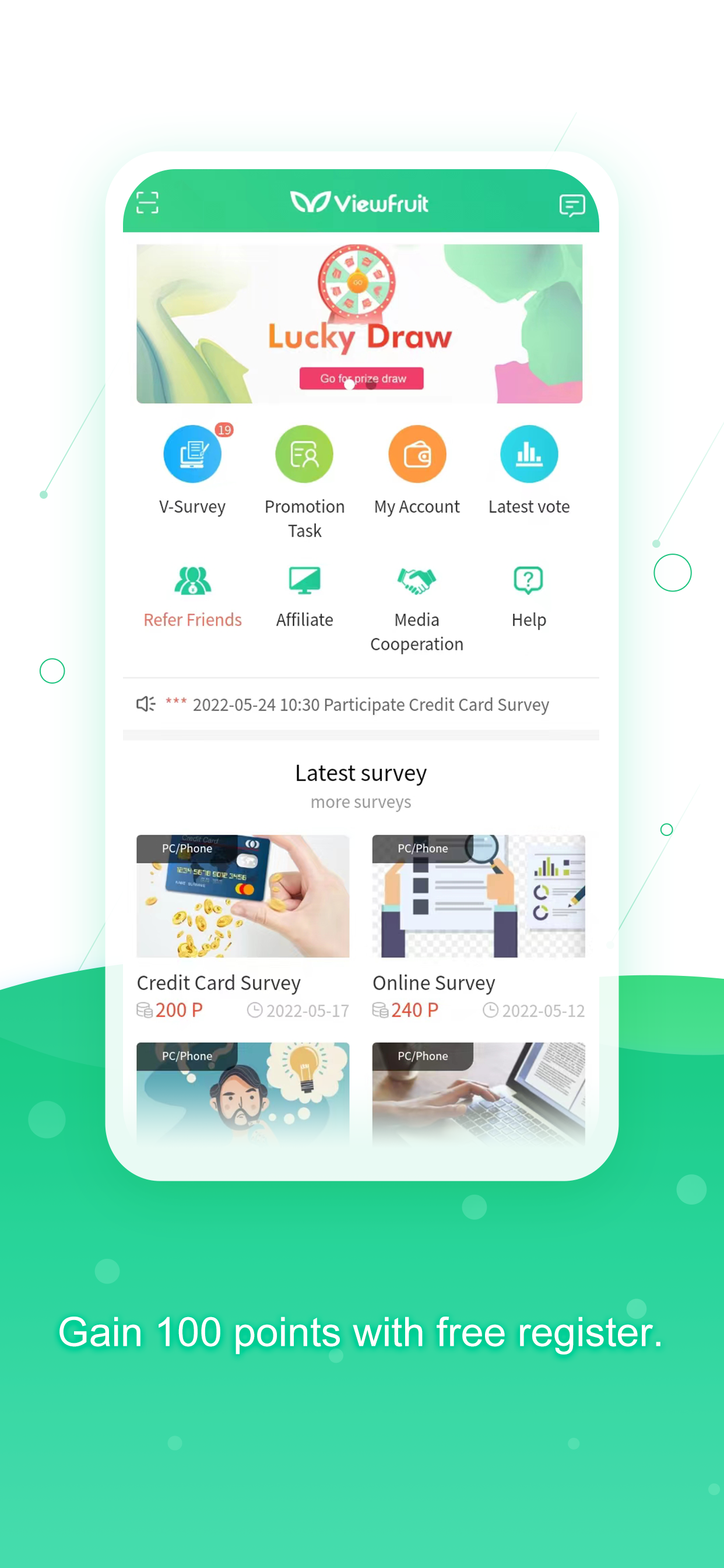ViewFruit is a free survey app that allows you to earn real cash for completing surveys. Participating in the survey, users not only acquire rewards but also can share opinions and help to improve or influence the world. We hope you enjoy the experience in ViewFruit!