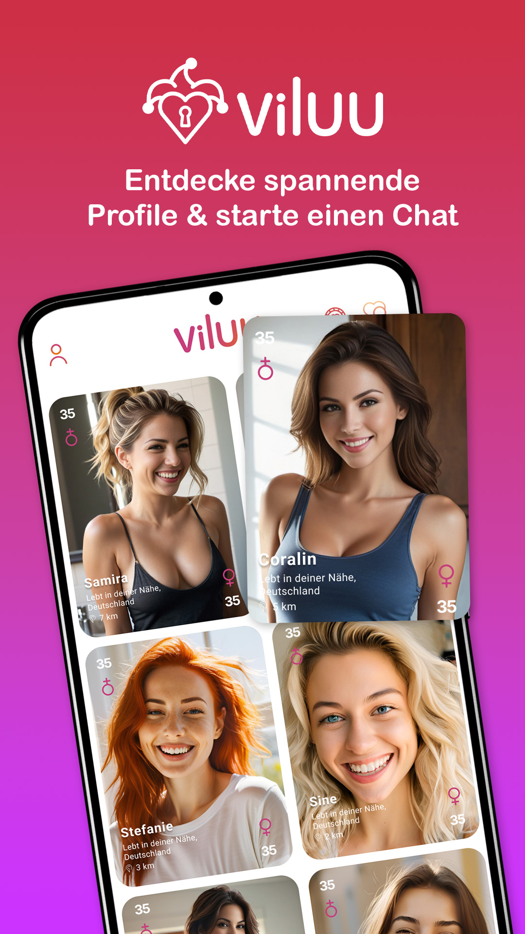 Join a the unique online dating & flirt app!Meet real people, make new friends and find interesting singles in your area. With Viluu you will break the ice in the most fun way possible. Take your dating game to the next level and create a single profile today in the Viluu dating app. ❤️🔥 Match, Flirt, Chat and have fun. Sounds a bit cliche? Let us add a touch of fun to it. After all, online dating should not be so serious. Our quiz match format allows you to choose your next flirt partner based on a question that you answer in the dating app. If you answer correctly, voilà it's a match! If you are looking for a serious relationship or something casual, take your chance to flirt, chat and date and meet new people in your area that may be interested in you. Let the Viluu dating app be your cupid and find the perfect match. 💘 ✔ Join the fun: Quick and easy set up of your single profile in the Viluu dating app, introduce yourself to other singles and potential matches and let us be your cupid for your next flirt! ✔ Local dating in your area or finding friends in a new place: Flirt, chat and date exciting people by their location, age, interests and more. Start your flirt journey today! ✔ Meet new people in your area: Meet great personalities around you, make new friends, flirt, chat and date in the Viluu dating app! ✔ It is easy to meet new people: Classic swiping, right to get a match and left to skip.... but wait what's a quiz match? ✔ Playful dating with a quiz match: If you "like" someone, a question with three possible answers is asked in the Viluu dating app. If the answers match, a match is made and you can start to flirt! ❓ ✔ Chat online: Connect with your matches with your smooth-talking, send personalized gifts and pictures instantly. ✔ Instant connection: Use the joker to match immediately with singles you find super interesting and start to flirt with your online date. ✔ Have fun: Be respectful, flirt & meet new people and have a great time with online dating! Viluu is a dating app based on the ideals of mutual respect, equality and inclusion. We want you to have a good time, meet new people, chat and date and engage in fun online dating activities. Therefore, we have created some guidelines that should enable you to interact with other members honestly and respectfully. Most importantly.. have a good time... find your match, send gifts, flirt, chat and date and enjoy your flirt! Privacy Policy: https://viluu.de/privacy Terms & Conditions: https://viluu.de/agb User Guidelines: https://viluu.de/faq Instagram: https://www.instagram.com/viluuapp/