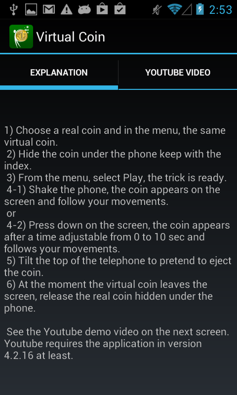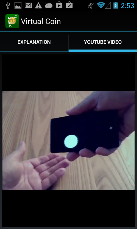 The magician shows a virtual coin, it is invisible! He throws this coin in the air and ... it falls into the phone screen ! The magician turns the phone upside down to get the coin out of the screen, but a true coin mysteriously appears ! A small trick for fun. 20 coins from different countries are currently available (Australia, Brazil, Canada, China, Denmark, Europe, India, Japan, Mexico, Poland, Russia, Sweden, Swiss, Turkish, UK, USA). Performance and explanation on Youtube video, many settings !