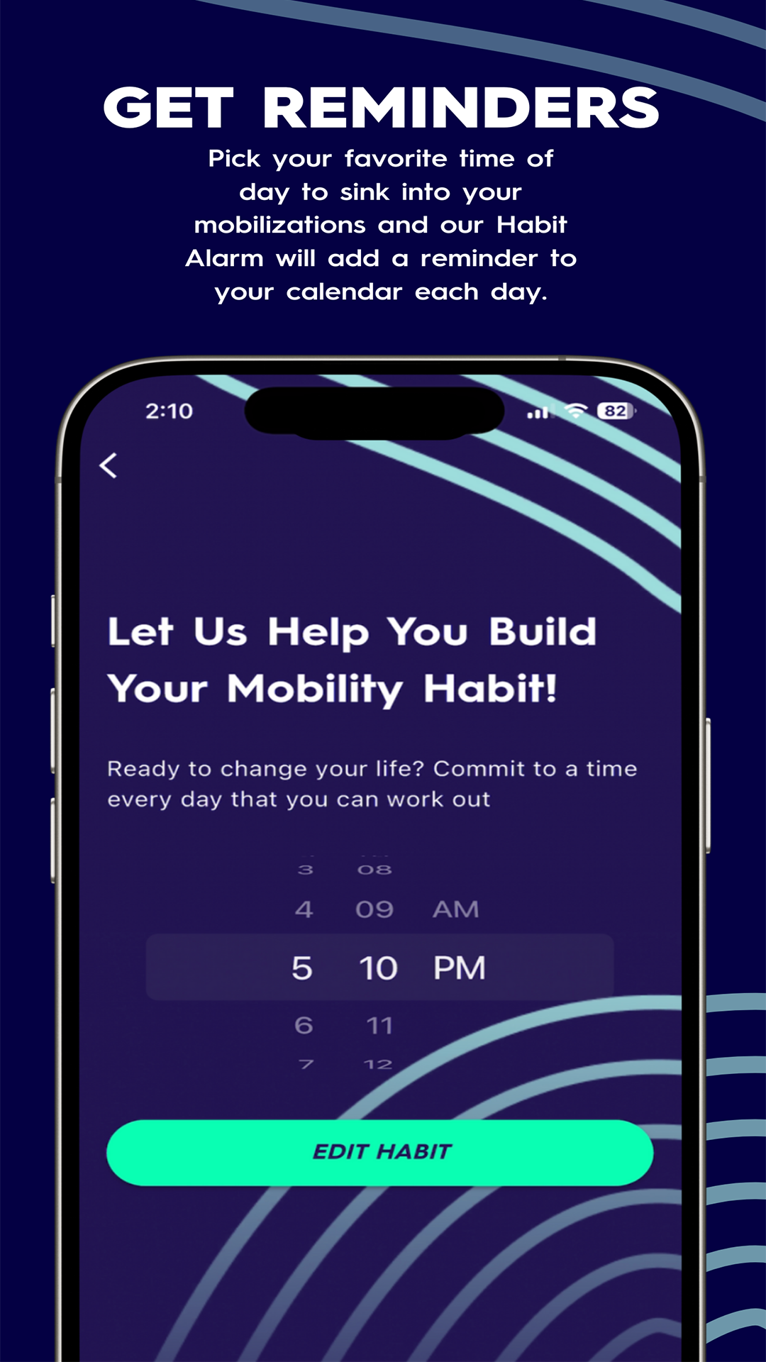 Staying consistent is key, so we built tools to help you build the habit. Set a ‘Habit Alarm’ to remind you to mobilize at your preferred time each day. Then, use the Daily Check-In to track your progress, record how you feel, and keep a running log of your mobility journey.