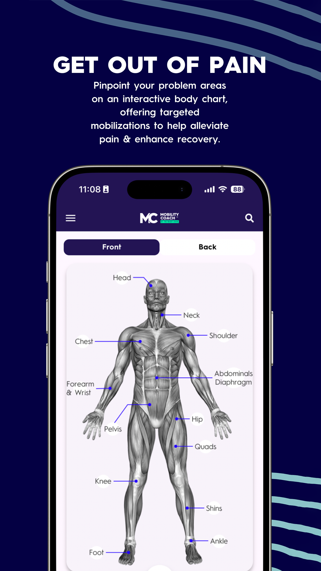 Experiencing discomfort? The Mobility Coach App's ‘Pain Map’ lets you pinpoint problem areas on an interactive body chart, offering targeted mobilizations to help alleviate pain and enhance recovery.