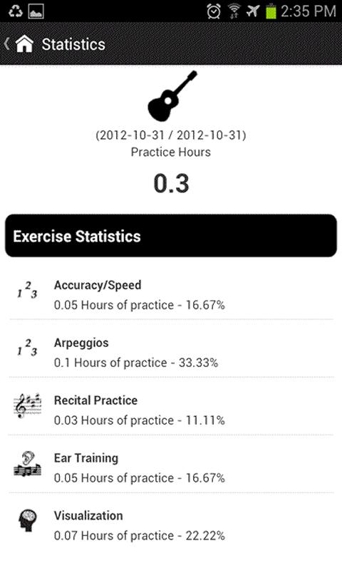 • Simple statistics that help you evaluate how you are using and distributing your practice time.