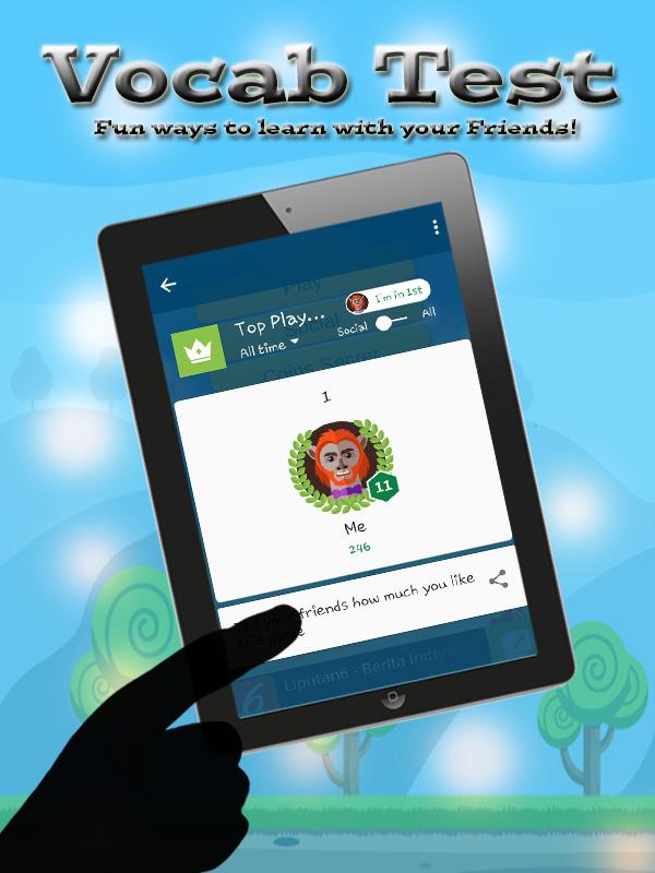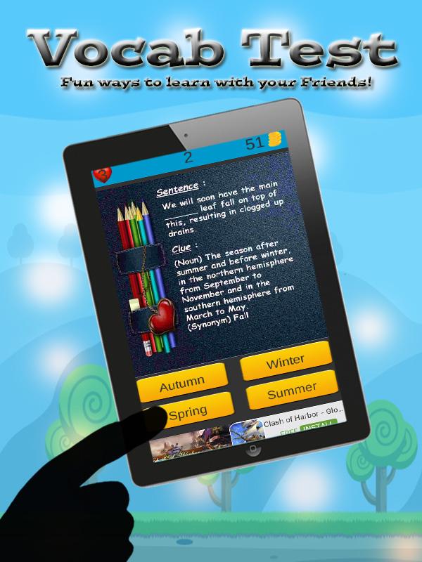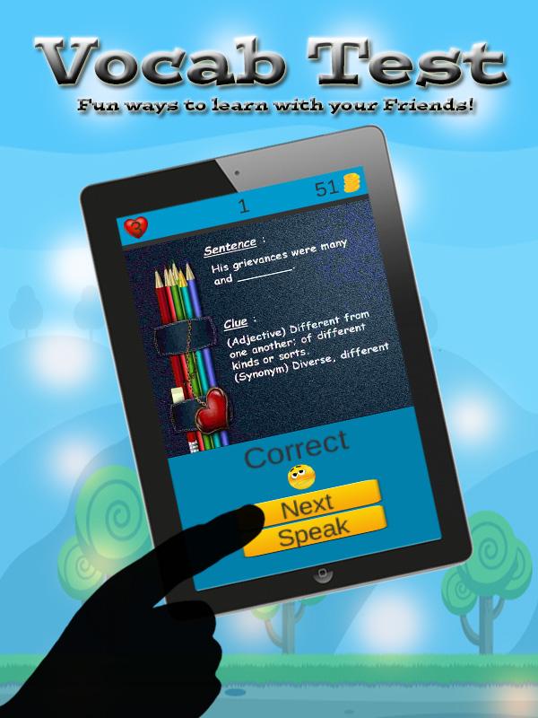 Free word games and cool games for kids! Learning vocabulary in english is not a boredom for tenth grade anymore. Through vocabulary test for 10th grade, the tenth grade can learn english grammar and pronounce words easily. Vocabtest is needed for vocabulary workshop and enrich their vocabulary words. Spelling words, colorful images, simple layout, professional pronounciation of the right vocabulary, playing words with friends; learn english is so much easier and fun for your 10th grade kids. Vocabulary test for 10th grade is the best word games that consist of powerful words, cool words, noun, and encouraging words. The kids don't need dictionary, webster dictionary, or english dictionary anymore to answer ielts, toefl, and toefl ibt based question. The test given with a clue, so the kids can answer it easily. Vocabulary test for 10th grade is a good inovation for education and assessment in schools, including in charter schools. Word finder, word crush, and word puzzle, all the feature in vocabulary test will help to enhance proficiency for tenth grade. Vocabulary test for 10th grade will replace the role of dictionary for kids. English language is one of the most important foreign language in the world and online quiz is one of best solution to learn english. Vocabulary test for 10th grade also have a ranking feature. So they could have an effort to be better and catch the top ranking. Better if their friends are playing too. They can make a challenge to be the top ranker and you’ll find your kids eager to learn more to enhance their vocabularies. Features : 1.Top Players with friends in Facebook 2.Gain coins for being Top Players 3.Clue in every questions 4.Improve listening and pronounciation skill 5.Understandable voice-over the words 6.Simple yet colorful design Vocabulary test for tenth grade is easy and fun to play. 1.See and read the question given 2.Try to answer it with the most possible word. You can get a help from the clue. 3.Choose the right vocabulary 4.Get a wrong answer? Need a help? Ask your friend in Facebook and invite them to play together 5.Listen the correct pronounciation for the words after answering the correct English Word 6.Try to spell it correctly and repeat Download Vocabulary test for 10th grade to help your kids in learning vocabularies. Spelling and learning a words is no more a challenge for your 10th grade kids. Through this vocabulary test games, you can see your kids develop their capabilities in vocabulary in the fastest period. TELL US WHAT YOU THINK If you feel vocabulary test for 10th grade is helpful for you and your kids, please share, rate, and review. Parents and kids are the best reviewer. We need your feedback to make this game better. Kindly reach us in our email on the play store if you have any question or suggestion. Help us to always provide high quality of educational games.