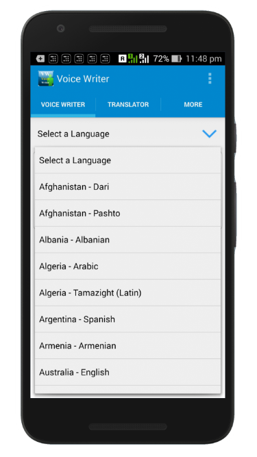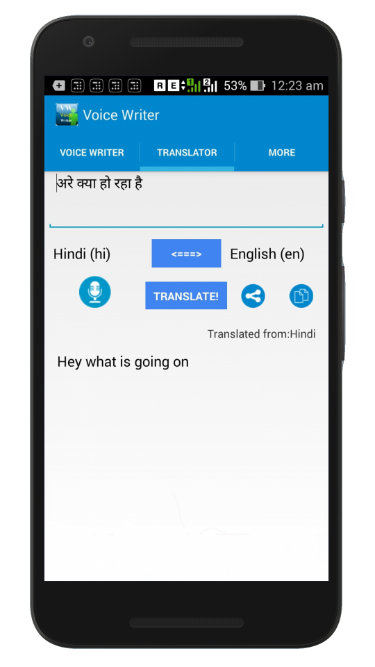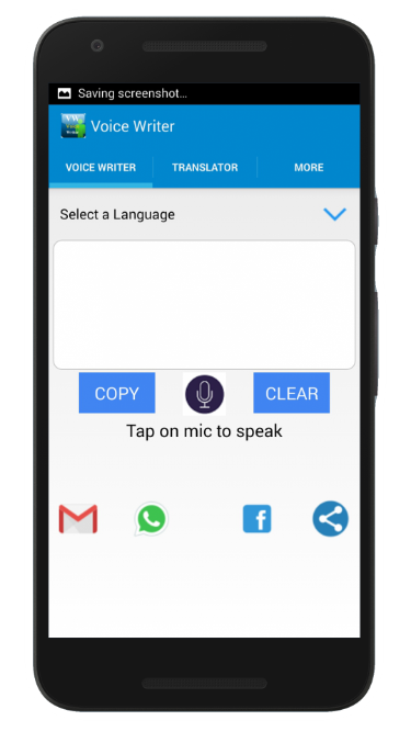 Voice Writer is a great app that helps to convert your voice into text. A converted text can be send via whatsapp, facebook, hike, email or any other services . Voice Writer will reduce your typing time period and be a digitalized method that will lead to less physical work. Voice writer is a plateform that provides you to Email,making notes ,message to any person without typing. Voice Writer have two types of tabs :- (1) In voice writer app One called HOME TAB in which you just need to speak text and it will automatically appear on the screen in the language that you have spoken. (2) The other tab in voice writer called TRANSLATE TAB in which select input language in which you want to speak and also select output language in which your text will be echoed at display. A modern technology that not only speed up communication but also save time for the busiest world that don't have adequate time to eat .Really voice writer app is also helpful to all un educated people's who not able to write. By using voice writer app they also able to chat ,message and can send email also.