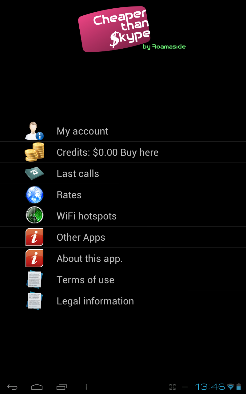 Make inexpensive international VOIP calls over Wifi. Our rates are very competitive and we don't charge any connection fee! Using Wifi, call directly from your mobile phone or tablet without using your "minutes" and without any roaming fee You get free phone numbers to receive calls. Your tablet becomes almost a cellphone. See our rates on www.roamaside.com Cheap calling has never been that easy. This App is based on CSipSimple and is licensed under GNU GPL v3. More information in the App.