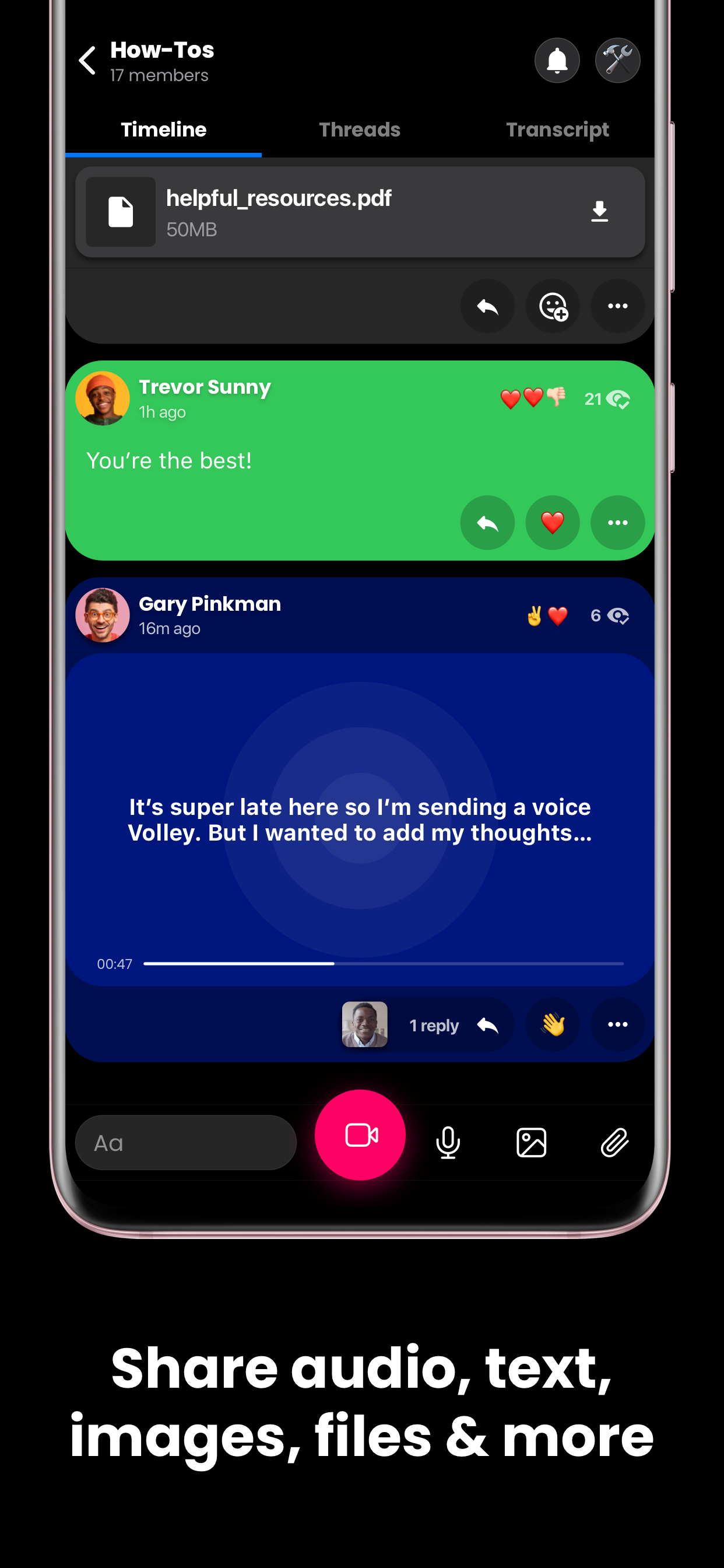Volley is a video messaging app that makes it easy to have rich conversations on your own time. You can talk 1:1, as a group, or create a space for your community, VIP clients, or side-hustle team.