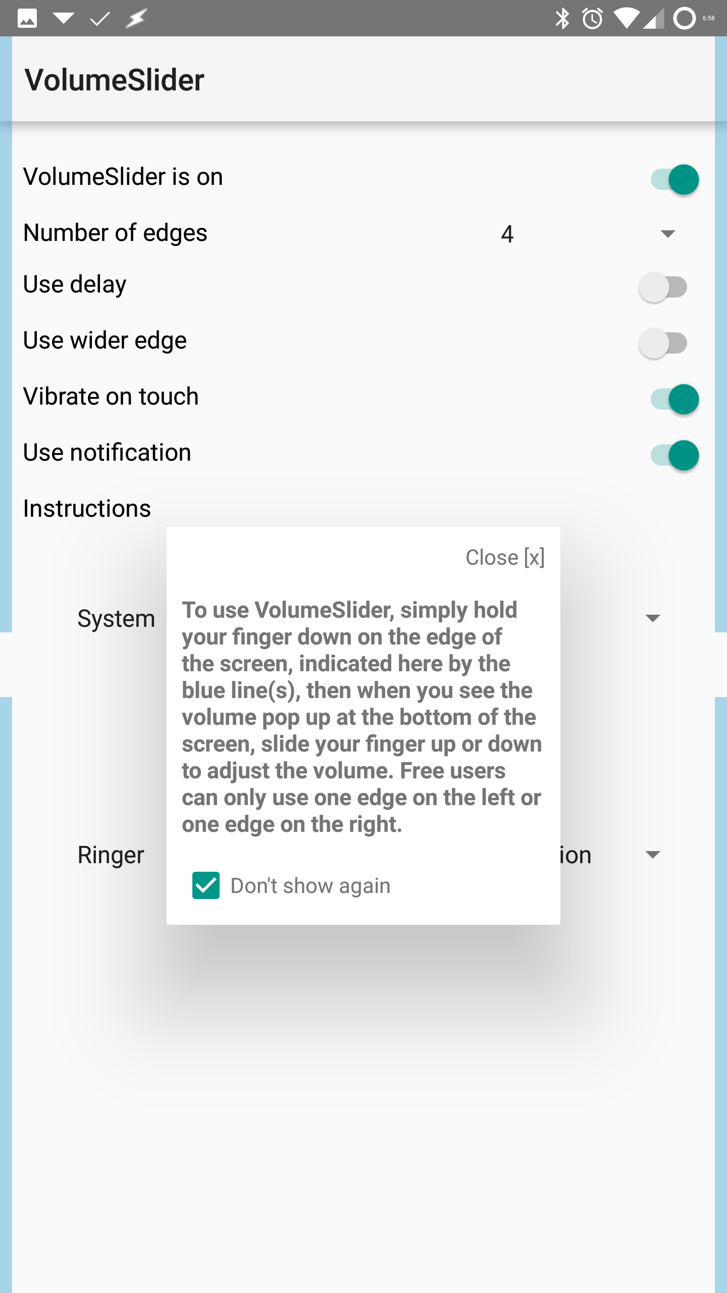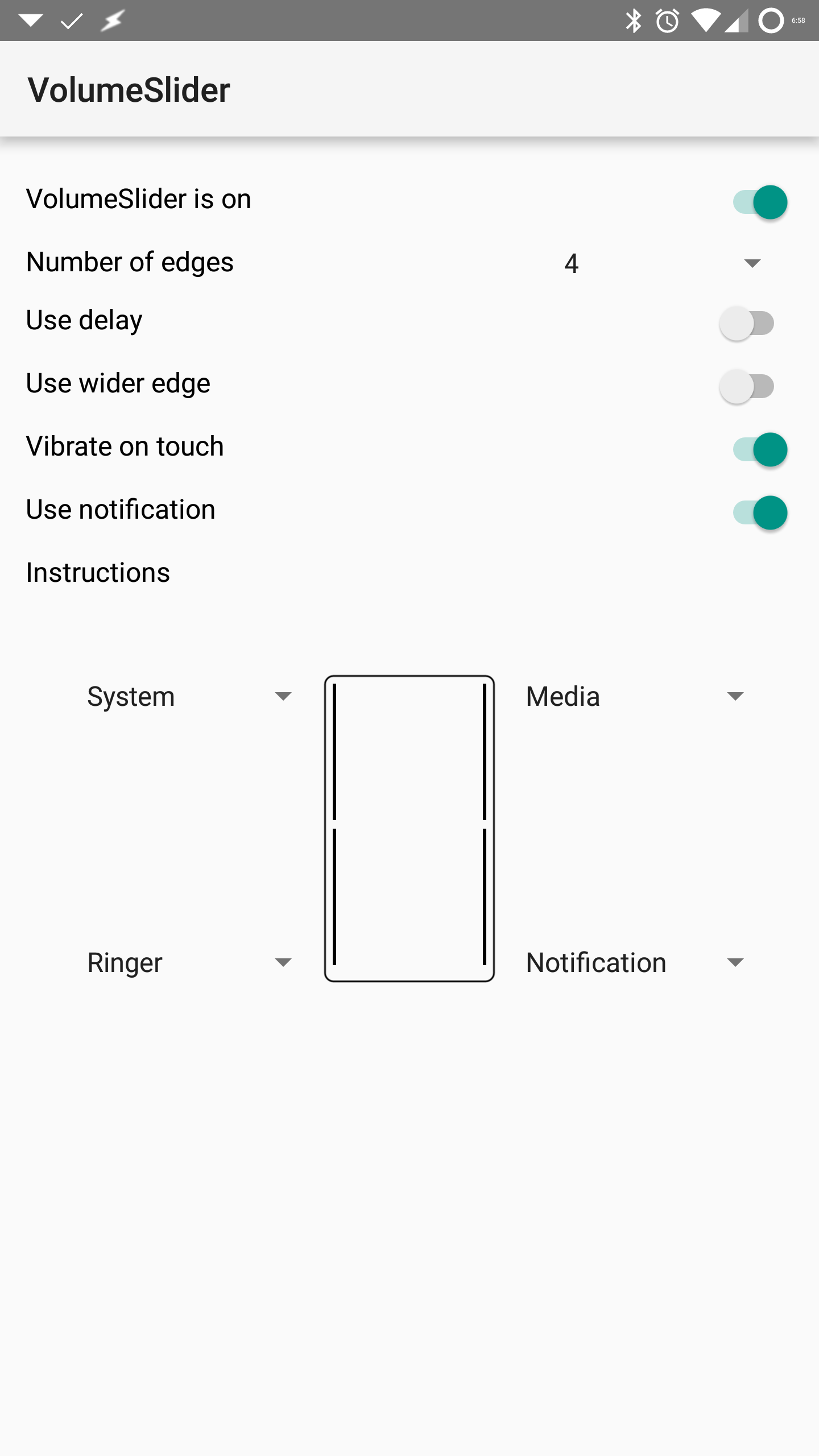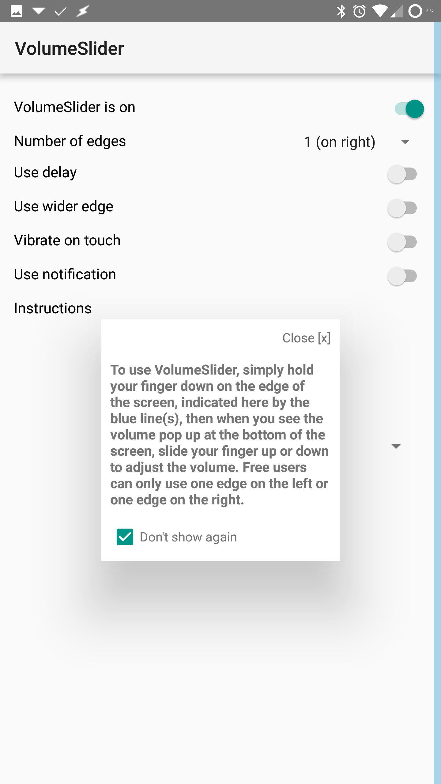 - UNINSTALL then REINSTALL. Give ALL permissions (Do Not Disturb, Draw over other apps, Write settings, and Accessibility) - New edge options on the left and right sides for premium users - New selections: in-call and auto rotate! - Increased sensitivity so you get more adjusting with shorter sliding - Use of system toast is default for now - Free users get left edge only
