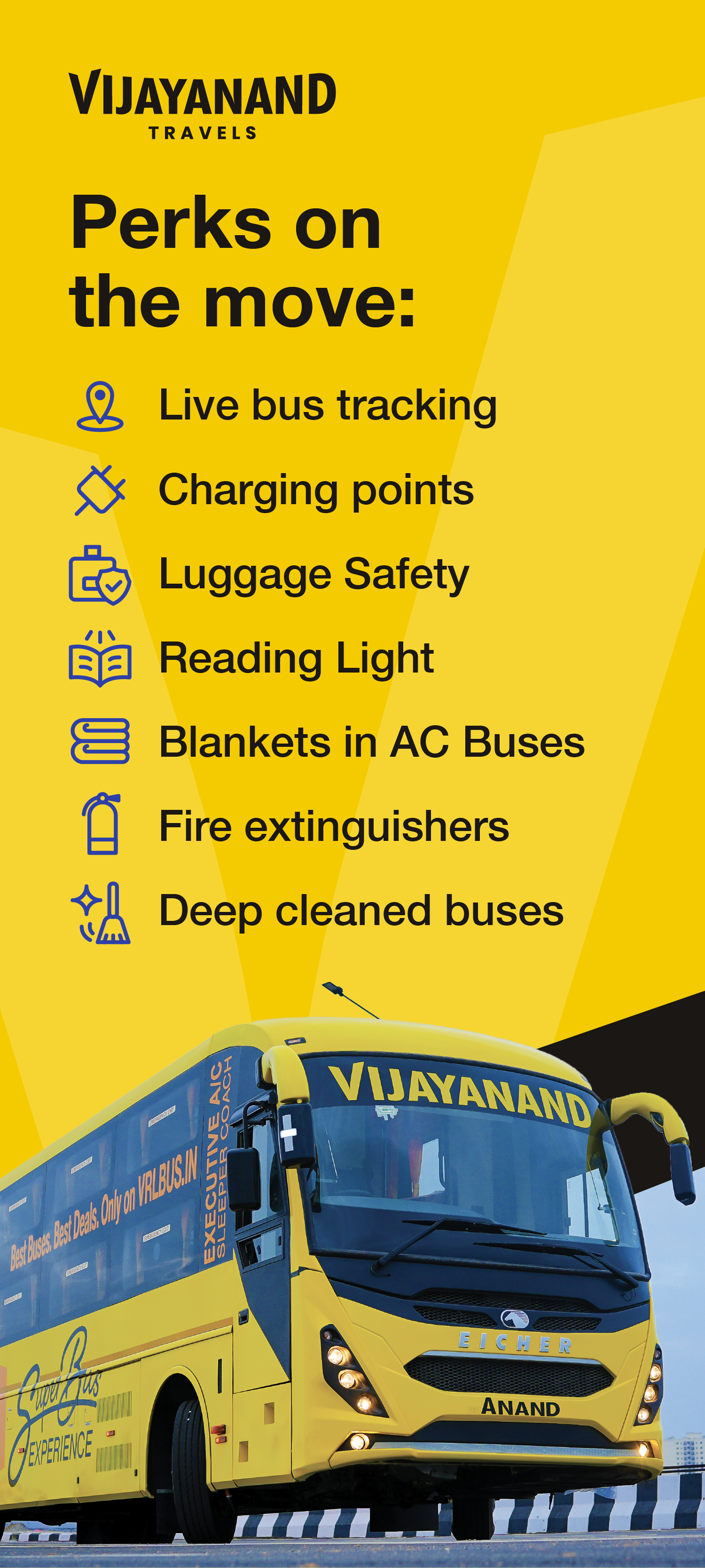 VRL TRAVELS is one of the front runners in the Indian passenger travel Industry among the private sector players. These operations are conducted under the aegis of "VIJAYANAND TRAVELS" (Division of VRL Logistics Limited) covering more than 350 routes connecting nearly 100 destinations with over 290 luxury Buses / Coaches. It is the market leader in Karnataka's private passenger Travel Industry. Our customer have the choice of several bus types, viz. AC / Non A/c sleeper coach, AC / Non AC semi sleeper / seater, etc. Our fleet comprises a wide range of vehicles of several makes such as Volvo, Isuzu, Ashok Leyland, etc to cater to every customer pocket preference. Key Highlights : • ISO 9001:2008 Certified Operations. • Service in the states of Karnataka, Maharashtra, Andhra Pradesh, Tamil Nadu, Gujarat, Rajasthan and Goa. • Pre-dominant fleet of Multi Axle Seater / Sleeper Volvo Coaches among the private operators. • Pioneer in launching direct bus service from Karnataka to the commercial centers of Jodhpur, Ahmedabad & Surat. • Largest fleet of Volvo Multi-Axle buses in the private category. • Drivers Special Training centre at Hubballi for safe driving. • 24 Hours Customer Care for quick resolution of passengers complaints. No. 0836 2307300 • Buses on contract at special rates for the pilgrimage centers like Shirdi, Tirupati, Shabarimalai, Pandharpur & Dharmasthala. • Supply of buses at special rates for marriages and school / college trips / Corporate Contracts. • Well planned passenger facilities at major centers like Bengaluru, Hubballi, Bijapur, Chitradurga & Tumkur. • Special focus on clean toilet facility for ladies and elderly passengers. • Individual entertainment screens in select long route buses. • Stoppages only at exclusively identified good quality locations for hygienic food for long journeys. • Exclusive restaurant at Tumkur to cater to the taste buds of passengers. • Huge network of agents spread across the country and online booking facility for easy reservation of seats. • Tie-ups with travel majors such as redbus.in, makemytrip.com, abhibus.com, etc. • Connecting journeys for key locations to Tier - II & Tier – III locations. • Establishment of state of the art Washing Units at key locations for maintaining cleanliness of Buses. • Double drivers aboard every bus for safe travel. • Pioneer of "Lady seat" concept. • One of the only few private operators to provide bus back-up facility for breakdown etc. • Internal CCTV cameras for safety of passenger belongings. • Attractive discounts on offer for online bookings. • Best in class punctuality record.
