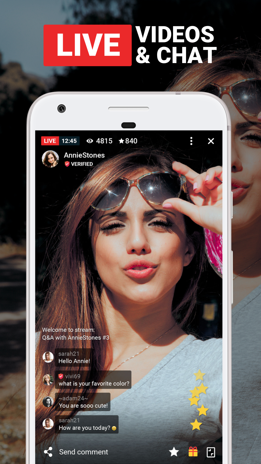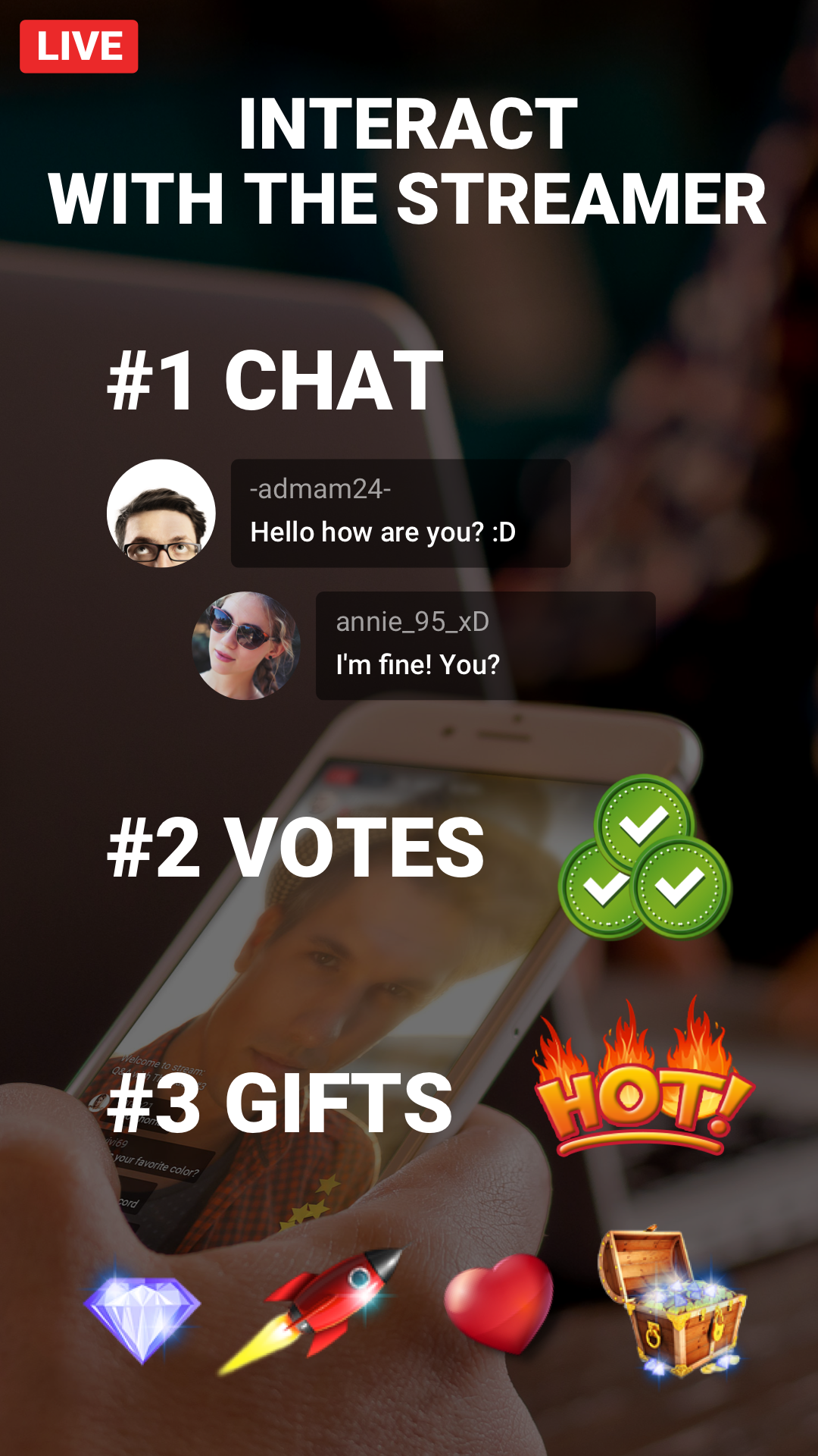 V2.4.0 Now, you can send gifts like hearts, flowers and diamonds to your favorite broadcasters during a live stream. Show everyone how much you like what you see and try to grab the broadcaster's attention. In addition we resolved some smaller bugs and reworked the profile-section. Enjoy!