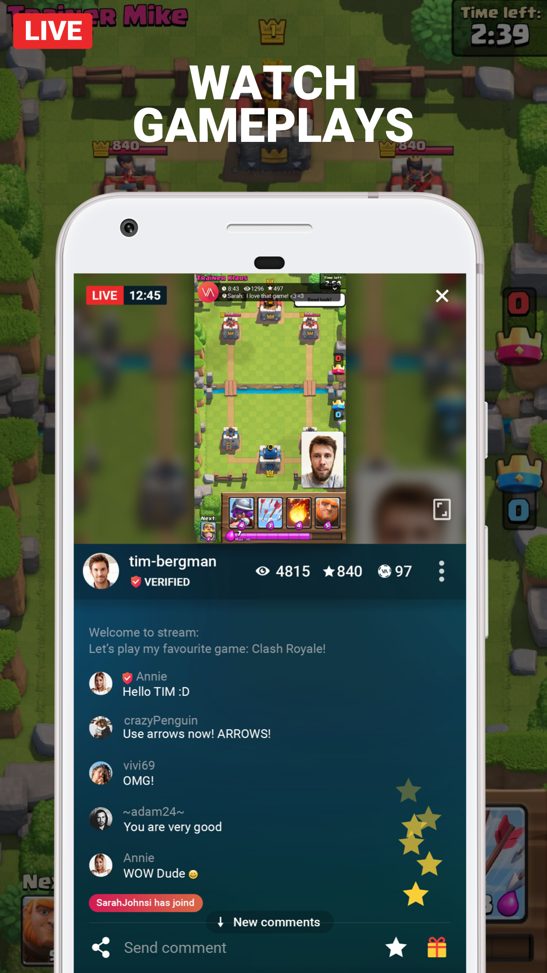 New: Stream the screen of your mobile - any game you are good at. You broadcast the apps you love to your audience and they see all your reactions and can interact with you.
