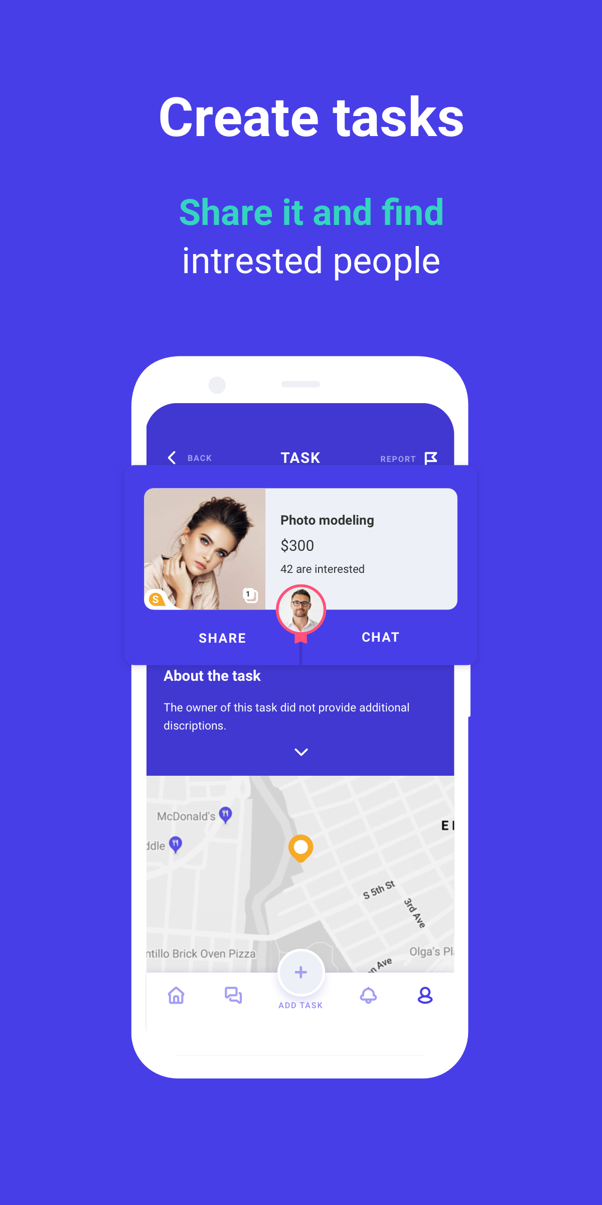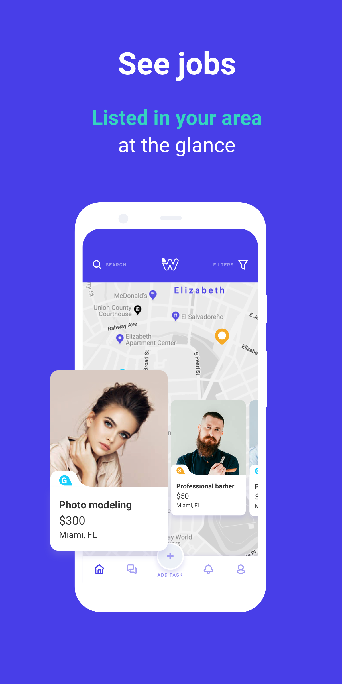 Simply download the app, sign in, and open the map. Here you can review all of the available odd jobs and freelance tasks within your region. Click on the map marker, start a conversation, and secure your income all-in-one. Do it at your convenience and according to your schedule.
