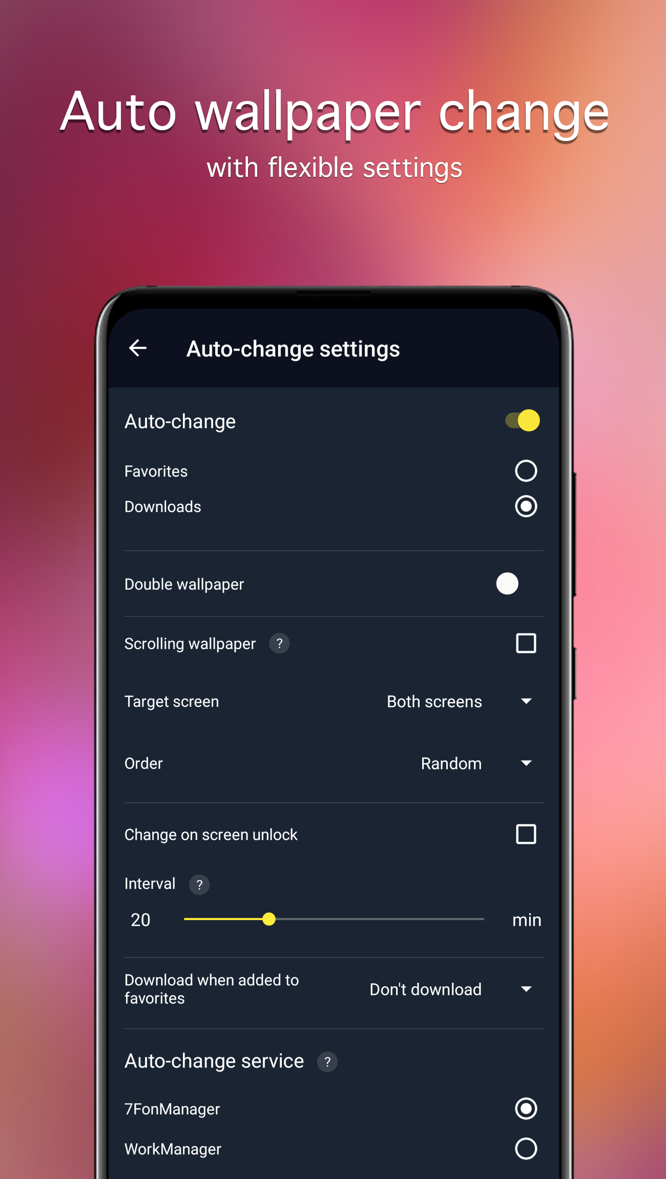 4K and HD wallpapers for Android - curated backgrounds for your phone. Find the right home screen or lock screen wallpaper with color search and tags. Use 7Fon as a wallpaper changer: set in one tap or auto-change on a schedule. 7Fon helps you personalize your Android phone with high-quality wallpapers that are easy to browse, easy to search, and simple to set. If you like a clean setup, 7Fon makes it fast to find a background image that fits your icons and widgets. What makes 7Fon different - Handpicked catalog: every image is reviewed before it is added. - High resolution wallpapers: Full HD (1080p) and higher, including QHD, UHD, and 4K options. - Built for fast selection: categories, tags, and color search in one place. Browse and discover wallpapers - 70+ categories (nature, animals, abstract, cars, dark backgrounds, and more). - Sort results by newest, rating, or popularity to find top wallpapers quickly. - Open a tag to explore similar backgrounds. - Search wallpapers by keyword when you already know what you want. - Use color search when you want a wallpaper that matches a theme, icon pack, or accent color. This workflow is especially useful when you are building a consistent home screen look. Set wallpapers the way you like - Preview before you apply. - Crop/fit the wallpaper so it looks right on your screen. - Apply in one tap. - Set as a home screen wallpaper and, when supported by your device, a lock screen wallpaper. Save for later (Gallery / SD card) Download wallpapers for offline use: - Save background images to your Gallery for deferred setup. - Save to an SD card if your device supports external storage. Downloaded wallpapers can be installed later even when you are not connected. Auto wallpaper changer (scheduled rotation) Want your phone background to change automatically? Use 7Fon as an auto wallpaper changer: 1) Add wallpapers you like to Favorites. 2) Choose the source for rotation (for example, Favorites). 3) Pick an interval and schedule. 4) Enjoy an updated wallpaper on your chosen cadence. A scheduled wallpaper rotation is a simple way to keep your phone looking new. Wallpaper notifications - Wallpaper of the Day and Wallpaper of the Week alerts help you discover new images without searching. Preview quality controls Choose preview quality to balance image clarity and mobile data usage. This helps when you browse wallpapers on the go. WhatsApp chat background Use your chosen wallpaper as a WhatsApp chat background (and in other messengers). Quick start 1) Pick a category or search by tag. 2) Narrow results with a color search. 3) Preview, crop, and set the wallpaper - or download it for later. 4) Add your favorites and turn on auto-change to refresh your home screen on a schedule. Notes - Lock screen setting availability depends on your Android version and device. - SD card saving is available when supported by your device. Whether you want a minimal dark background, a bright nature photo, or an abstract wallpaper, 7Fon is a curated wallpaper app that helps you search by color, save favorites, and refresh your screen automatically.