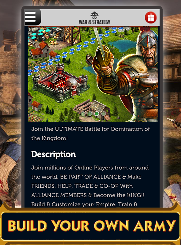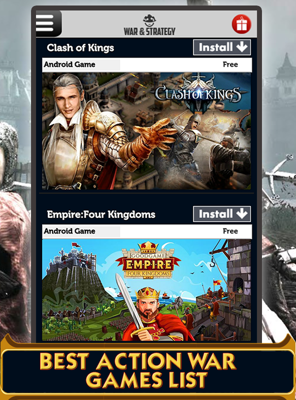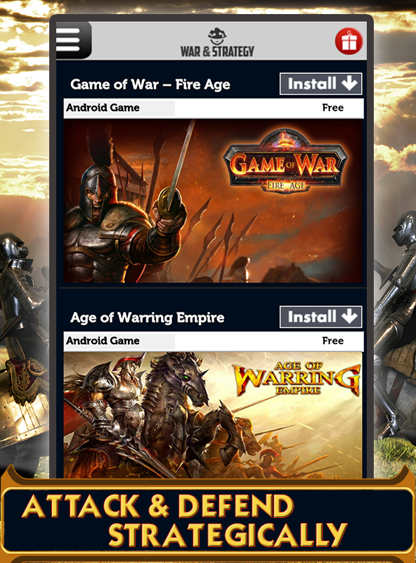 Don't waste time searching games in the Android Market™. In this app, you can view the list of the well-selected action war games. But don't forget that only when you have internet connection, you can view it. Watch videos, read the descriptions and decide which one is for you. Then, click the install button which directs you to the Android Market™ where you can get the games safely and easily. You see the list of games from Strategy Games, Tower Defense games, Real Time Strategy, Modern Strategy Wars, FPS First Person Shooter, Galaxy Wars, Medieval Wars, Empire Games, Civilization Games, City Building Games, Shooting games and Action games categories. If you like strategy war games, you can find the best ones of Tower Defense games, Real Time Strategy game, Modern Strategy War games in which you place your soldiers or warriors strategically and defend your kingdom or attack enemy hordes. Show your power at different time wars. Go back to the medieval times and fight as a knight or a gladiator in legendary epic wars. Join modern battles where you control tanks, war-crafts to bomb military camps. Besides, you can fight against alien armies in galaxy! Build an empire, a kingdom, or a modern city to control your own army or become a sniper in FPS games or other kinds of shooting games. Features: - A comprehensive collection of well-selected war games covering shooting games, action games, and strategy games - Game categories: Strategy Games, Tower Defense games, Real Time Strategy, Modern Strategy Wars, FPS First Person Shooter, Galaxy Wars, Medieval Wars, Empire Games, Civilization Games, City Building Games, Shooting games - File size under 1 MB - Scrolling terminal - Daily update to show you the new released games - Free and paid categories - Game trailers to indicate how to play - Star category including the best games selected by the editor - Friendly user interface design - Similar games recommended - Fast installing - Compatible with nearly all android versions of phones and tablets