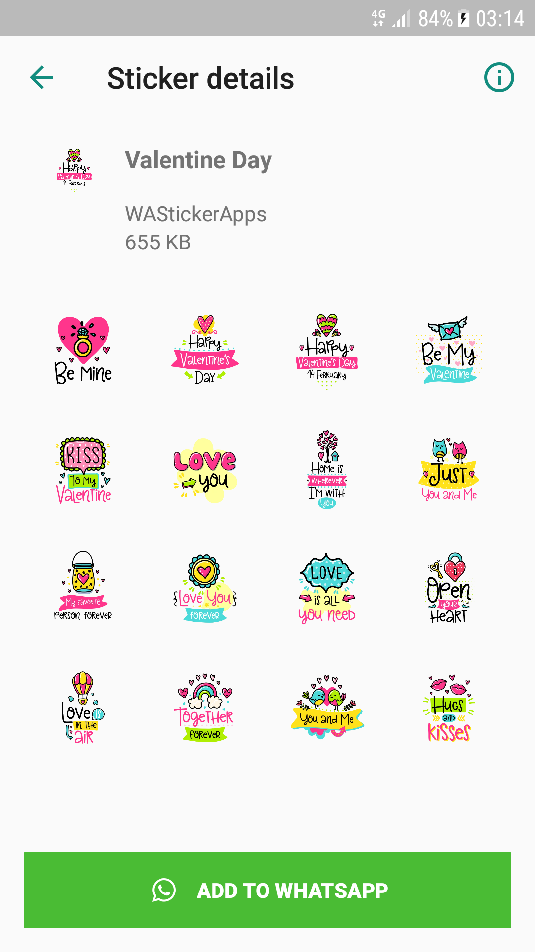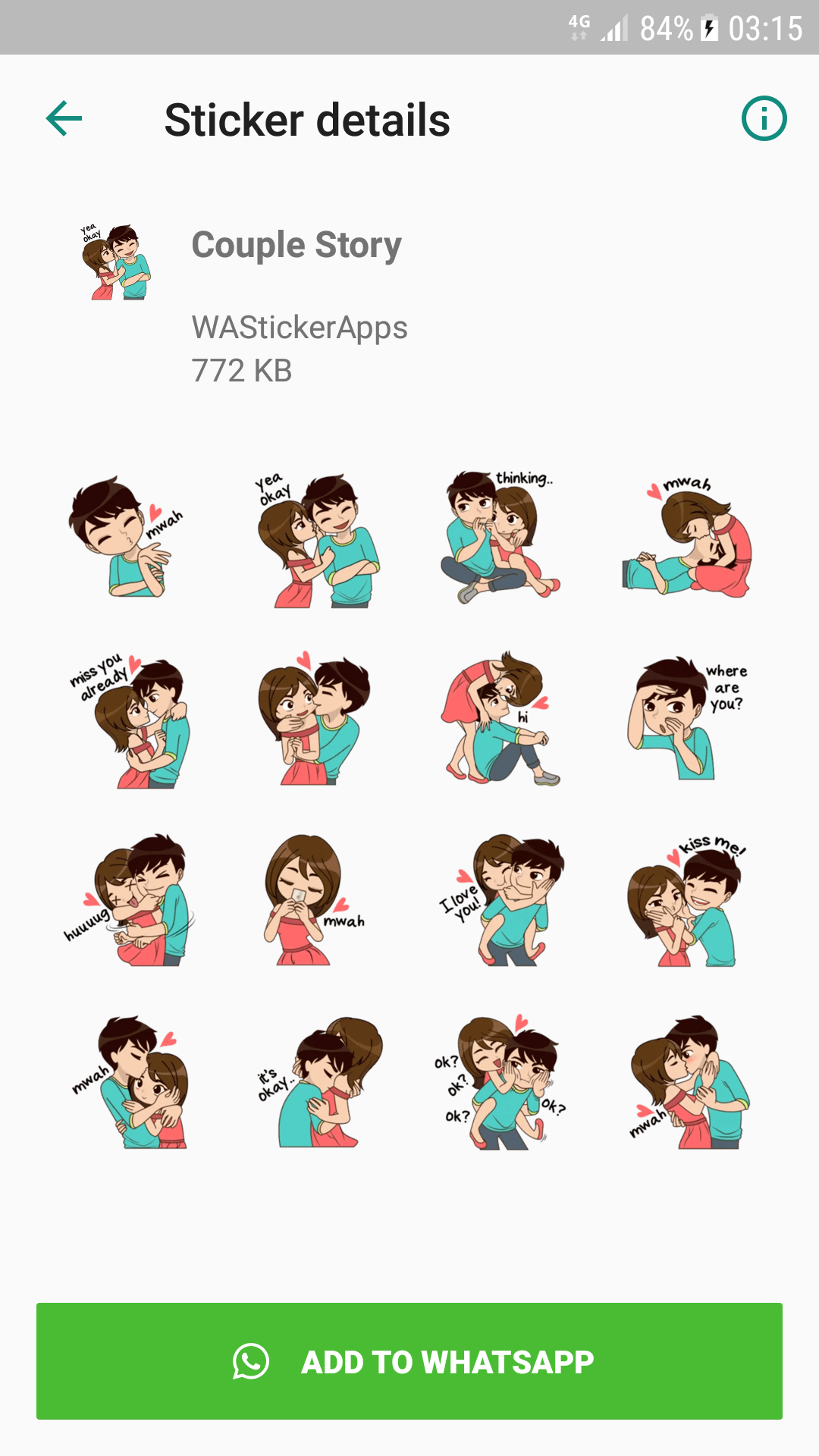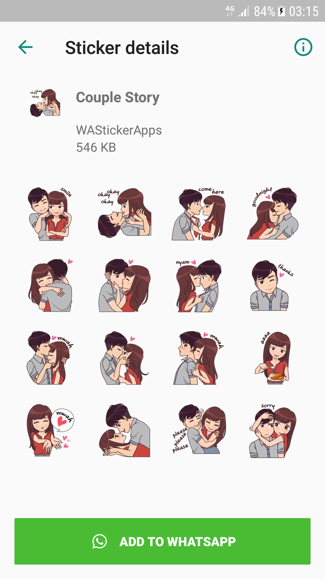 Need Stickers for WhatsApp. Yes, we have the collection of the best Love Stickers for WhatsApp. You're one step away from downloading one of the best stickers collection for WhatsApp in the market. Creativity and 100% security. You will have at your disposal an app that is constantly evolving and that will offer you more stickers in the future. We offer you amazing stickers packs so you can choose the one you like best. What are you waiting for? Requirements: - Lastest versions of Whatsapp - Download Love Stickers - Add your favorite WAStickerApps pack to your Whatsapp - Enjoy sending stickers to your friends! How to use: - Download and open this app - Tap on 'ADD TO WHATSAPP' - Confirm your action - Open WhatsApp and go to a chat - Tap on the Emoji icon - You will see a new sticker icon at the bottom and can now use this sticker pack What does our app bring? - Free Love Stickers - Sad Girl Stickers - Valentine Stickers - Love Story Stickers - Love Sayings Stickers - Happy Love Couple Stickers - Anime Love Couple Stickers - Romantic love stickers - Kiss love Stickers - Text Stickers - Gifts love Stickers - WAStickerApps Saint Valentin - Stickers New Stickers for WhatsApp. Download now the Girlfriend Stickers, Couple Stickers, Girls Nick Name and many more new Stickers for WAStickerApps. Feedback: If you have any suggested features or improvement, please leave a comment. In case something is not working correctly please let me know. When posting low rating please describe what is wrong to give the possibility to fix that issue. Disclaimer: All logos Stickers/Images/names are copyright of their perspective owners. This image is not endorsed by any of the perspective owners, and the images are used simply for aesthetic purposes. Thisapplication is an unofficial fan based application No copyright infringement is intended, and any request to remove one of the images/logos/names will be honored. That’s it. Just install and enjoy this Application, Don't forgate to give rating if you like it so much.