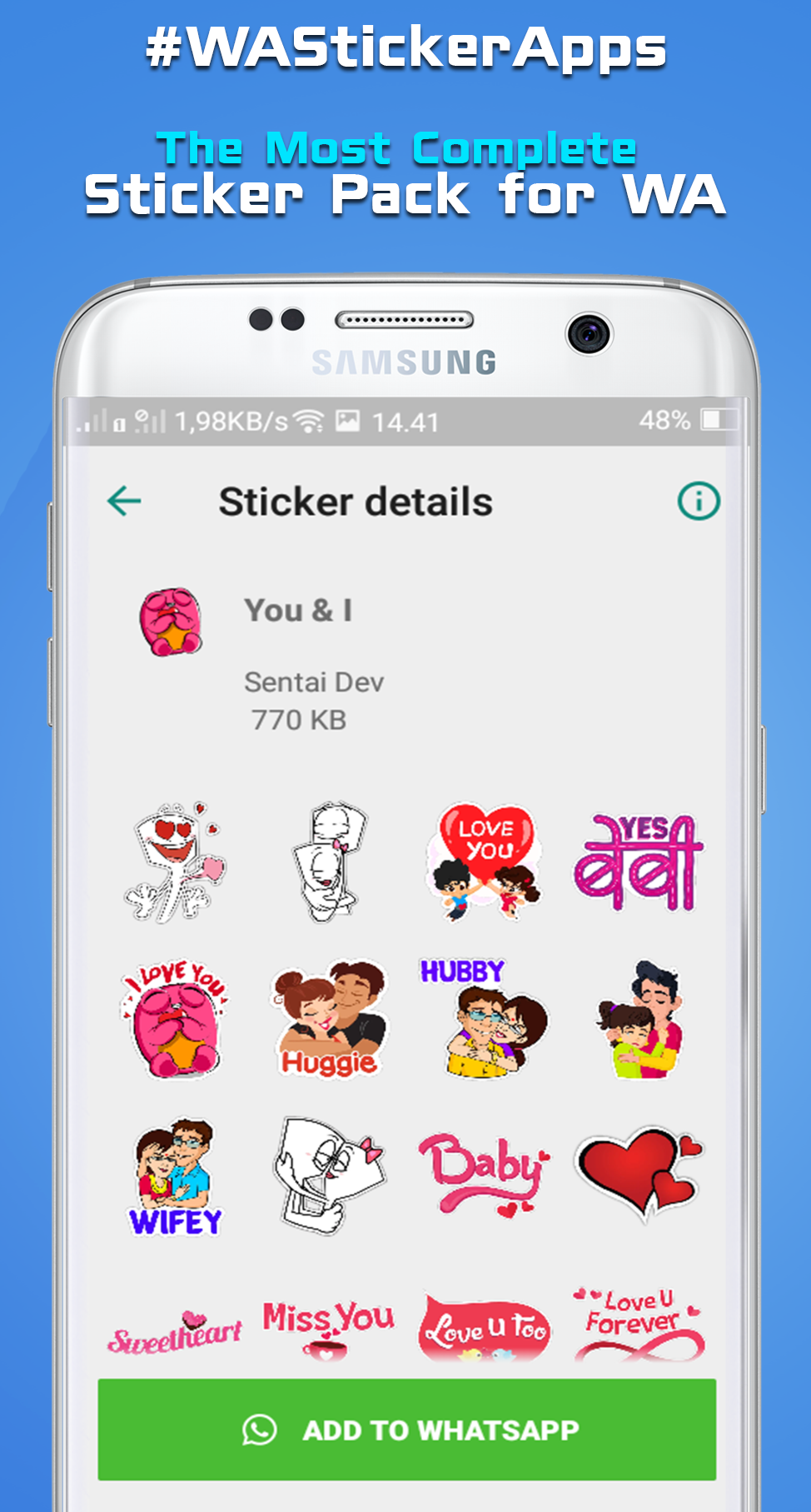 Sticker App for WA (Package Name: com.supersentai.wastickerapps_chat) is developed by Super Sentai and the latest version of WAStickerApps - Sticker for Whatsapp : Complete 1.0 was updated on November 19, 2018. WAStickerApps - Sticker for Whatsapp : Complete is in the category of Communication. You can check all apps from the developer of WAStickerApps - Sticker for Whatsapp : Complete. Currently this app is for free. This app can be downloaded on Android 4.0.3+ on APKFab or Google Play. All APK/XAPK files on APKFab.com are original and 100% safe with fast download.