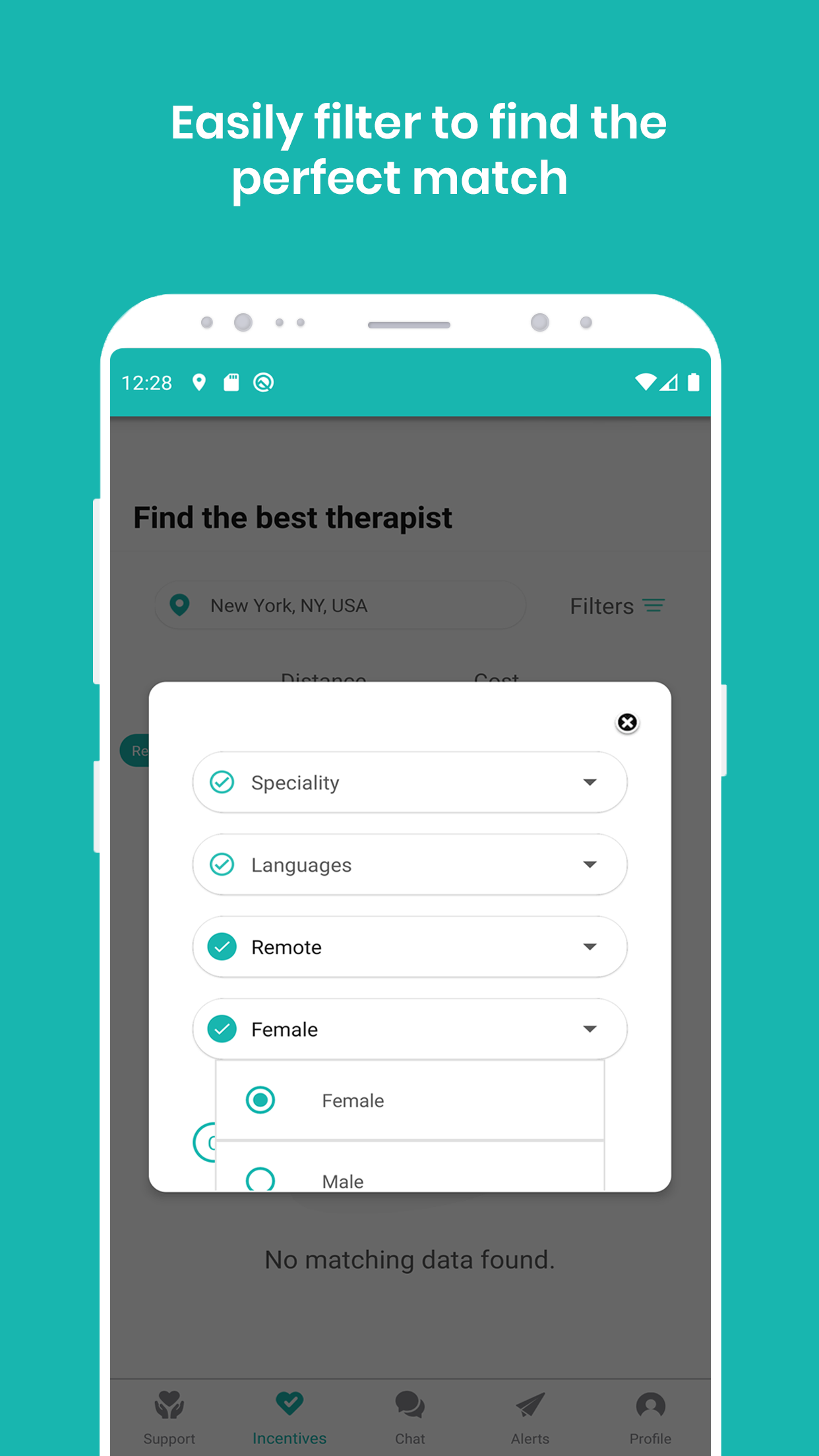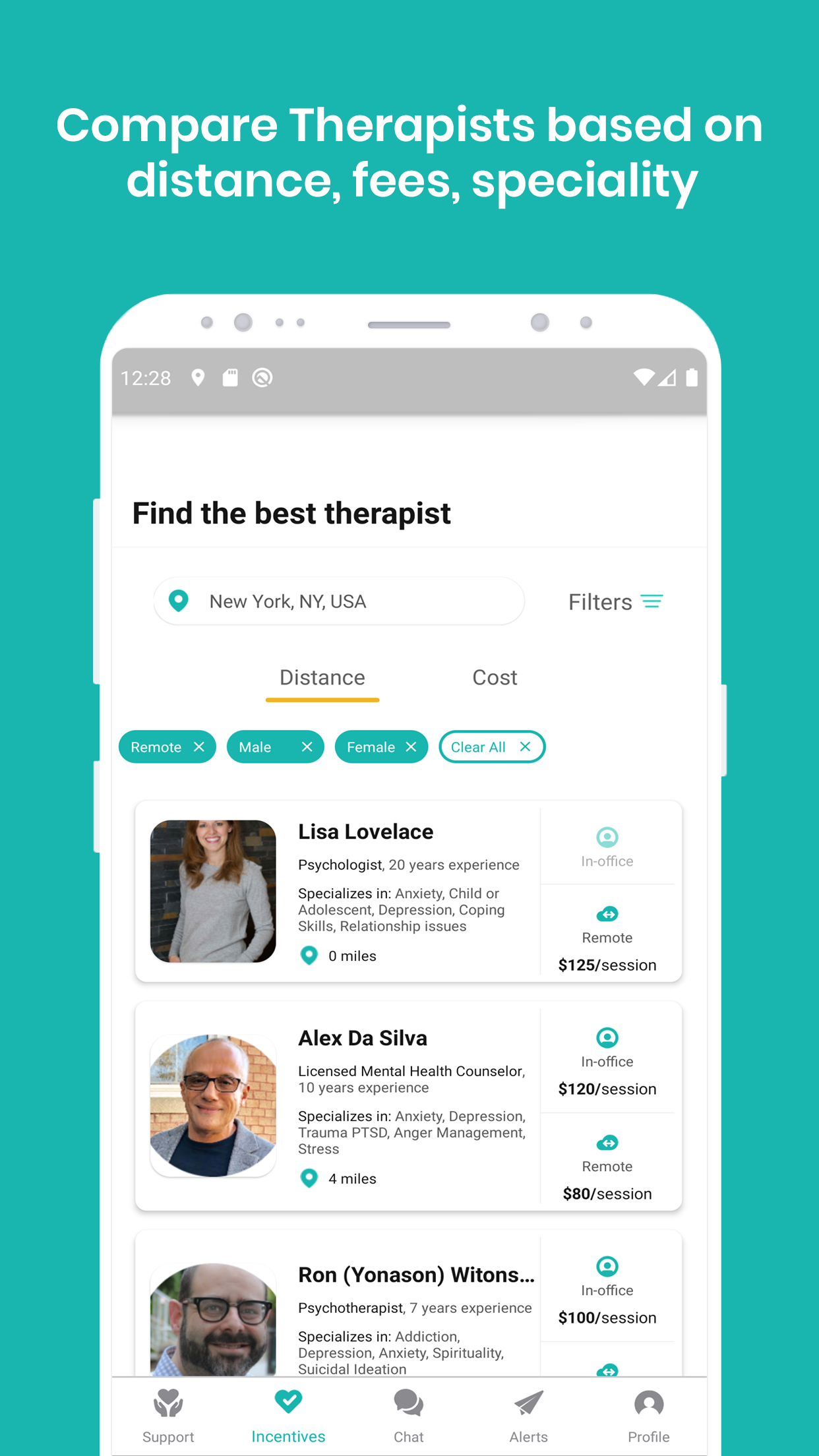 Find-a-Therapist: Easily find your perfect Therapist. Transparent pricing, confirmed availability, distance from you measurement, Online and in-person options. Filter therapists based on Cost, Distance, Specialty, Languages etc.