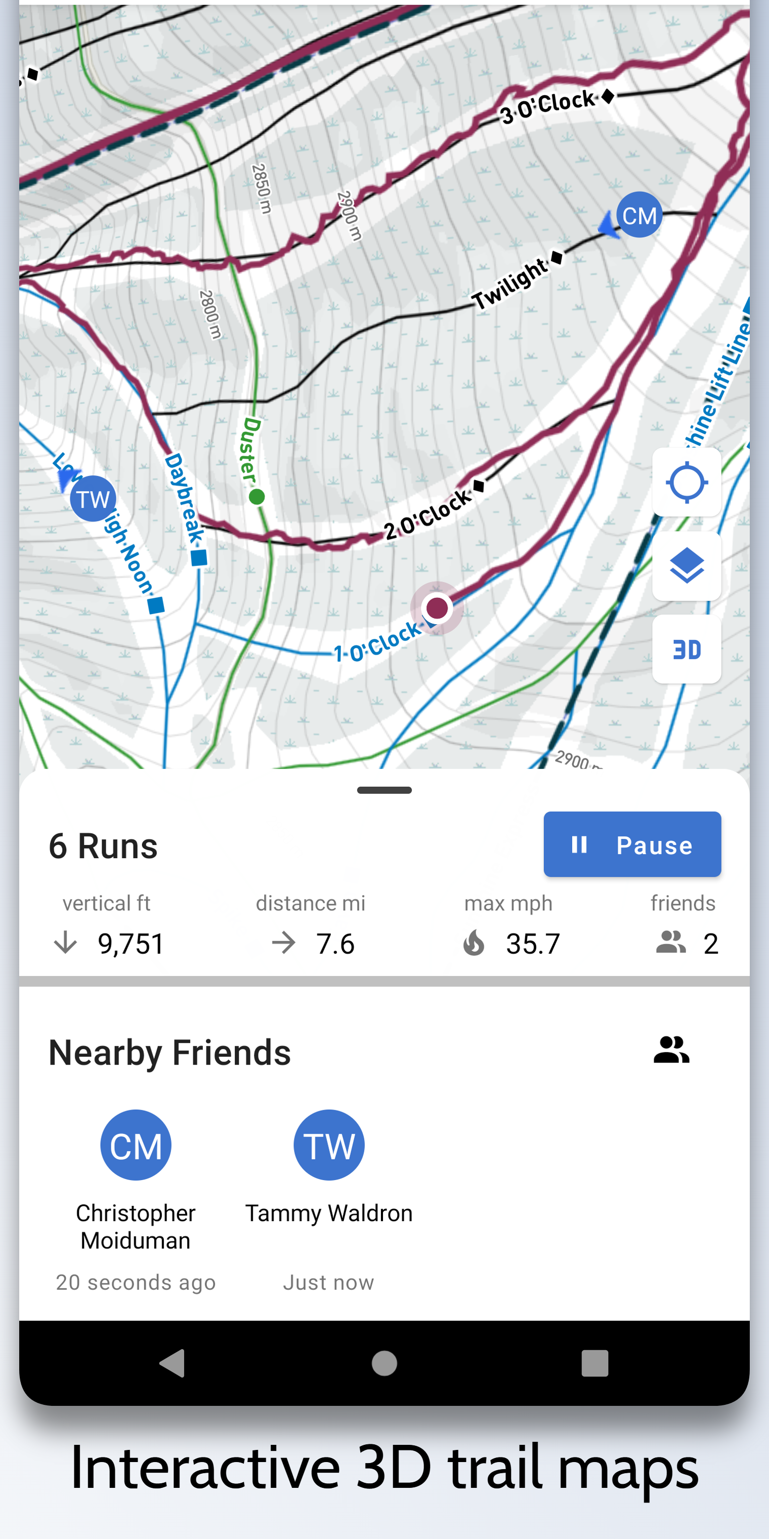 We Ski & Snowboard is an intuitive, reliable ski tracker with best-in-class 3D trail maps, live friend locations, public and private leaderboards, detailed stats, lift wait times and more. It provides a generous free version, along with the option to subscribe for a premium experience. The app has complete feature parity between iOS and Android implementations. Key Features Navigate the mountain like a local with interactive, winter-themed, 3D trail maps, custom-styled for optimal outdoor viewing. Over 2,000 resorts have been mapped worldwide. See where your friends are in realtime, and where they are headed. No more phone calls and texts from the lift. Only your friends can see your location, and vice versa. And of course you always have the option to go incognito, because no friends on powder days. Avoid lines by checking nearby lift wait times, crowdsourced automatically by We Ski. After your day on the mountain, relive the stoke by replaying your runs in immersive 3D. Check your speed and slope angle at any point along the run, and see where you hit your top speed and steepest pitch. Check your ranking on leaderboards against just your friends, or against the global We Ski community. We Ski provides leaderboards by season for vertical, distance, and number of days. We Ski is designed to be very gentle on your phone's battery, managing a full day of recording with minimal battery drain. Import and export GPX files from other trackers.