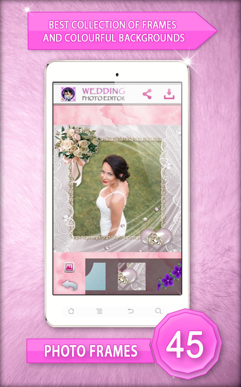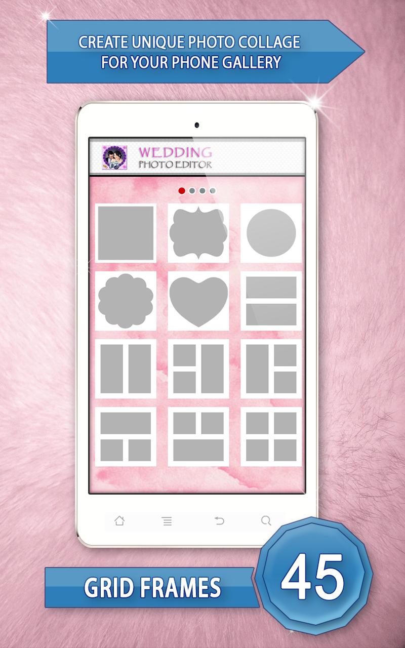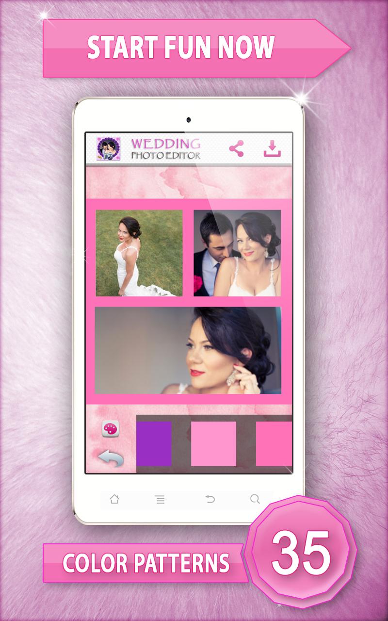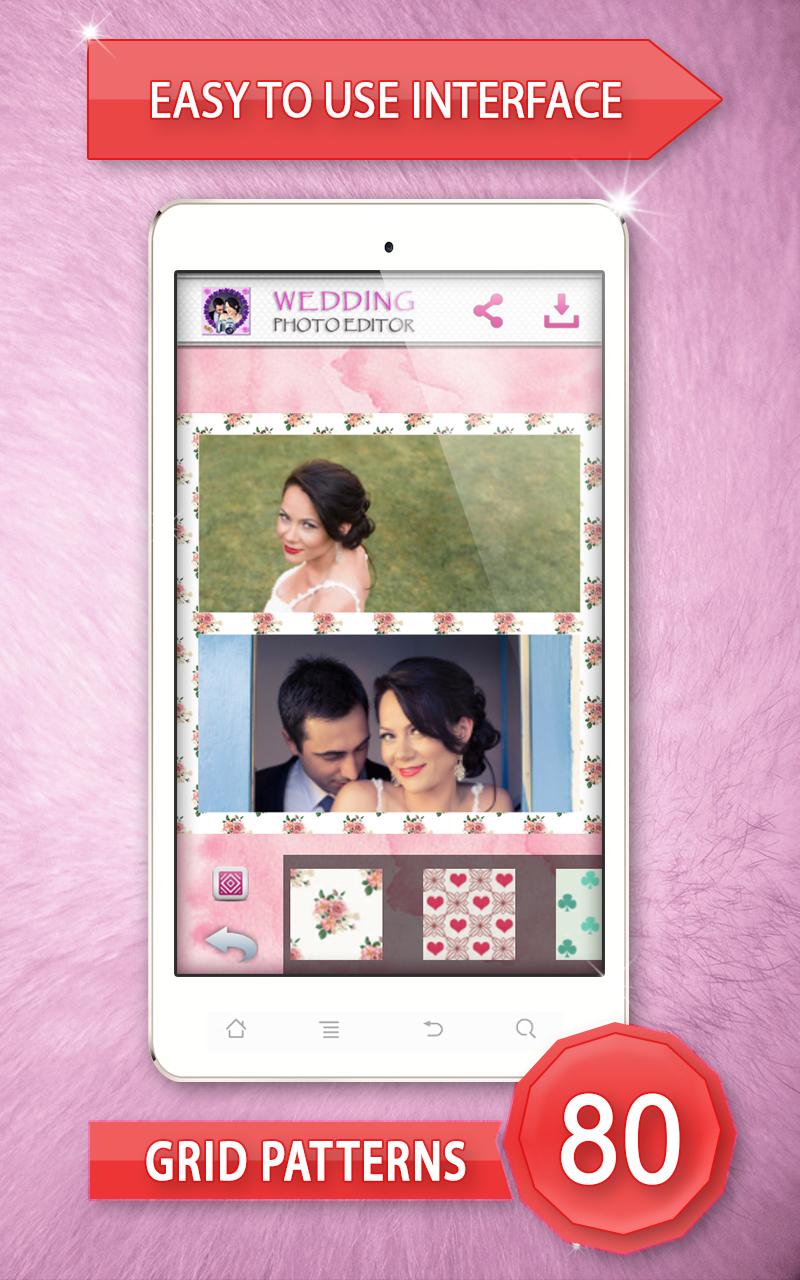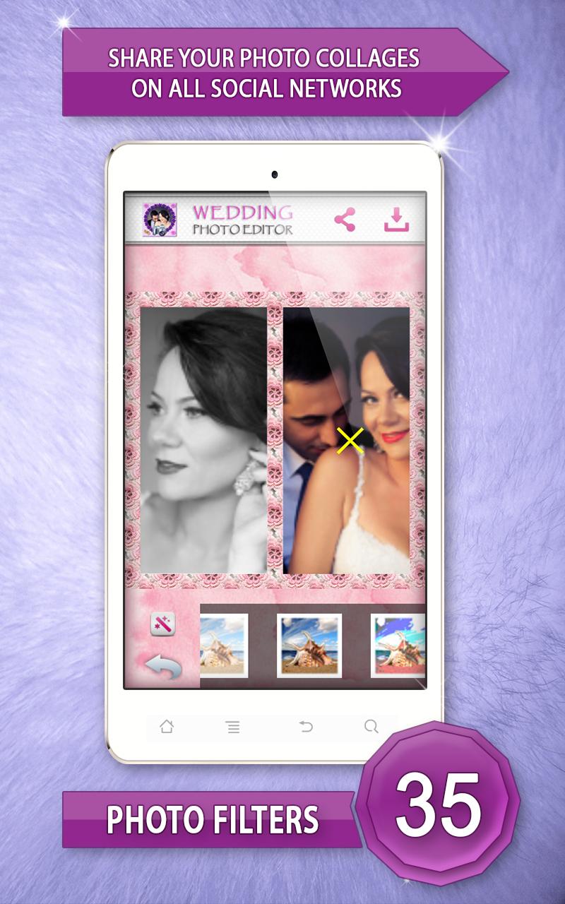 ♥ Wedding Photo Editor ♥ is the most romantic photo editor app for your mobile. Do you have too many photos of your special day and don’t know what to do with them all? Make lovely wedding photo collage! Create a delightful collage showcasing all of your sweet moments. Download “Wedding Photo Editor” as soon as possible and enjoy. Pick your favorite wedding photo frame and favorite colorful background and have fun with photo editing. Your big day deserves this beautiful photo collage. Make an unforgettable wedding photo collage! Features: Easy to use interface Select photo from your phone gallery Drag and drop photos and easily move around within collages Zoom, rotate, scale and crop images to fit the collage layout Choose your favorite photo frame and background templates Save high resolution picture collage to your phone gallery Share your photos to Facebook, Twitter or Instagram. This is a very nice and useful photo collage editor. Make memorable collages! This simple application lets you quickly and easily create wedding photo collages. You will have a variety of customizable wedding designs to choose from. Free photo editor offers you square templates, polygon templates, circle templates, heart templates, star templates and more photo templates of different sizes and shapes. Paste your photo in the heart-shaped frame and create a charming collage. ♥ Wedding Photo Editor ♥ picture editing software lets you add photos from your phone gallery or directly from your camera. Showcase your wedding day with adorable “photo collage”! Simply upload your “wedding photo” and set your favorite wedding photo frames. Create cute photos by using black and white photo effects, pop art, sepia, silver, ivory, seashell, quartz, jade, aquamarine, amber or opal photo effect you will have a perfect photo collage on your phone. Just select best wedding photos and get an awesome photo collage for your new Samsung Galaxy phone. Download ♥ Wedding Photo Editor ♥ and enjoy in making collages. Forget about wedding photo albums and put your wedding photos in romantic wedding photo collage. This free “photo editor” is a creative way to display your special moments. Turn your memories into fabulous pics art, with wedding photo collage. Celebrate your special day by creating stunning collage that you'll enjoy sharing for years to come. Wonderful wedding photo frames are ready for you. You can move, stretch and zoom your photos around until they fit photo collage template. Create beautiful wedding picture collages and enjoy your wedding pictures grouped together! Make those memories a part of your life forever. Put funny wedding pictures in romantic wedding picture frames. Create a unique wedding present from the images taken on the big day. By using this gorgeous photo editor, you will very easily be able to create modern wedding collage for your family using your “wedding pictures”! Capture unbelievably cute moments and group lots of photos into one photo and make awesome collage. Get one of the best photo editing apps for Android™ device and start free picture editing! Photo “collage maker” is designed for all users who like photo editing. Make interesting and contemporary picsart out of your “wedding photos”. ♥ Wedding Photo Editor ♥ allows you to share these joyful memories with your friends on Facebook, Twitter, Instagram and a lot more. Commemorate your wedding with beautiful photo collages that will last a lifetime. *Android™ is a trademark of Google Inc. *This app is not affiliated with or endorsed by Samsung.