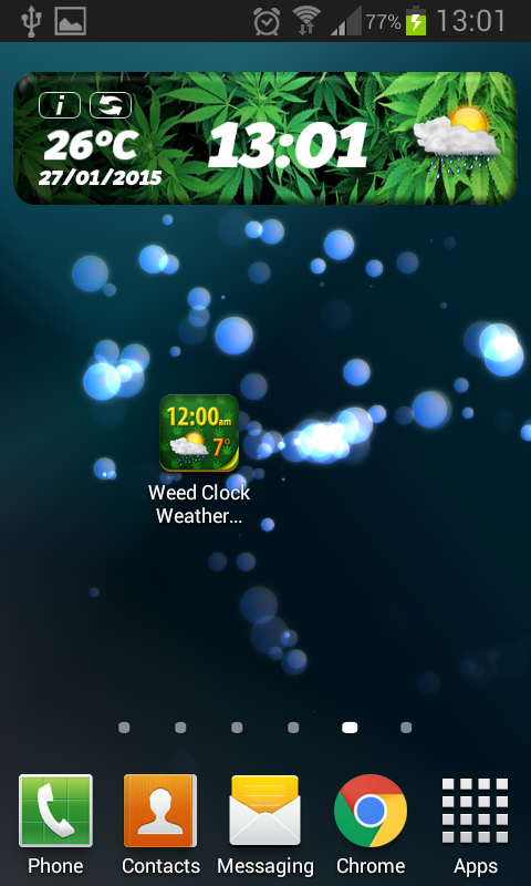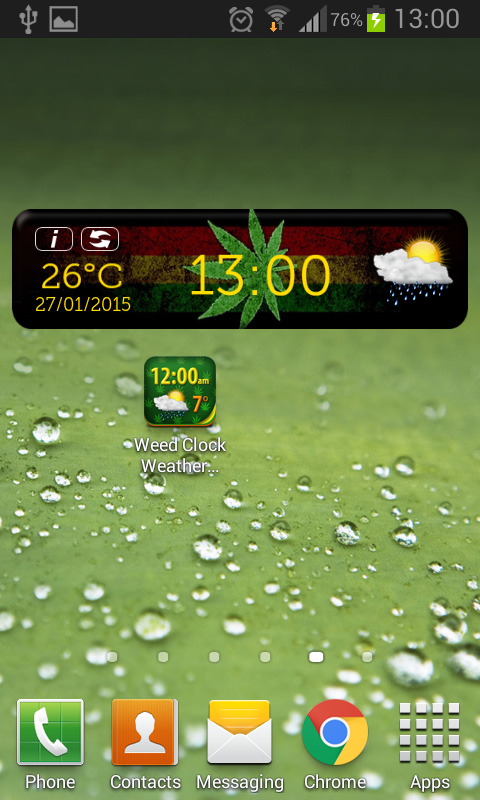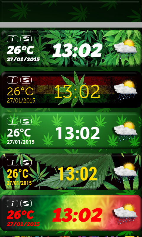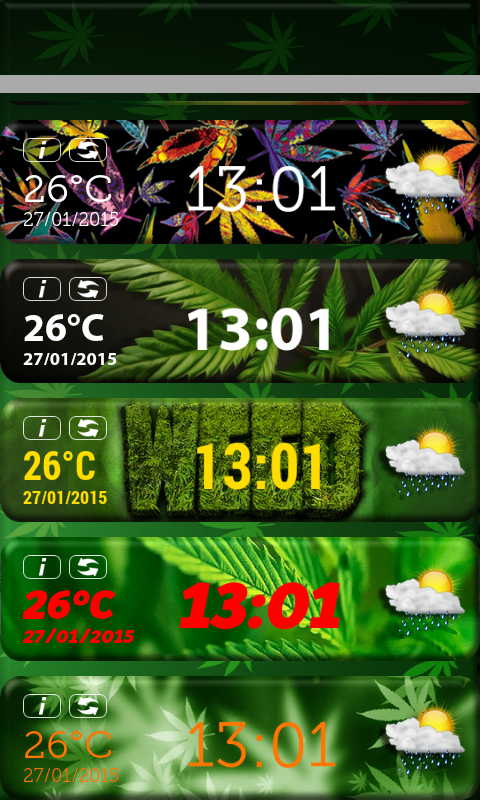 ☀ Weed Clock Widget ☀ is the latest widget for your mobile. Want to have super cool clock on your screen? Or you want to know what’s the weather like outside? If you like weed more than anything you can decorate your screen with magnificent weed clock and weather widget. Download “Weed Clock Weather Widget” and beautify your screen. This beautiful widget will show you weather forecast, date and time of best quality. Enjoy beautiful clock and weather decorated with weed! 10 digital clocks, 5 unlocked and 5 locked. Every day new weather and clock is available. Put wonderful clock and weather widget on your home screen. Top widgets of different sizes and shapes. Easy to use for adults and children. Add widgets to beautify your screen. These clocks, calendar and weather widgets not only they are functional, they are unique and personalized. Cool and practical widgets should find home on your home screen. So, hurry up and download this amazing free “digital clock”. Try out the new “weather widget” and have Cannabis always in your pocket. These interesting widgets for your Android™ device are new on the market! Wait no more, be the first to have this beautiful “clock widget”. If you are bored with standard clock that you have, it’s time to replace it with new weed widget clock. This awesome widget will show you weather conditions on your screen. You will know whether it’s cold outside or extremely hot. Here you will get a collection of awesome designs as your home screen widget.☀ Weed Clock Weather Widget ☀ offers you breathtaking digital clocks that show you weather conditions. Both Celsius and Fahrenheit measurement units are available! Set your favorite clock covered with cannabis and your screen will look even more beautiful. Your favorite “digital clock widget” will make you feel happy whenever you look at your mobile devices. With this magical widget you will decorate your screen and you will always know what is the temperature outside. If you like weed, download these amazing weed clocks. Hurry up and download the best and the biggest collection of widgets that show you local weather. Beautify your screen with awesome free ☀ Weed Clock Weather Widget ☀. It's totally legal to enjoy your new marijuana clocks and weather. They have a lot of different sizes and shapes, different colors and designs. You don’t have to watch weather channels any more. See whether it’s raining, snowing or it it’s sunny outside. Find out what is the cloudiness, humidity, wind speed and world weather wherever you are. A clock widget that displays the time, the date and even the weather conditions offers different color themes to choose from. Whatever is your favorite marijuana type Acapulco gold, African black, Johnson grass! Show cannabis logo on your home screen to everyone, they'll love it! Download this awesome free widget for your new Samsung Galaxy phone. Set time and weather display and change the text color and font. Beautify your phone screen with magnificent cannabis plants and marijuana leaves that will show you everything about the weather today. Download ☀ Weed Clock Weather Widget ☀and feel happiness whenever you look at this astonishing forecast. The weed is everywhere, even on your phone and tablet home screen. *Android™ is a trademark of Google Inc. *This widget is not affiliated with or endorsed by Samsung.