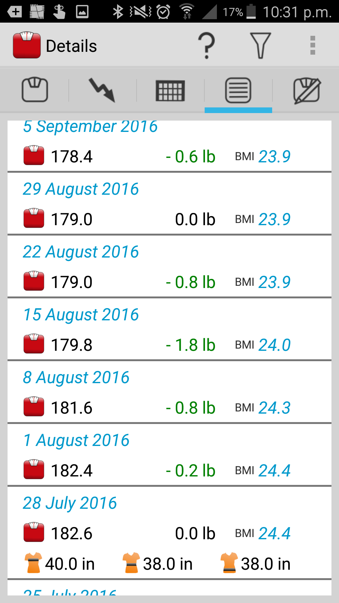 * Record weight in Pounds, Stones or Kilograms, and convert all values instantly.
