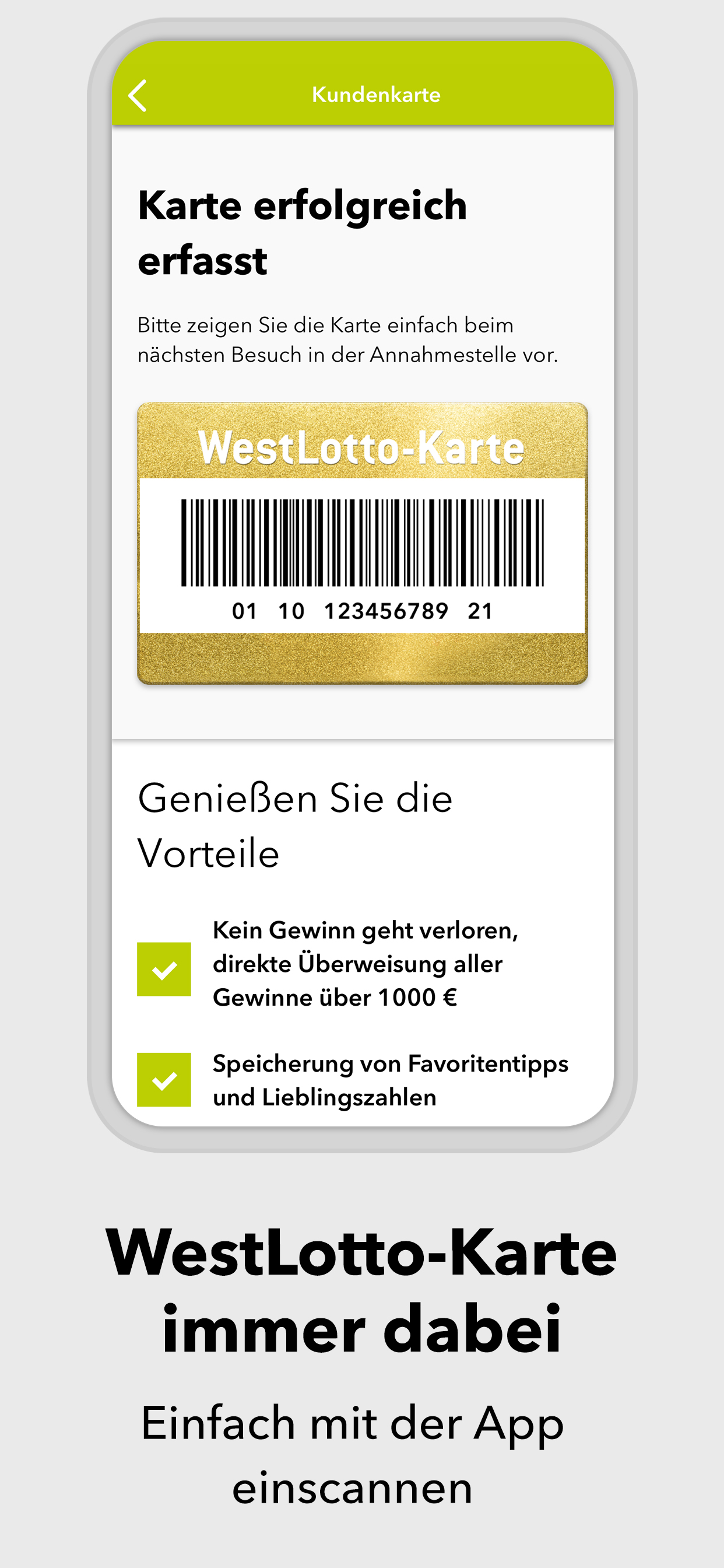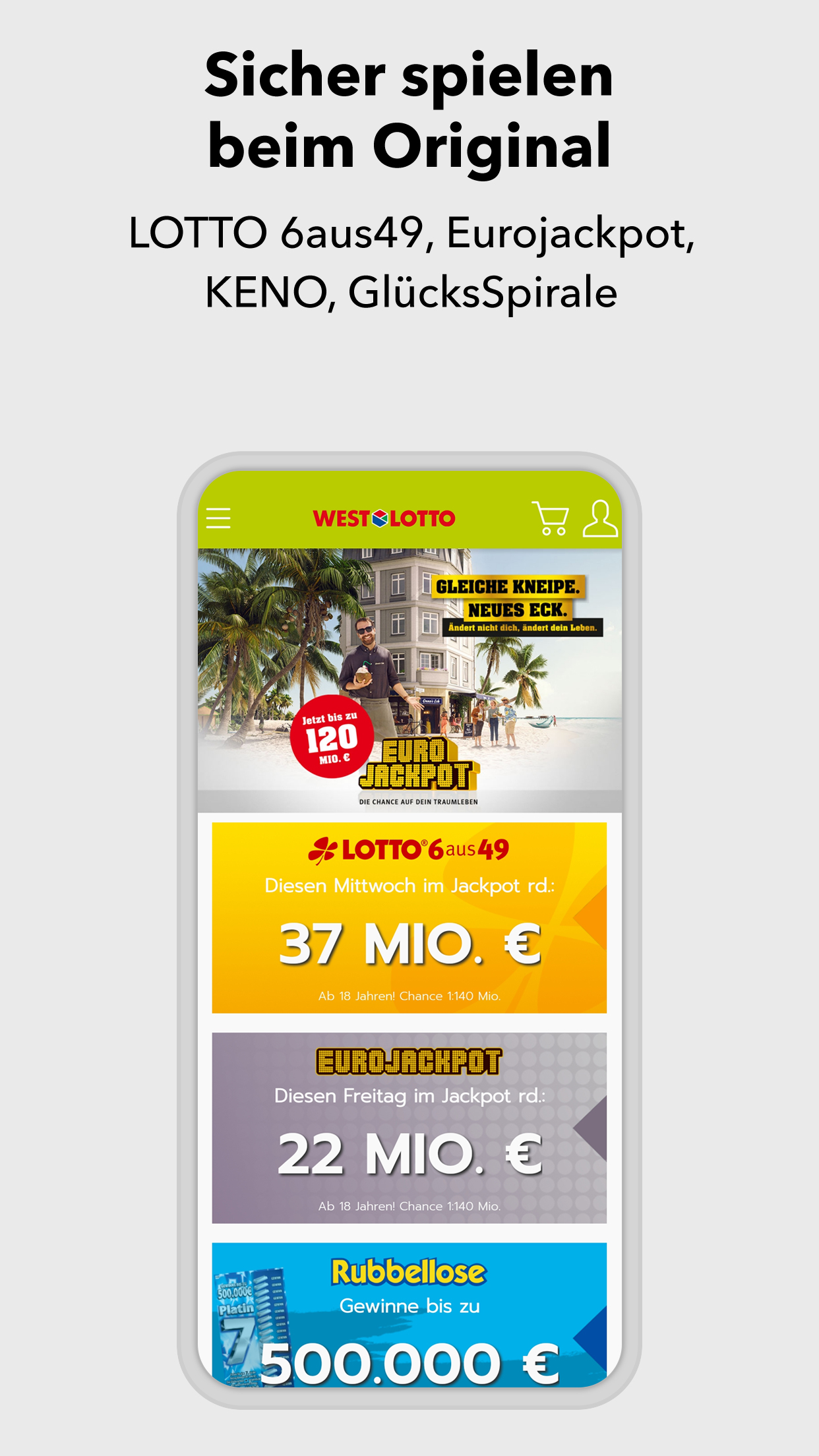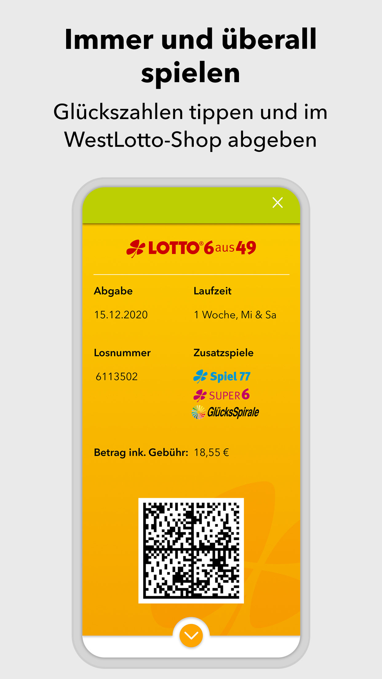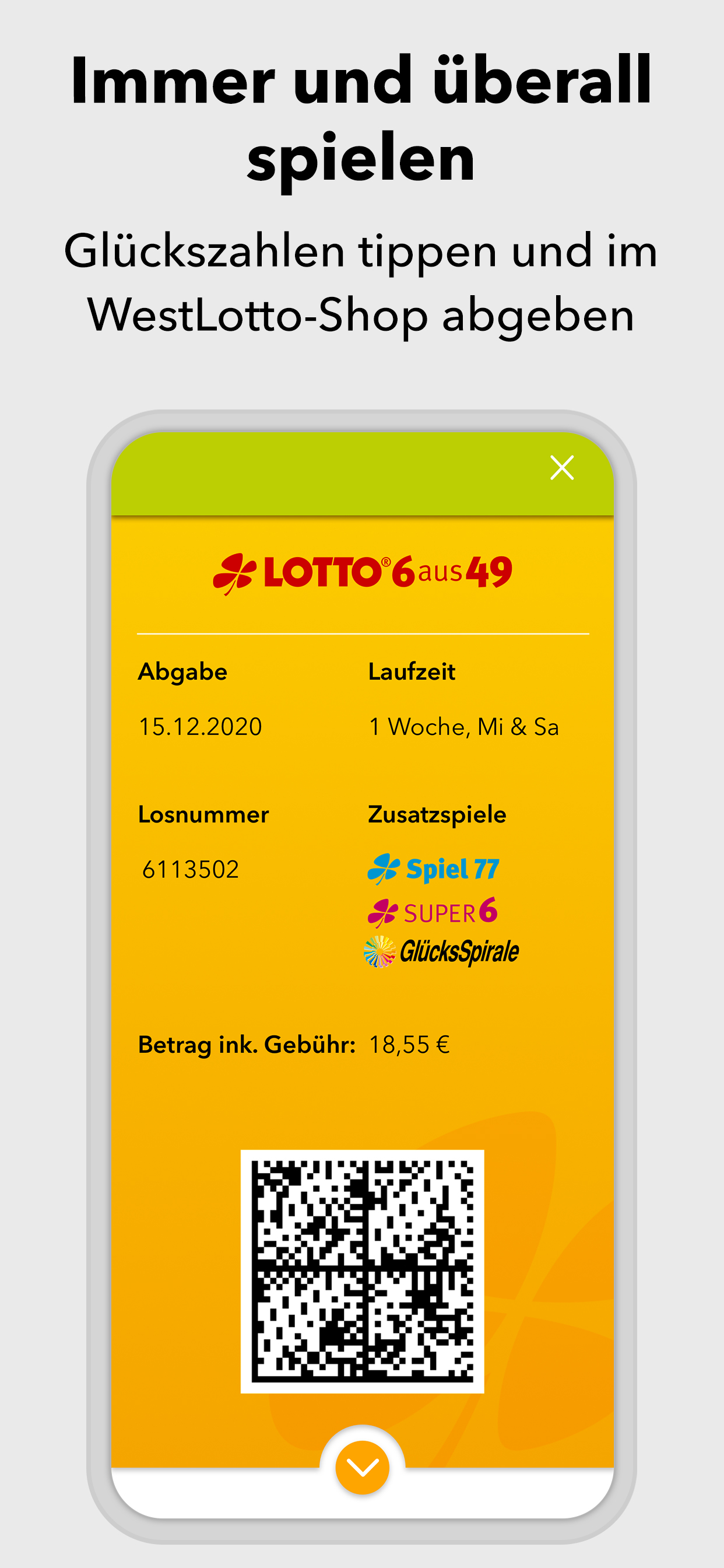 *App geht’s: sicher spielen - einfach online* Du liebst den Spielspaß beim Original? Herzlich willkommen! In der WestLotto-App findest du LOTTO 6aus49, Eurojackpot, KENO, GlücksSpirale und die Zusatzlotterien Spiel 77, SUPER 6 und plus 5. Wähle einfach die gewünschte Lotterie, tippe deine Glückszahlen und gib den Spielschein direkt in der App ab. *Alle Ergebnisse schnell zur Hand* Für alle Lotterien, die WestLotto anbietet, kannst du in der App die Gewinnzahlen und Quoten abrufen – und zwar nicht nur für die aktuelle Ziehung, sondern auch für alle Ziehungen der vergangenen Jahre. *Gewonnen? Die App zeigt es dir!* Ob du gewonnen hast oder nicht, zeigt dir unsere WestLotto-App: Hast du deinen Spielschein online abgegeben, werden deine Gewinne in der App angezeigt. Herkömmliche Spielquittungen kannst du mit der App ganz einfach prüfen: Barcode auf der Spielquittung einscannen – und du erhältst sofort eine Auswertung deiner Tipps. *Ganz lässig in der Annahmestelle spielen* Old school ist auch cool: Du gibst deinen Spielschein lieber in einer WestLotto-Annahmestelle ab? Geht klar. Auf dem Weg dorthin kannst du deinen Spielschein in der App ausfüllen und ganz lässig in einer Annahmestelle abgeben. Einfach den Barcode vorzeigen und du bekommst wie gewohnt deine Spielquittung. Hast du eine WestLotto-Karte? Gut gemacht! Die kannst du mit der App einscannen. Damit hast du eine digitale Kundenkarte, die du immer dabei hast und in der Annahmestelle vorzeigen kannst. Und das mit einem gewinnenden Lächeln. *Sicherheit und Zertifizierungen* Bei allem Spaß am Spielen: Deine Sicherheit ist für uns das Wichtigste. Wir sind nach den weltweit höchsten Sicherheits- und Datenschutzrichtlinien zertifiziert. Das bedeutet für dich transparente, sichere und zuverlässige Arbeitsabläufe von der Annahme der Spielscheine bis zur Auszahlung von Gewinnen. Deine Daten werden jederzeit absolut vertrauenswürdig behandelt. 4 Millionen Kunden in der Woche vertrauen WestLotto. Das macht uns in Nordrhein-Westfalen zu Deutschlands größtem staatlichen Lotterieanbieter. *Kundenservice* Du hast Fragen? Wir helfen dir gern: Unser Kundenservice ist von Montag bis Samstag von 08:00 Uhr bis 21:00 Uhr unter der kostenlosen Hotline 0800 401 4040 für dich da. ***AUFGEPASST, WICHTIG!*** Also nochmal kurz Klartext: Spielteilnahme erst ab 18 Jahren und nur für Kunden aus NRW! Hilfe und Beratung bei glücksspielbezogenen Problemen auf www.check-dein-spiel.de und kostenlos unter 0800 1372700 (BZgA). Für die Online-Scheinabgabe ist eine Registrierung auf westlotto.de erforderlich. Alle weiteren Funktionen der App können auch ohne Online-Registrierung genutzt werden. So, jetzt aber: App laden, Spaß haben, Daumen drücken. Wir wünschen dir viel Glück!***