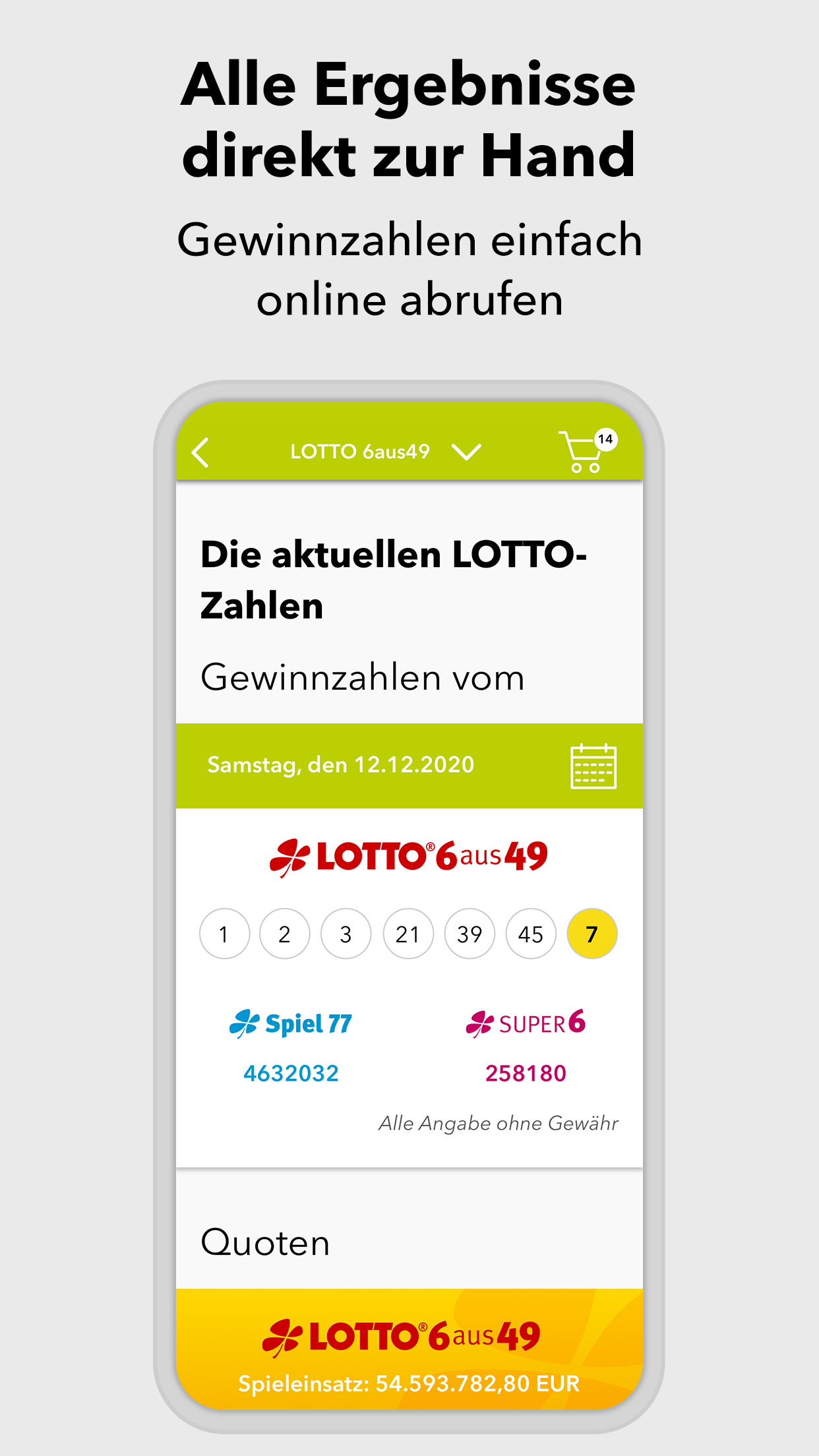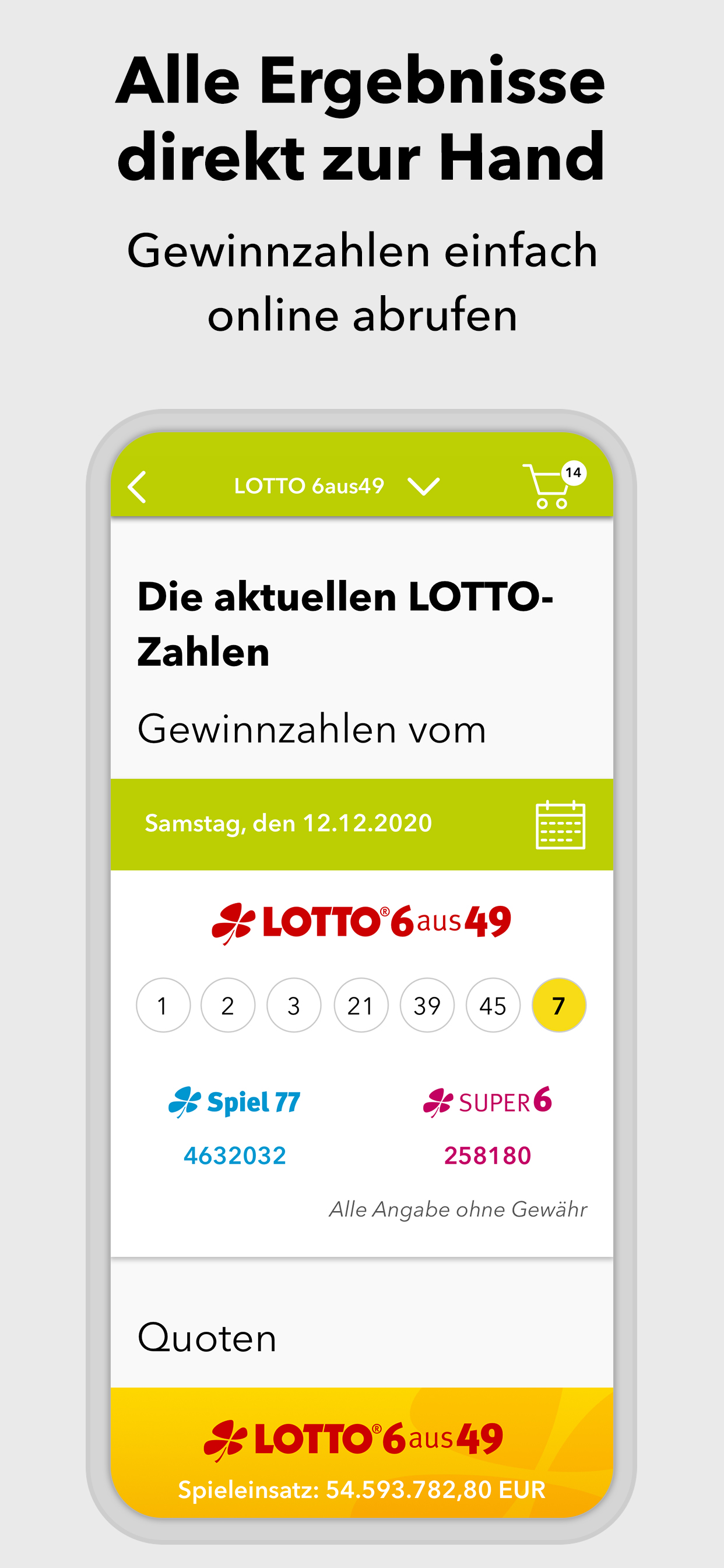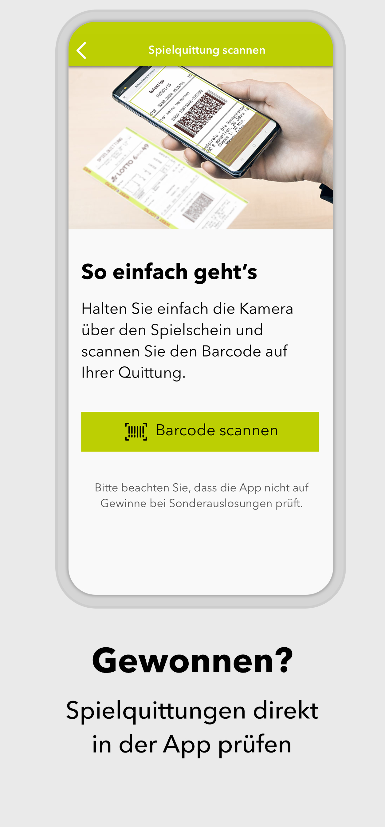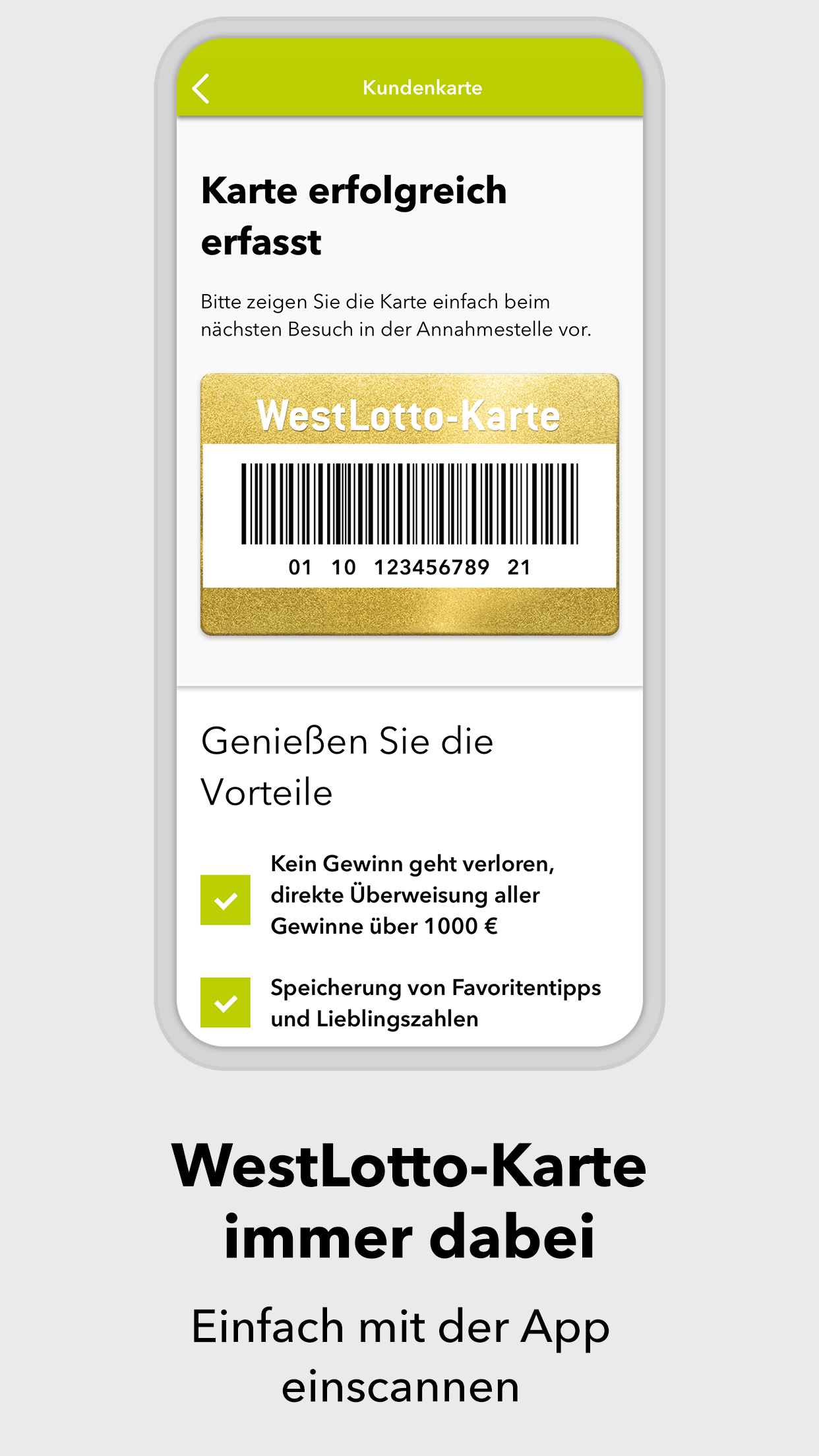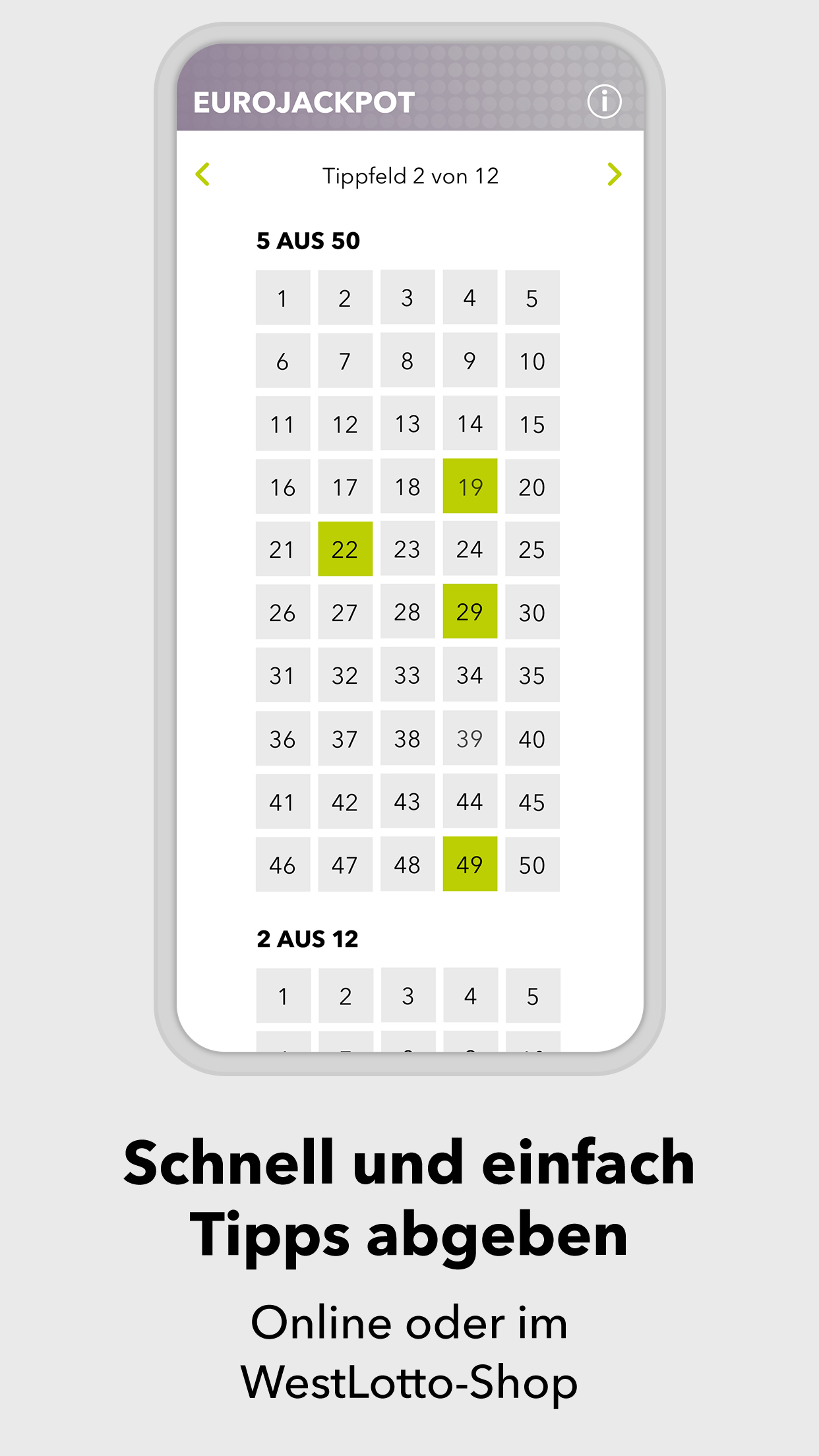 *App geht’s: sicher spielen - einfach online* Du liebst den Spielspaß beim Original? Herzlich willkommen! In der WestLotto-App findest du LOTTO 6aus49, Eurojackpot, KENO, GlücksSpirale und die Zusatzlotterien Spiel 77, SUPER 6 und plus 5. Wähle einfach die gewünschte Lotterie, tippe deine Glückszahlen und gib den Spielschein direkt in der App ab. *Alle Ergebnisse schnell zur Hand* Für alle Lotterien, die WestLotto anbietet, kannst du in der App die Gewinnzahlen und Quoten abrufen – und zwar nicht nur für die aktuelle Ziehung, sondern auch für alle Ziehungen der vergangenen Jahre. *Gewonnen? Die App zeigt es dir!* Ob du gewonnen hast oder nicht, zeigt dir unsere WestLotto-App: Hast du deinen Spielschein online abgegeben, werden deine Gewinne in der App angezeigt. Herkömmliche Spielquittungen kannst du mit der App ganz einfach prüfen: Barcode auf der Spielquittung einscannen – und du erhältst sofort eine Auswertung deiner Tipps. *Ganz lässig in der Annahmestelle spielen* Old school ist auch cool: Du gibst deinen Spielschein lieber in einer WestLotto-Annahmestelle ab? Geht klar. Auf dem Weg dorthin kannst du deinen Spielschein in der App ausfüllen und ganz lässig in einer Annahmestelle abgeben. Einfach den Barcode vorzeigen und du bekommst wie gewohnt deine Spielquittung. Hast du eine WestLotto-Karte? Gut gemacht! Die kannst du mit der App einscannen. Damit hast du eine digitale Kundenkarte, die du immer dabei hast und in der Annahmestelle vorzeigen kannst. Und das mit einem gewinnenden Lächeln. *Sicherheit und Zertifizierungen* Bei allem Spaß am Spielen: Deine Sicherheit ist für uns das Wichtigste. Wir sind nach den weltweit höchsten Sicherheits- und Datenschutzrichtlinien zertifiziert. Das bedeutet für dich transparente, sichere und zuverlässige Arbeitsabläufe von der Annahme der Spielscheine bis zur Auszahlung von Gewinnen. Deine Daten werden jederzeit absolut vertrauenswürdig behandelt. 4 Millionen Kunden in der Woche vertrauen WestLotto. Das macht uns in Nordrhein-Westfalen zu Deutschlands größtem staatlichen Lotterieanbieter. *Kundenservice* Du hast Fragen? Wir helfen dir gern: Unser Kundenservice ist von Montag bis Samstag von 08:00 Uhr bis 21:00 Uhr unter der kostenlosen Hotline 0800 401 4040 für dich da. ***AUFGEPASST, WICHTIG!*** Also nochmal kurz Klartext: Spielteilnahme erst ab 18 Jahren und nur für Kunden aus NRW! Hilfe und Beratung bei glücksspielbezogenen Problemen auf www.check-dein-spiel.de und kostenlos unter 0800 1372700 (BZgA). Für die Online-Scheinabgabe ist eine Registrierung auf westlotto.de erforderlich. Alle weiteren Funktionen der App können auch ohne Online-Registrierung genutzt werden. So, jetzt aber: App laden, Spaß haben, Daumen drücken. Wir wünschen dir viel Glück!***