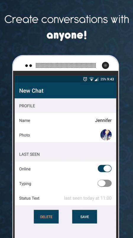 - Create fake chats with anyone (even Trump)! - 1:1 mirror image of the real deal, your friends won't know if it's fake! - Control both sides of the conversation - Alter every single detail in the conversation - Send & Receive fake media messages - Send & Receive fake voice messages - Edit last seen, online, and typing statuses. - Edit sent, delivered, read message statuses. - And a lot more fun stuff! -It's super easy to make your ex jealous!