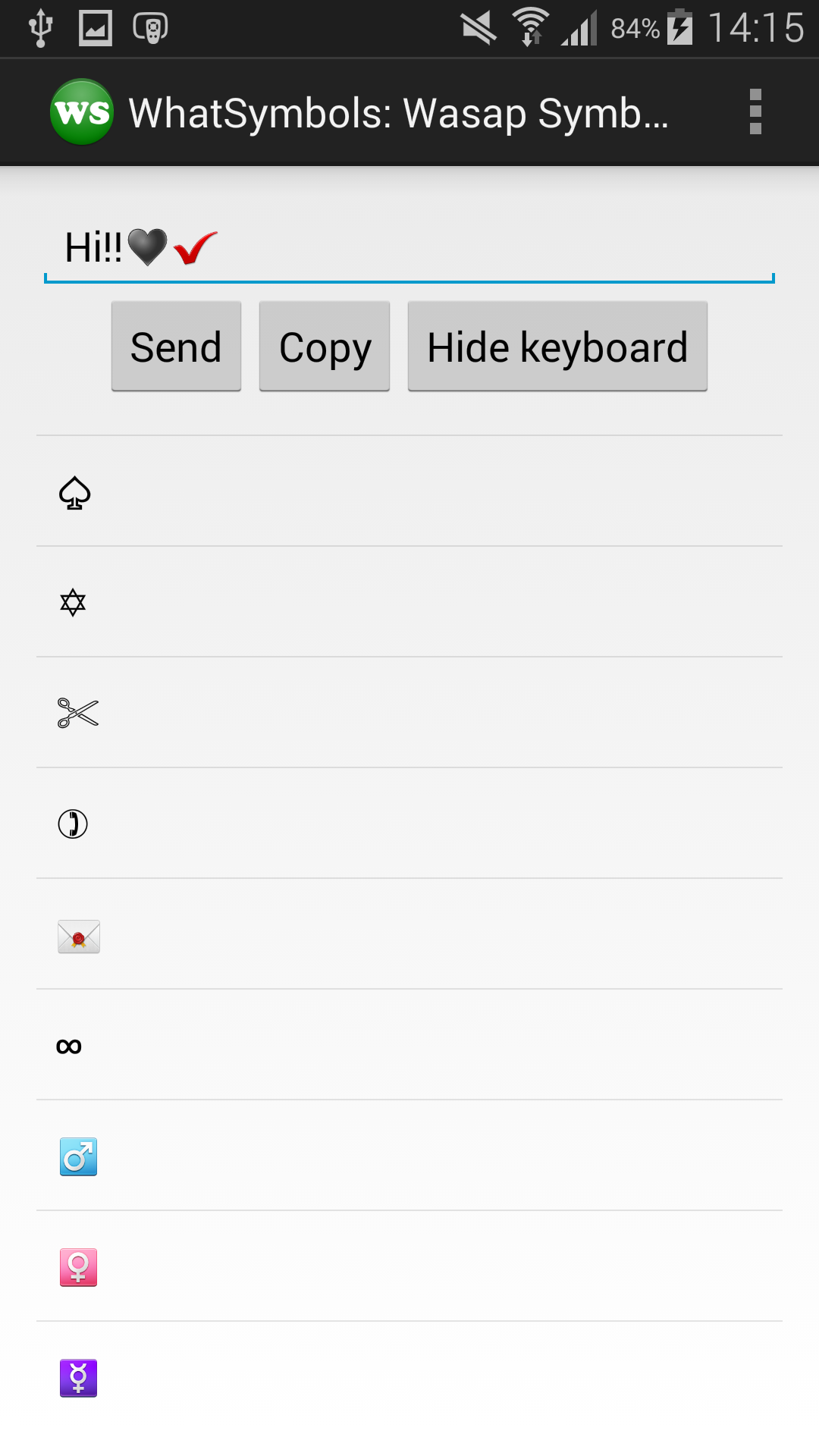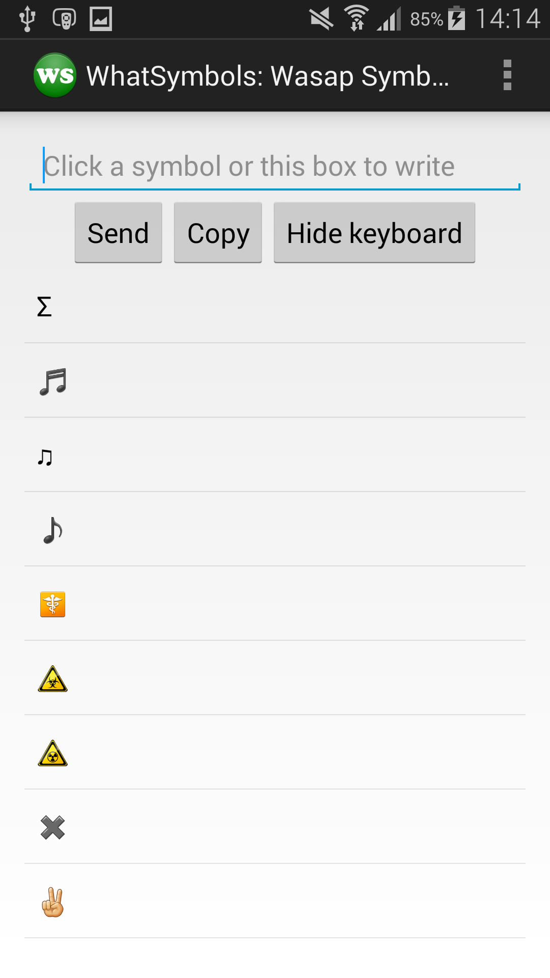 WhatSymbols: Wasap Symbols (Package Name: com.jotandroid.symbols) is developed by Jotandroid and the latest version of WhatSymbols: Wasap Symbols 2.3 was updated on September 18, 2014. WhatSymbols: Wasap Symbols is in the category of Personalization. You can check all apps from the developer of WhatSymbols: Wasap Symbols. Currently this app is for free. This app can be downloaded on Android 2.2+ on APKFab or Google Play. All APK/XAPK files on APKFab.com are original and 100% safe with fast download.