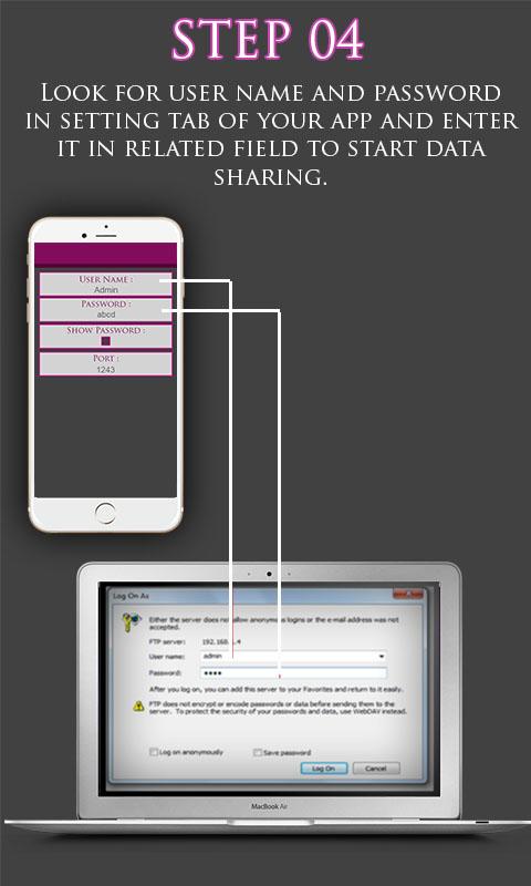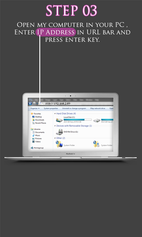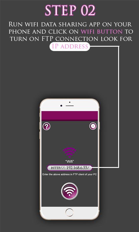 we believe the greatest sharing is among WiFi buddies -- family, friends, co-workers,Relatives,side room mates,class mates,hostel mates, who are already on the same local network. No emailing, no fumbling for a special cable, no hunting for a USB stick. And you don't burn up precious wireless bandwidth! Magic! Just Run WiFi File Transfer which lets you upload and download files to/from your phone or tablet over a wireless connection. This app provides the following features ::Upload or download multiple files at once ::Upload entire folder structures ::Delete, rename, copy, zip or unzip files ::Password authentication (optional) ::Shortcuts to photo, video and music directories ::Best of all, the app runs as a service, so you can keep doing anything else on your phone while files transfer. ::This gives you full access to the files on your device, including internal memory and the SD card. Preparation steps: Make sure you have your own local WiFi network ready Connect your computer to your WiFi network. Connect your Phone/Tablet to your WiFi network. Start the app on your phone. click on the WiFi Icon. note the IP address it gives you. type the address in the my computer explorer bar. type the username and password. start file transferring. Hope you will enjoy the app........