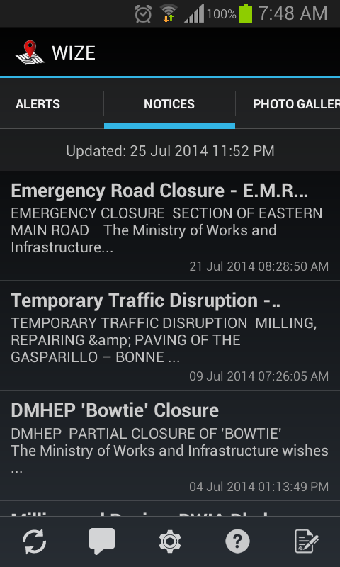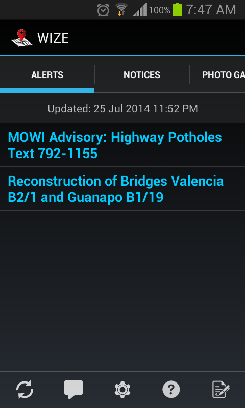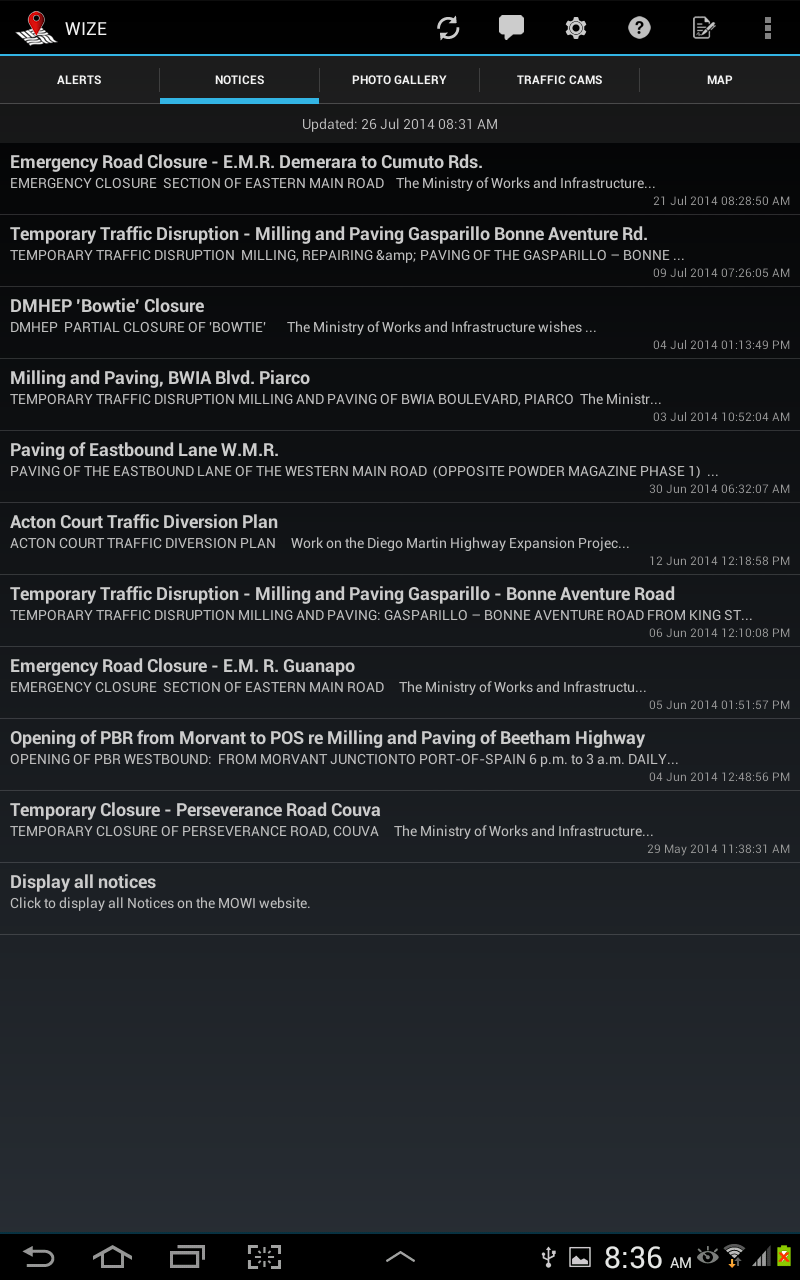 The WIZE (Works Information Zone Electronic-Portal) Mobile App is an initiative of the Ministry of Works and Transport (MOWT), Trinidad and Tobago. It is designed to provide an avenue for bi-directional communication between the ministry and the citizens of Trinidad and Tobago. Particularly so as MOWT provides an array of infrastructural projects such as highway extensions, road rehabilitation, bridge reconstruction, traffic management measures, building construction and coastal erosion among other air, land and sea services in the fulfilment of is mandate. Benefits of the WIZE APP As a result of the aforementioned services, MOWT anticipates that the WIZE APP will provide the following benefits among others:- •To increase accessibility and convenience to information on infrastructural services performed by the Ministry to the public •To improve safety to motorists and pedestrian Additionally, the WIZE app’s features also offer three major benefits to users:-- •To informs users of upcoming infrastructural works •To allow users time to prepare ahead of infrastructure works (to reschedule arrivals, departures and/ or traffic routes •To allow users to report various issues (broken traffic lights, cable barriers etc) Features and Benefits *Users of the app have access to alerts, notices, photo galleries and an interactive map. Proximity alerts are included to notify users of various works being carried out by the ministry (e.g. road works, bridge reconstruction, etc.). *The Report Issue feature of the app allows the public to report various road issues such as potholes, landslips, etc. *An Android app widget is included with the app. This widget will display the titles of the latest notices and indicate when new data is available for download. *An additional feature, which will come on stream later, will allow users to view a live feed of traffic at strategic points on the nation's highways. For further details on the WIZE App (FAQ’s & User Guide), visit the Ministry of Works and Transport’s website: www.mowt.gov.tt We hope that this new avenue of communication will greatly support the ministry's efforts to serve the public of Trinidad and Tobago. .............................................................. Download the WIZE App !!! Wizen Up on all infrastructure notices, projects so as to be informed and engage in pre-trip planning W - The W refers to infrastructural Works in MOWT’s and the type as well that is , Road works traffic Changes - emergency conditions I - The I represents information which can be retrieved via the ministry’s Website and Social Media Channels Z- The Zone refers to all the areas where road works are currently being undertaken across the country E- The E represents the application which is electronically based and serves as an E- Portal for all citizens