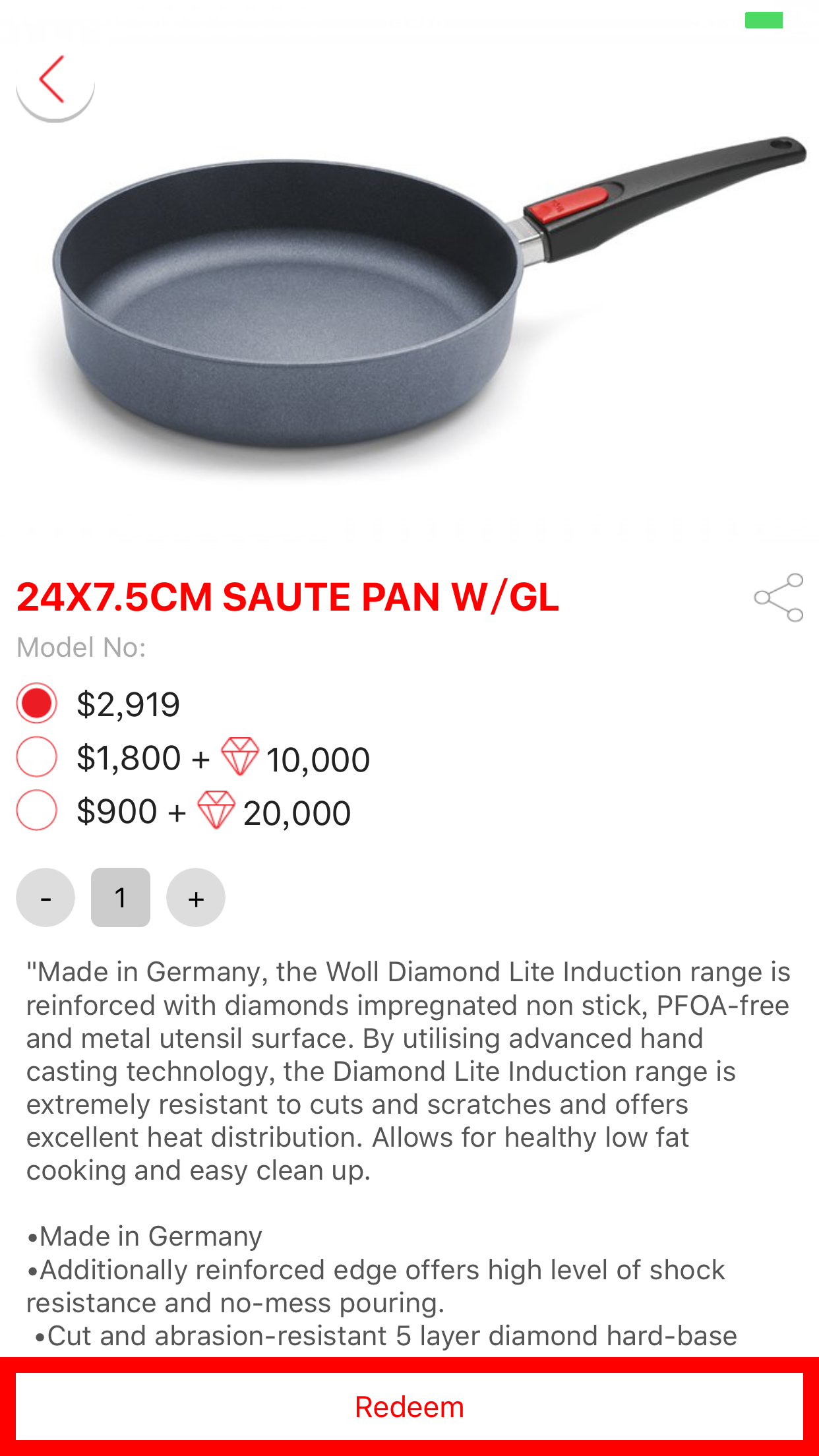 WOLL diamond cookware, 100% made in Germany WOLL is a mobile platform which aims to promote a brand new diamond healthy cooking concept, to share knowledge of healthy cooking and family cooking ideas. Our members can also get exclusive redemption discount for our WOLL German cookware and various high-quality Europe/American kitchenware. Professional Europe/American kitchenware collection: The most important part in modern family life is healthy eating, cooking method and kitchenware are necessary element to achieve this. Here we have range of high-quality cookware collection: WOLL diamond woks, pots and pans which are 100% made in Germany; high-quality knives from Germany brand Triangle; ZYLISS multifunctional kitchen utensil set from Switzerland; Epicurean cutting boards from American; Full Circle environmentally friendly cleaning tools from America...etc. Get diamond points ▪ Enjoy huge discount offer ▪ Build up a five-star kitchen: Various ways to get free diamond points and WOLL badge points. You can get diamond points by just register as our member, share healthy cooking articles to friends, publish post in our feed section, participate in different activities or purchasing in any I Love Kitchen shops. Your Accumulated diamond points or badge points can be used to bid specific cookware with price discount up to 50% or even more. Don't miss this great opportunity to build-up a brand new and five-star kitchen! Create a fans group: Just Let your talent run wild! whether you are a food columnist, cooking expert, master chef, gourmet food collector, food photography or creative writing master..." feed" section is the best stage to perform your talents, by publishing images and gained knowledge of healthy cooking, you can build-up you own fans base, get more fans like and gain popularity. The Next network Cooking Star could be you! App content: [Healthy Cooking] We have regularly update content in this "Healthy Cooking" section about healthy cooking and healthy living. From choosing ingredients→ choosing cookware→ maintenance knowledge of cookware→ cooking skills and tips→ recommendation about health and delicious recipes→ family cooking→ boundless cooking joy, advocate the concept of healthy cooking and healthy living. You can get free diamand points for share posts to your friends in this section . [Feed] By uploading images and text, share your own and other member's unique recipes and cooking tips. You will become a cooking-pro altogether with other members with interactive learning and competition. After our quality approval, members will be rewarded by diamond points for high-quality post . Publish more feed and the chance to get more diamond points will be bigger. [Redemption Center] After gathering point from "Healthy Cooking" and "Feed" section, your Accumulated diamond points or badge points can be used to bid our WOLL diamond woks, pots and pans or other specific kitchenware with price discount up to 50% or even more. 【My account】 You can trace back your own redemption, event enrollment, warranty registration and posted feed records in this section. [My Account - registration activities] After purchasing our Germany WOLL cookware, you can enroll our "WOLL Classroom - Advanced Cooking Course" free of charge. Host by Hong Kong famous cooking expert and food columnist Queen Truffles, Esther Au, she will explain correct ways to maintain our WOLL cookware in good condition and teach you tips and methods in dealing with various homemade recipes. [My Account - Warranty Registration] Members with WOLL Warranty Card can register the cookware maintenance in this section and enjoy our high quality maintenance services.