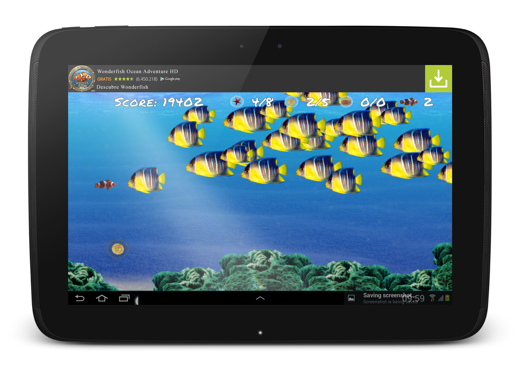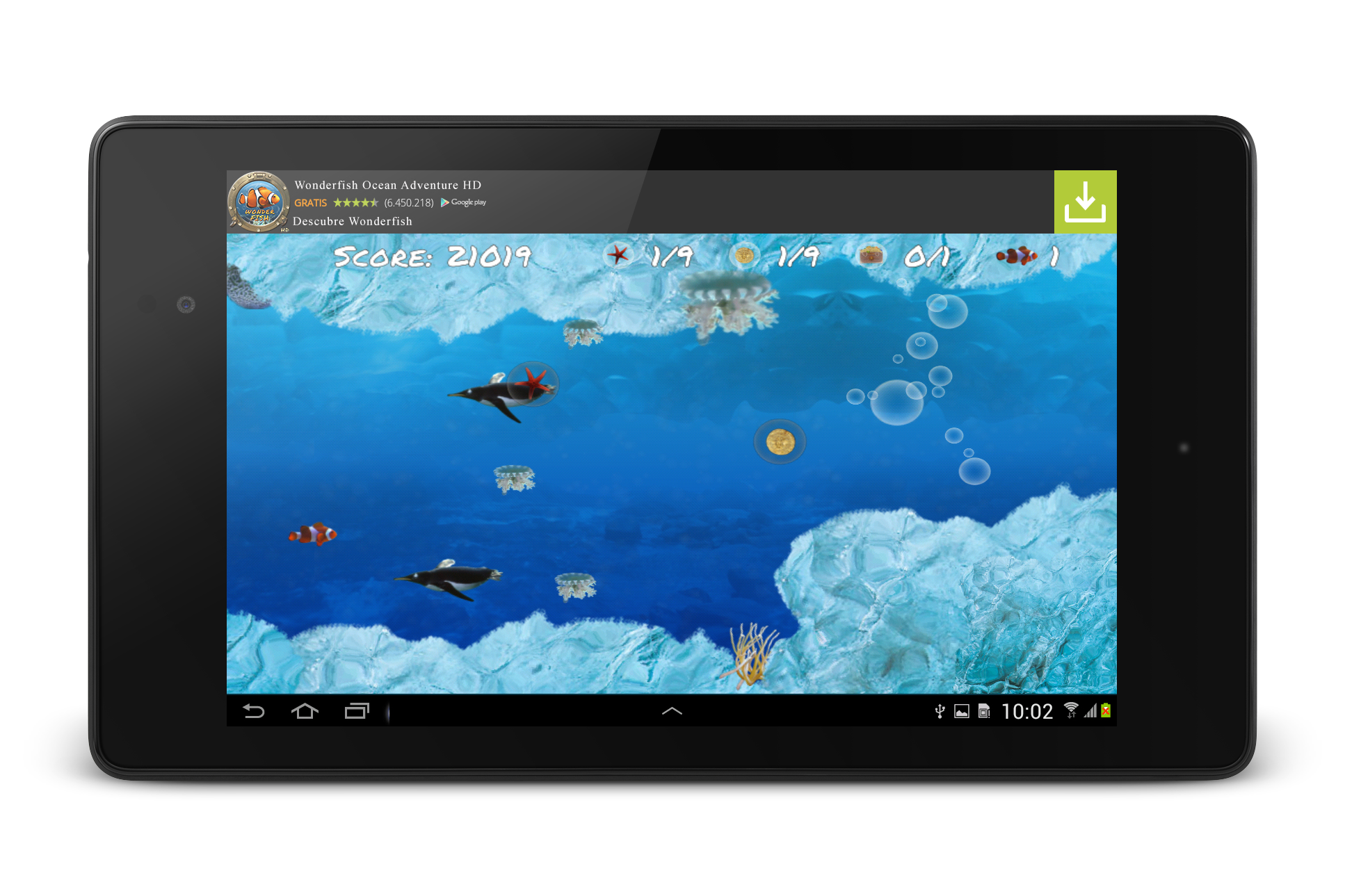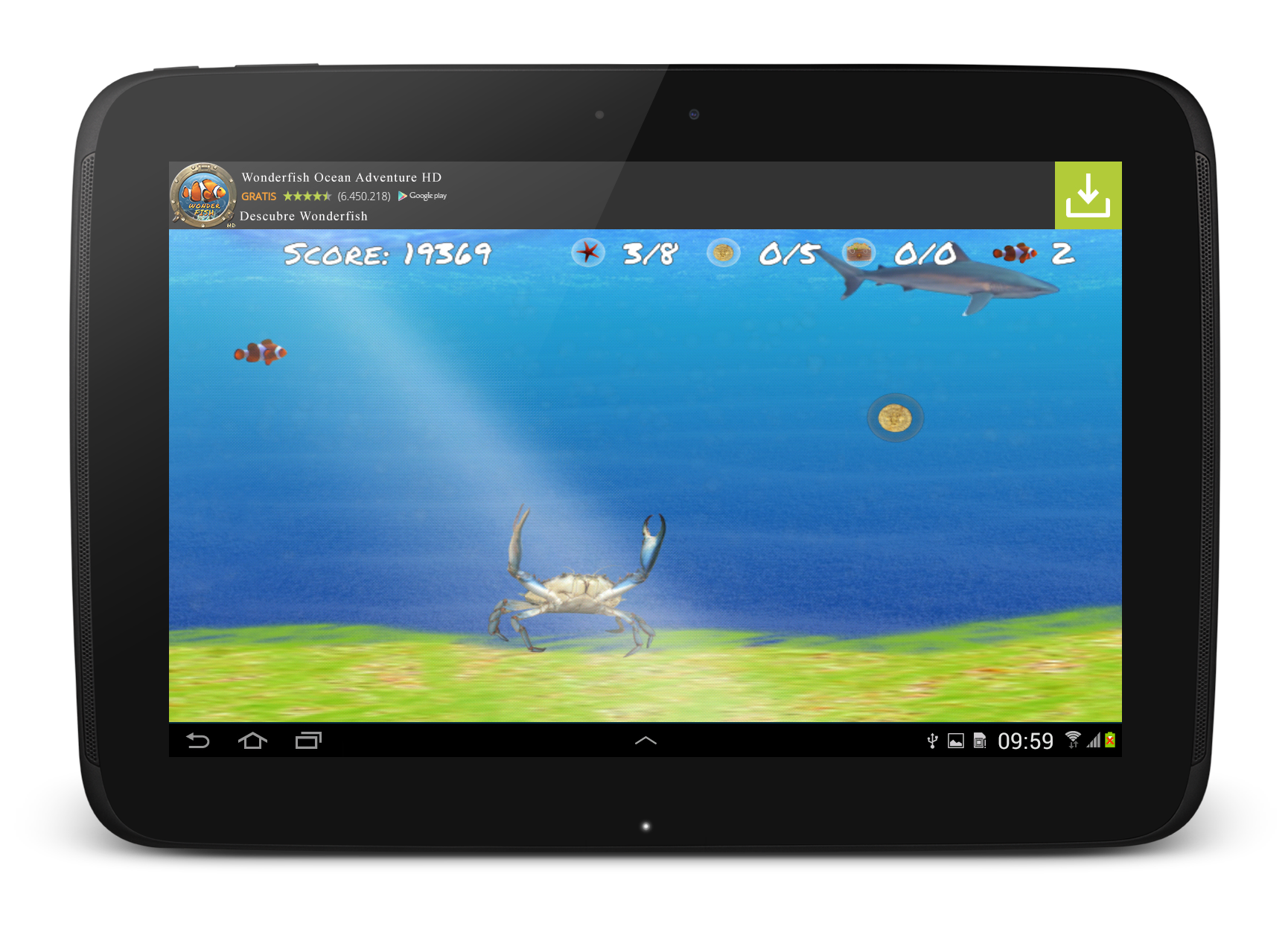 - More than 100 different enemies: crabs, whales, sharks, killer turtles, oysters, octopus... and many other kinds of fish.