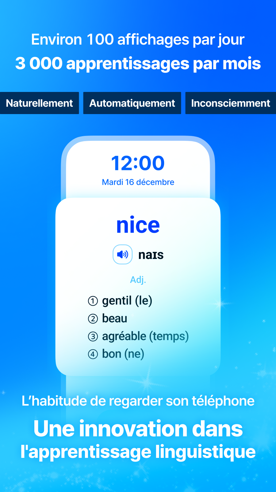 ■ Innovative study method using the lock screenWhile checking messages, watching YouTube, or simply checking the time, you can study dozens of words and phrases a day! This will accumulate more than a thousand words per month, and you'll learn automatically and subconsciously.
