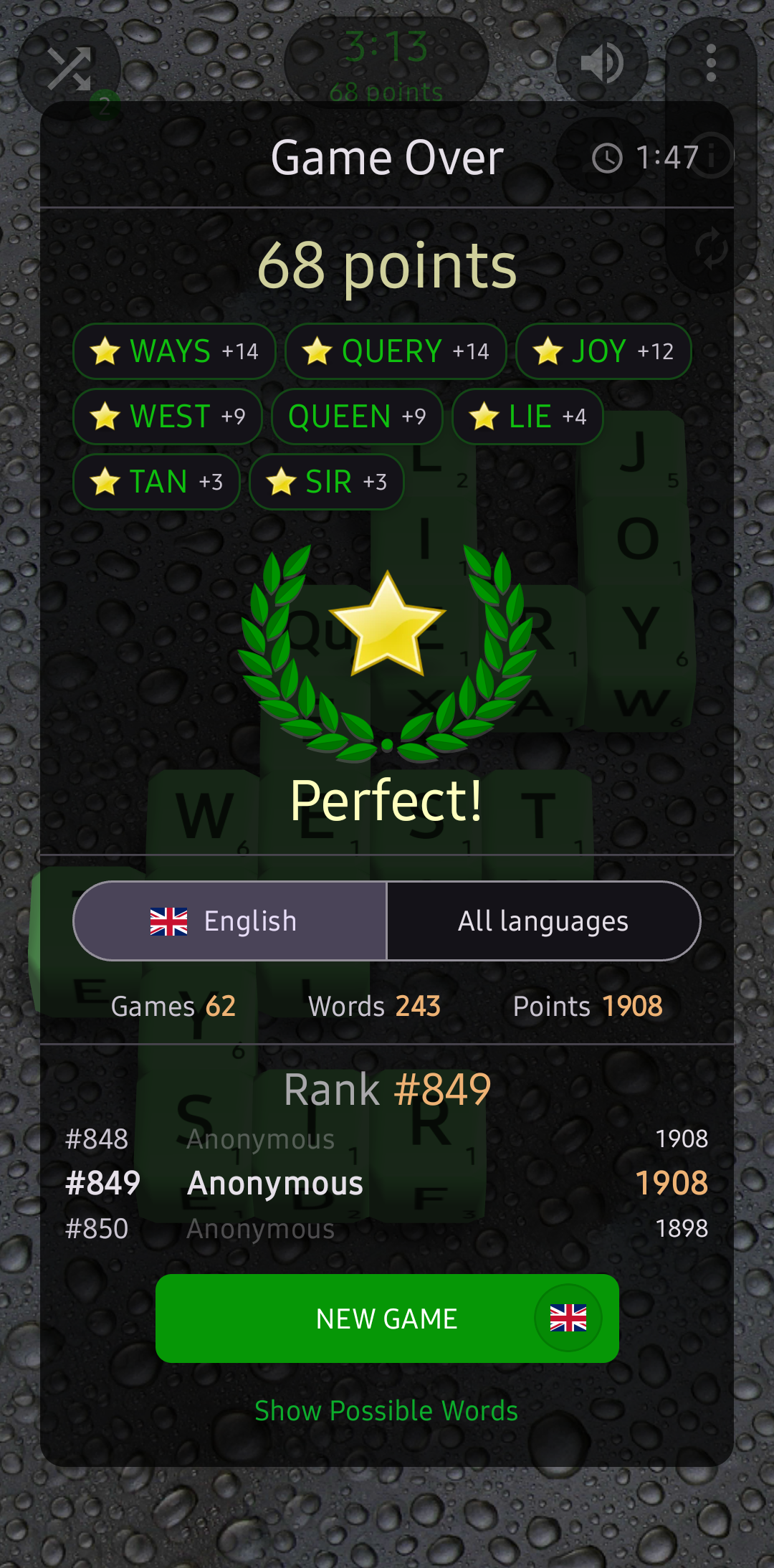 WordMix is a fun and addictive word dice game. If you like crossword puzzles and anagrams, this is just the game for you! Toss the dice and arrange the jumbled letters to form valid words, both horizontally and vertically. Try to use as many tiles as possible before the time runs out. You get points for the letters used only in correct words, for all unused letters you get minus points. Challenge yourself, and see what words you can find in each game. Rules: Form words horizontally and vertically just like in crossword puzzles! Simply move letters around by tapping on them. If you long tap on a group of letters you can move whole group. Tap on the joker to select the letter you want it to stand for. In WordMix Pro you are further allowed to swap some of your letters once per game. Points: Except for the jokers, each letter has a certain value. If a letter is part of two words it counts twice. Points for unused letters are subtracted at the end. For a word to count it must contain only green letters, so it must not cross with an incorrect word. By default all correct words have to be connected to count, but there is an option to allow separate groups of words. Available dictionaries: Czech, Dutch, English, French, German, Greek, Hungarian, Italian, Japanese, Polish, Portuguese, Romanian, Russian, Spanish, Turkish, Maths (e.g. "5*2+4=7*2"). You can easily add new words to any of the dictionaries, even during the game by long tapping on the word. You can also disable the dictionary completely. In the word list you can find all the words you ever played. The local highscore list helps you keep track of your achievements. You can also upload and compare your scores with other players in the online ranking list. Language-specific options: Some languages support specific options, like accents and other diacritics. If enabled, words must be spelled with the correct accents to be valid. Letters that allow accents are marked with "...". Tap on the letter to select the needed accent. WordMix Pro: WordMix is free of advertisement! Please upgrade to WordMix Pro to support the developers. Here is what you get extra: • 3D graphics, sounds and animations • swap letters during the game • show word suggestions during game Have fun discovering just how much of a word wiz you are!