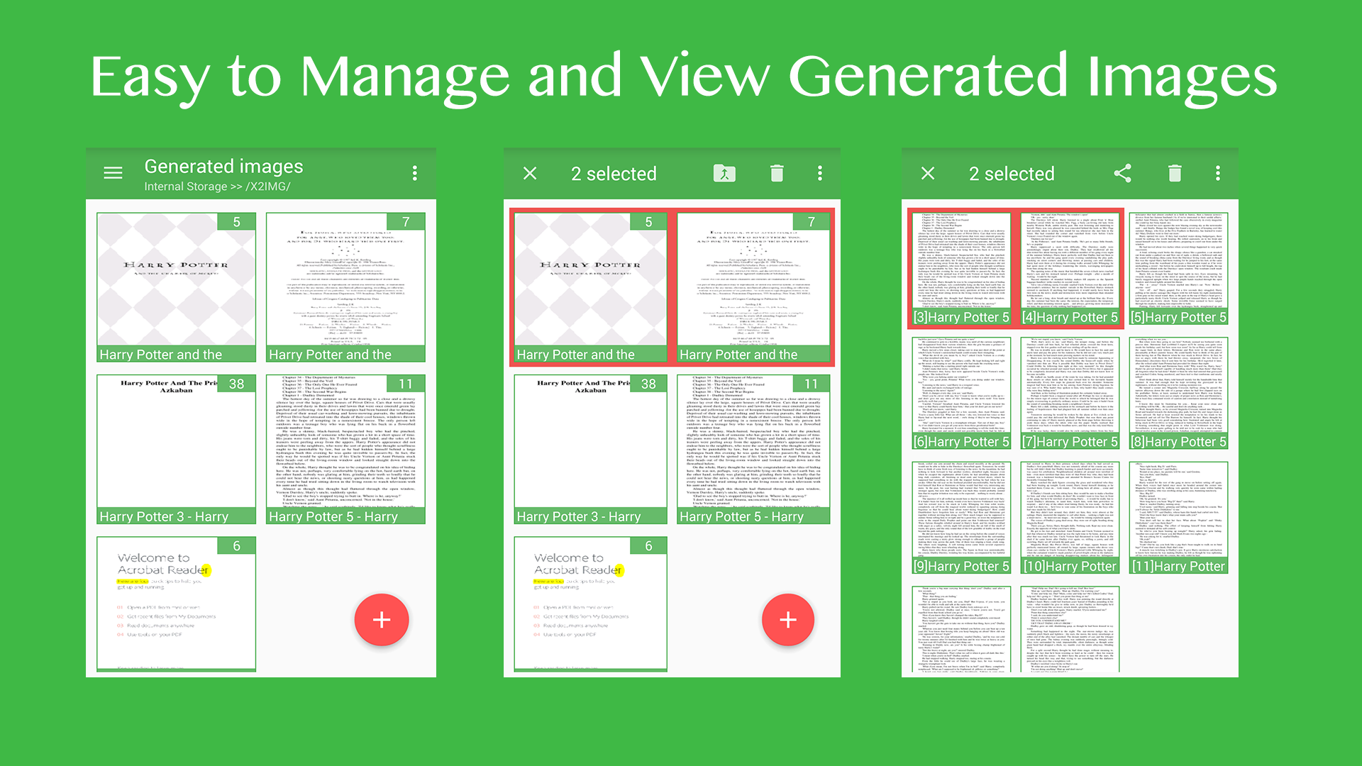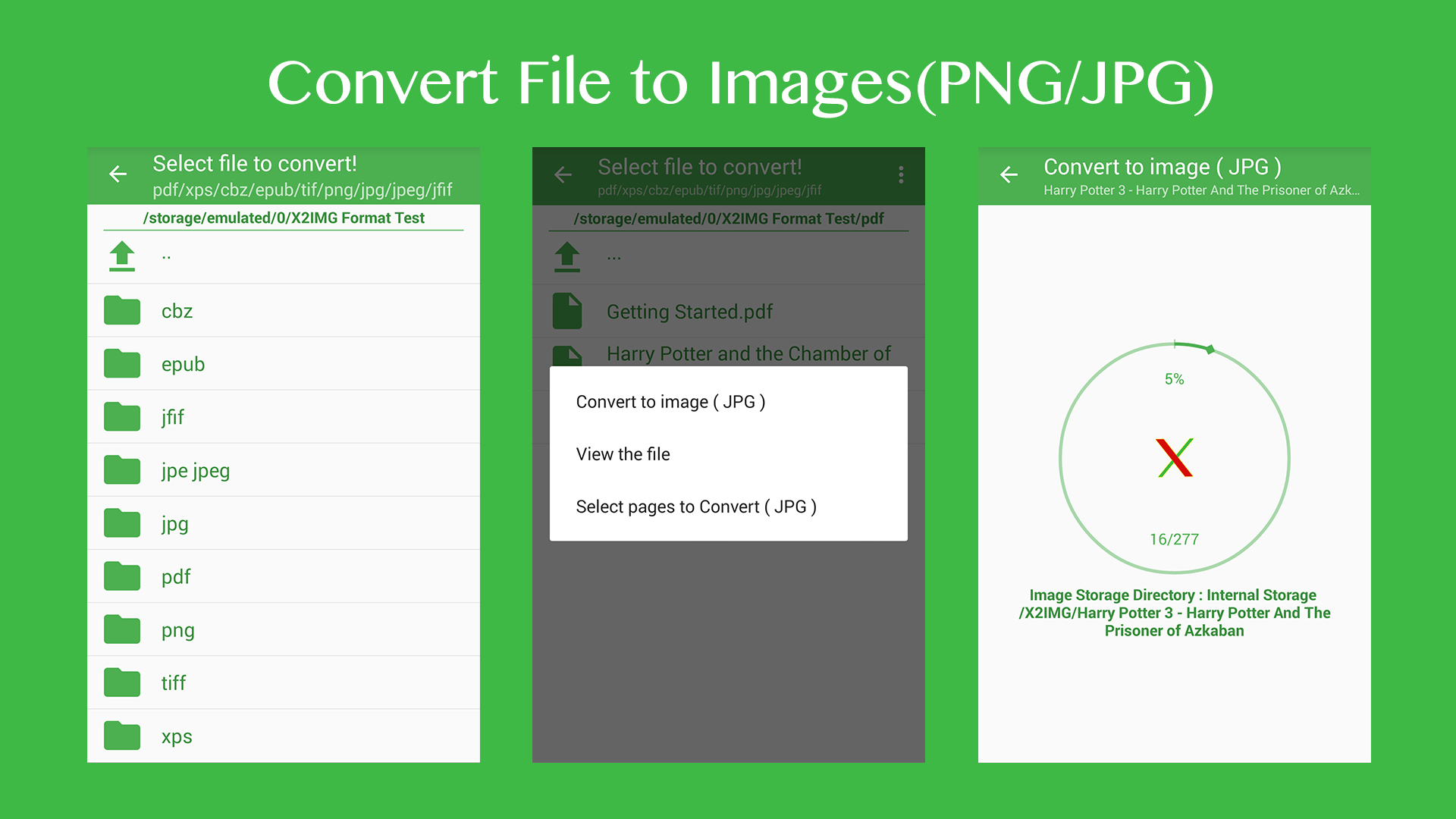 X2IMG is a cool and fast image generate application. It is used to convert other file formats to image(PNG or JPG). X2IMG also is a good tool to read and preview PDF/EPUB/CBZ/XPS file. Supported file formats: PDF, XPS , CBZ , EPUB, JPG , TIFF , PNG , JFIF. X2IMG does not change or delete the original file. All generated images are saved in the folder "/X2IMG/" on your external storage. This is a great tool for converting PDF to jpg or png, also a easy tool to manage and view images on folder "/X2IMG/" . Use X2IMG to make your life more efficient Android 6.0+, In order to make the X2IMG work, please allow X2IMG to read external storage Convertor features: - Convert PDF to JPG/PNG - Convert XPS to PNG/JPG - Convert TIFF to PNG/JPG - Convert EPUB to PNG/JPG - Convert CBZ to PNG/JPG - Convert JFIF to PNG/JPG - Convert JPG to PNG - Convert PNG to JPG File preview features: - Read and preview PDF file - Read and preview EPUB file - Read and preview CBZ file - Read and preview XPS file - Read and preview TIFF file - Jump to the page you want Other features: - Hide or show generated images in gallery or Photo Album App (Need to Reboot your device after change this option!) - Manage generated images (Multi-selection,Merge image folders,Delete images, Share images,Rename image folder and single image) - View generated images (Image zoom in/zoom out) - Sort image folders and images in folder - Long press into multi-selection and drag to select more - Set the generated JPG’s quality - File browser to select file to convert